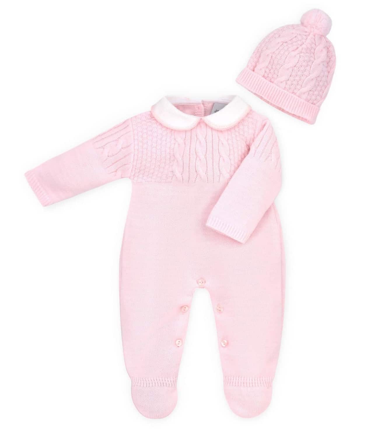 Beautiful Cable & basket weave pattern romper with Collar comes with a Cute Bobble Hat with cable knitted pattern Manufactured in Portugal for Dandelion