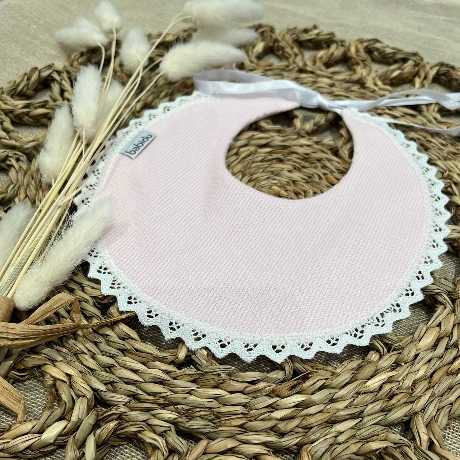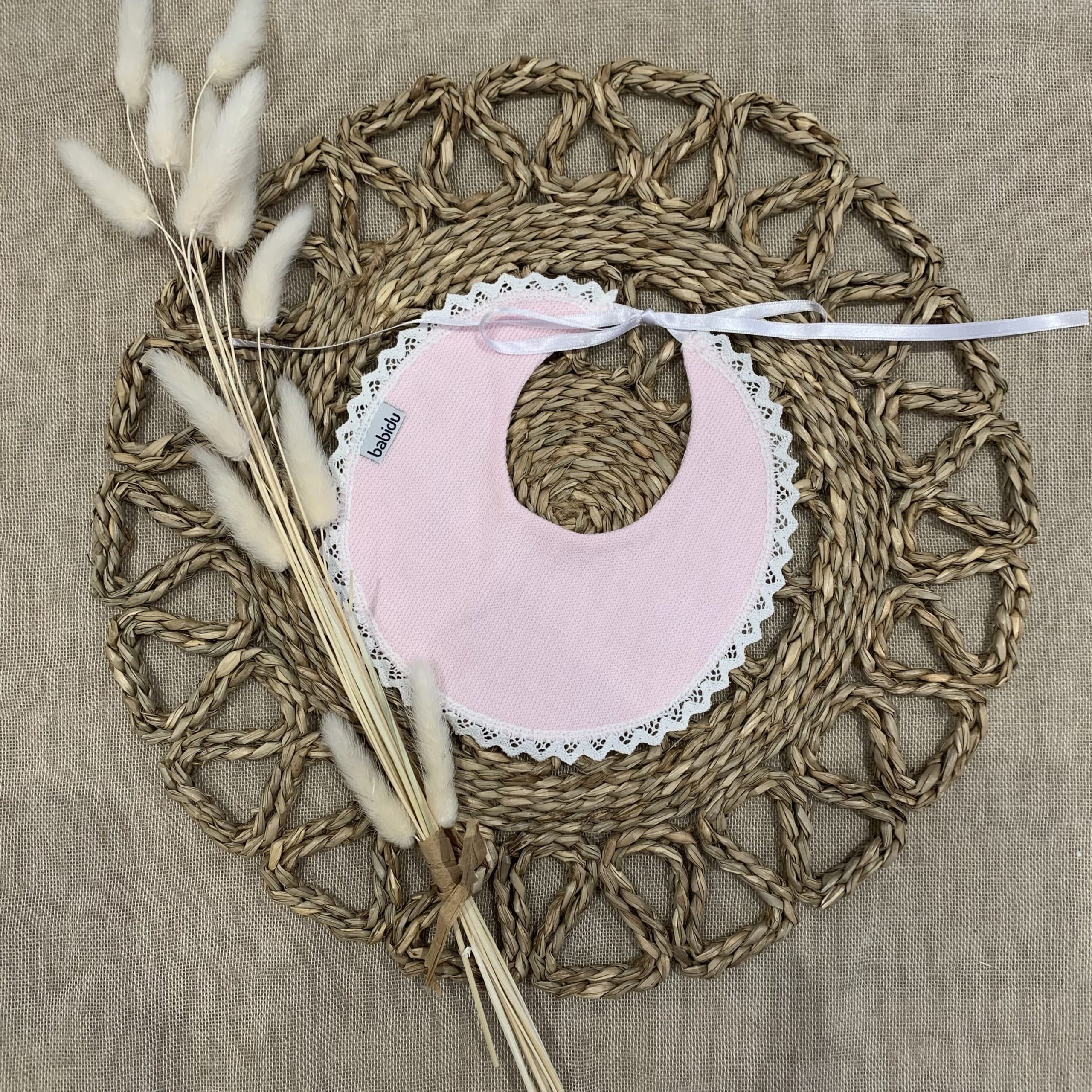 Girls Pink woven cotton baby bib from Babidu. With delicate white lace embroidery around the edges, this sweet bib fastens around the neck with a satin ribbon and the reverse side is made in soft cotton jersey.