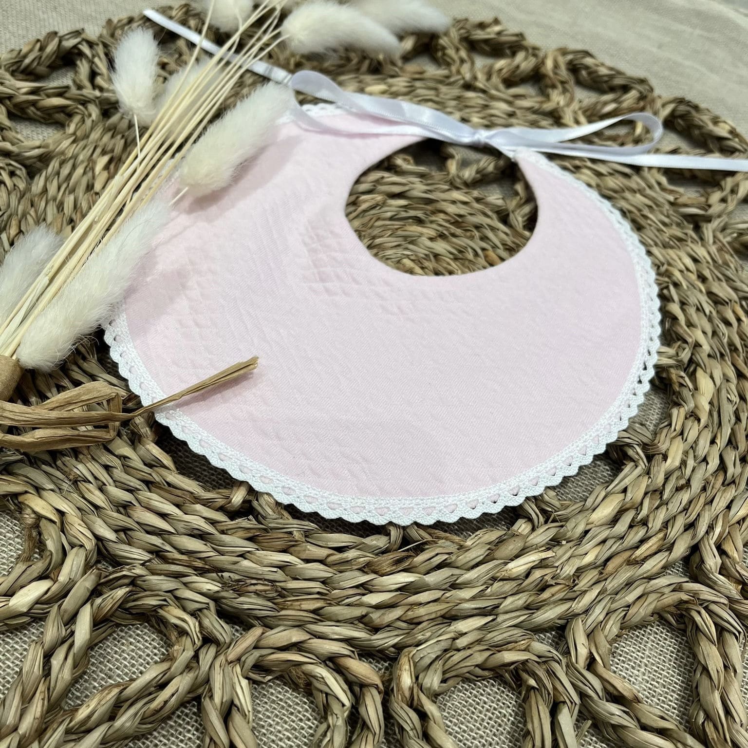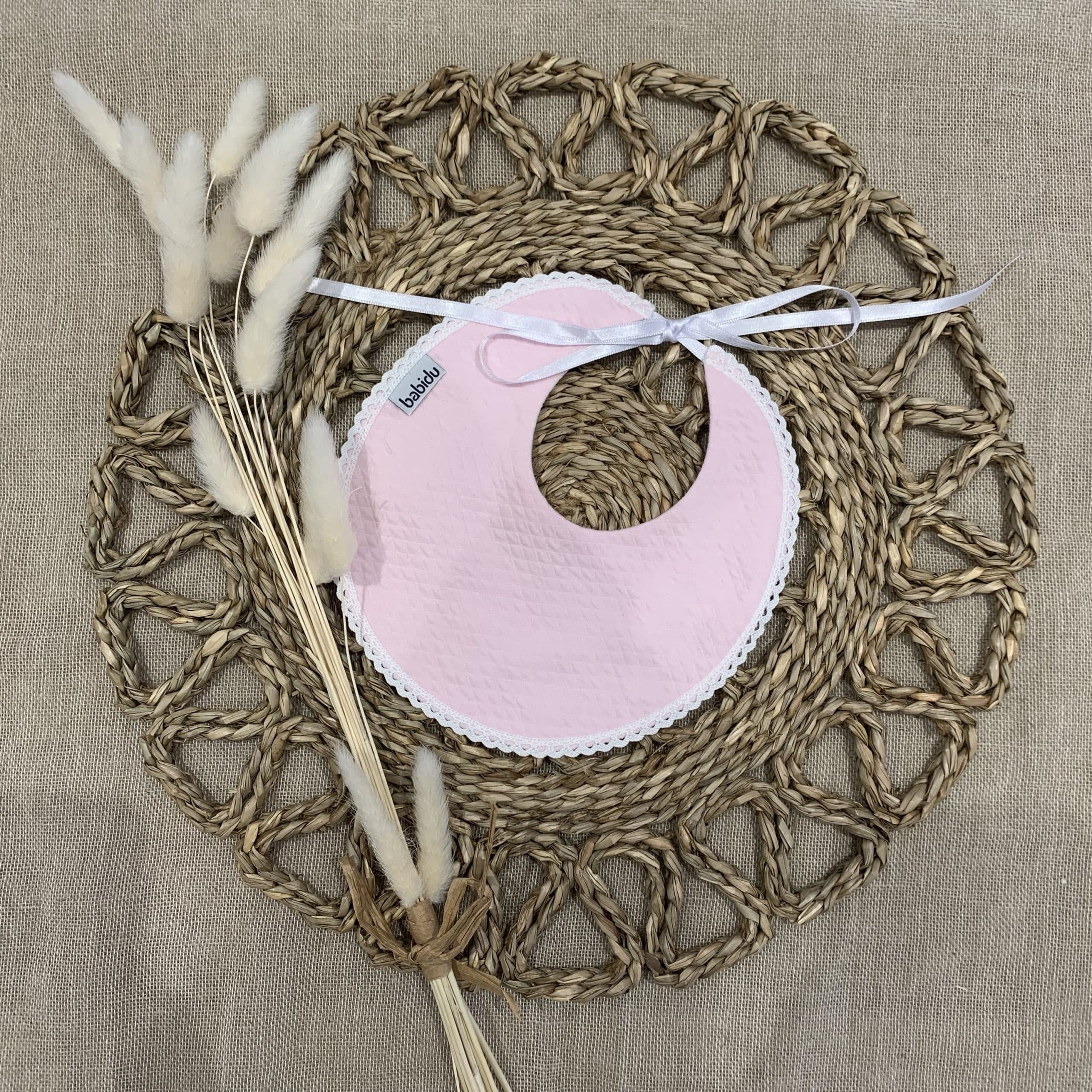 Pink woven cotton bib from Babidu, suitable for baby boys & girls. With delicate white lace embroidery around the edges, this sweet bib fastens