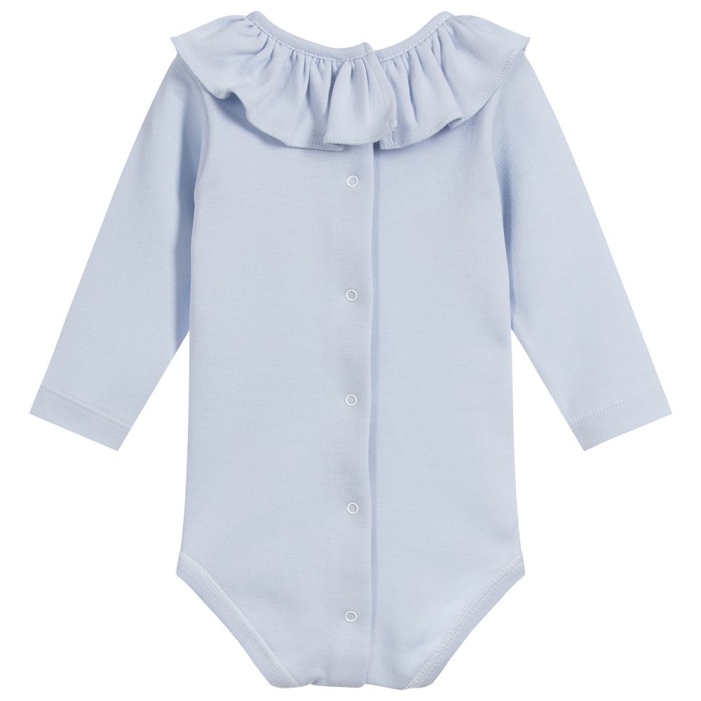 Lovely pink soft cotton jersey bodysuit for baby girls by Babidu, with ruffles around the neck. It can be worn as a top, and will always remain neatly tucked in, keeping baby's back warm.