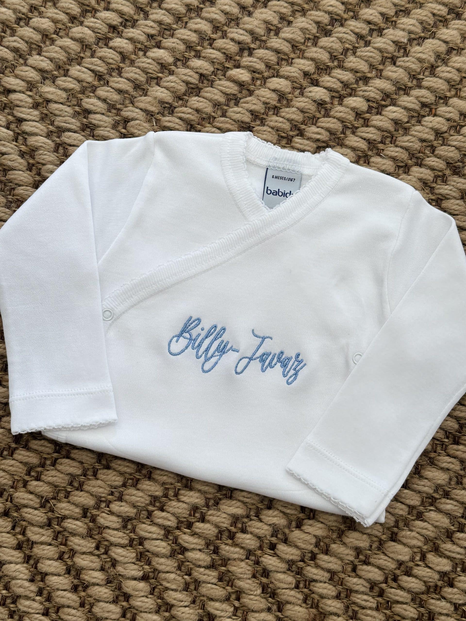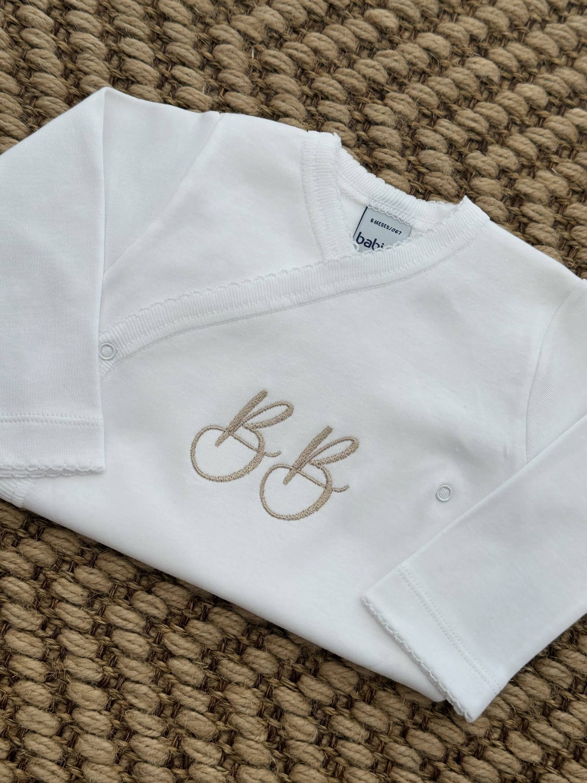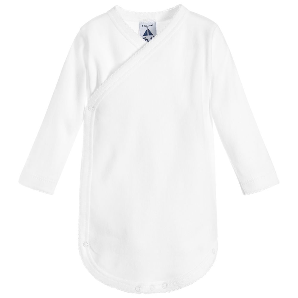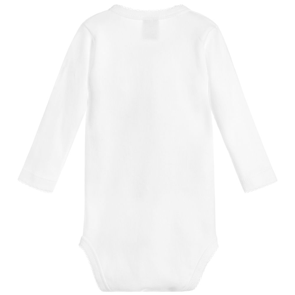 White, long-sleeved bodyvest by Babidu, suitable for both baby boys and girls. Made in beautifully soft cotton jersey and edged with a subtle lacy trim. The front crosses over and fastens with poppers, and there are further poppers between the legs for easy changing and dressing.