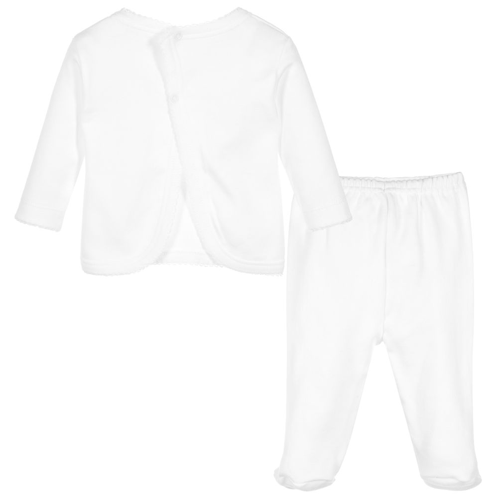 Two-piece babygrow by Babidu, for baby boys and girls, made in beautifully soft, white cotton jersey. The top is edged in delicate scalloped trim and fastens on the back with poppers. The trousers have an elasticated waistband for comfort