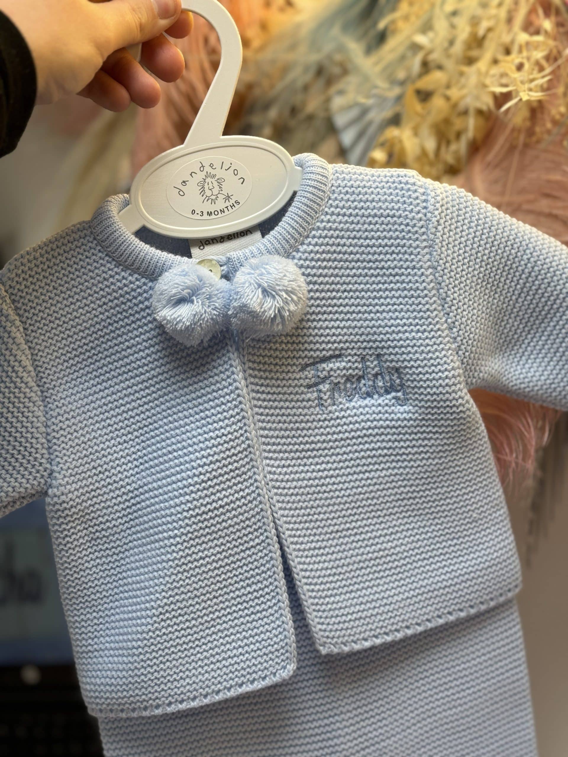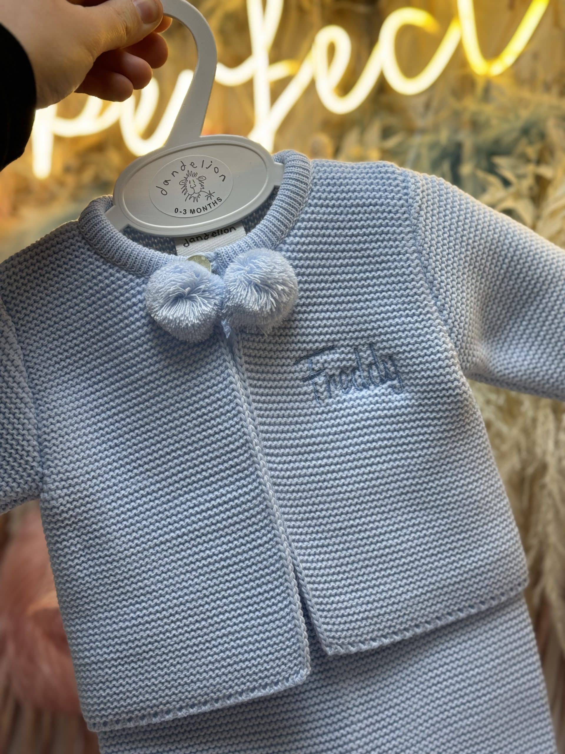 Baby boys Knitted Jacket with pom poms on the front & Trousers with full foot, perfect for a coming home outfit, Gift for a baby shower. Team it up with a babidu vest under neath.