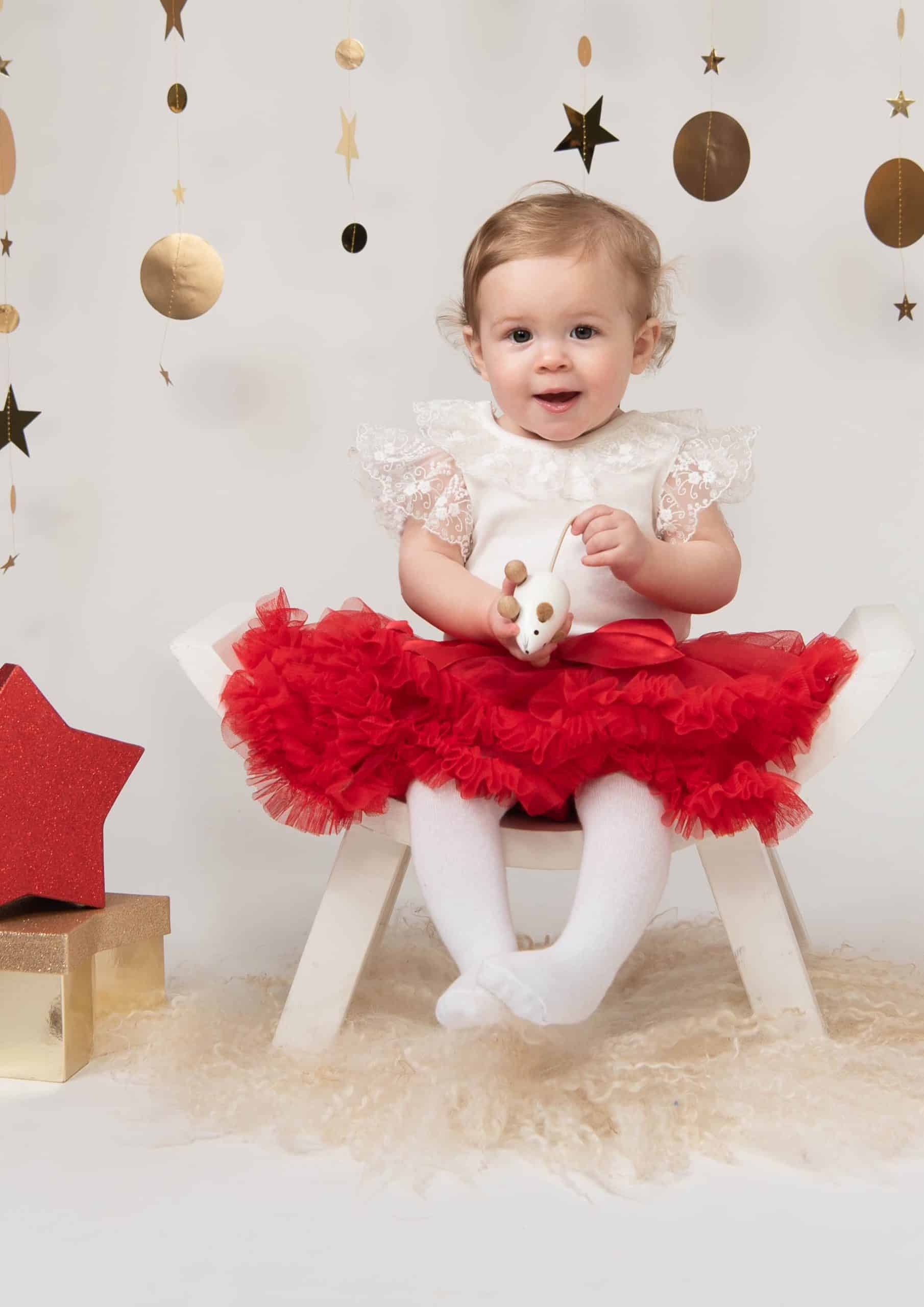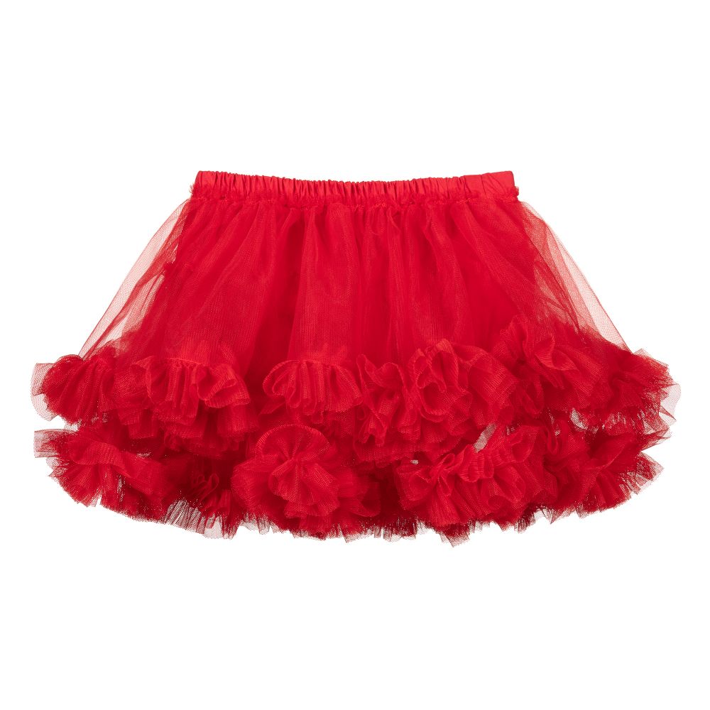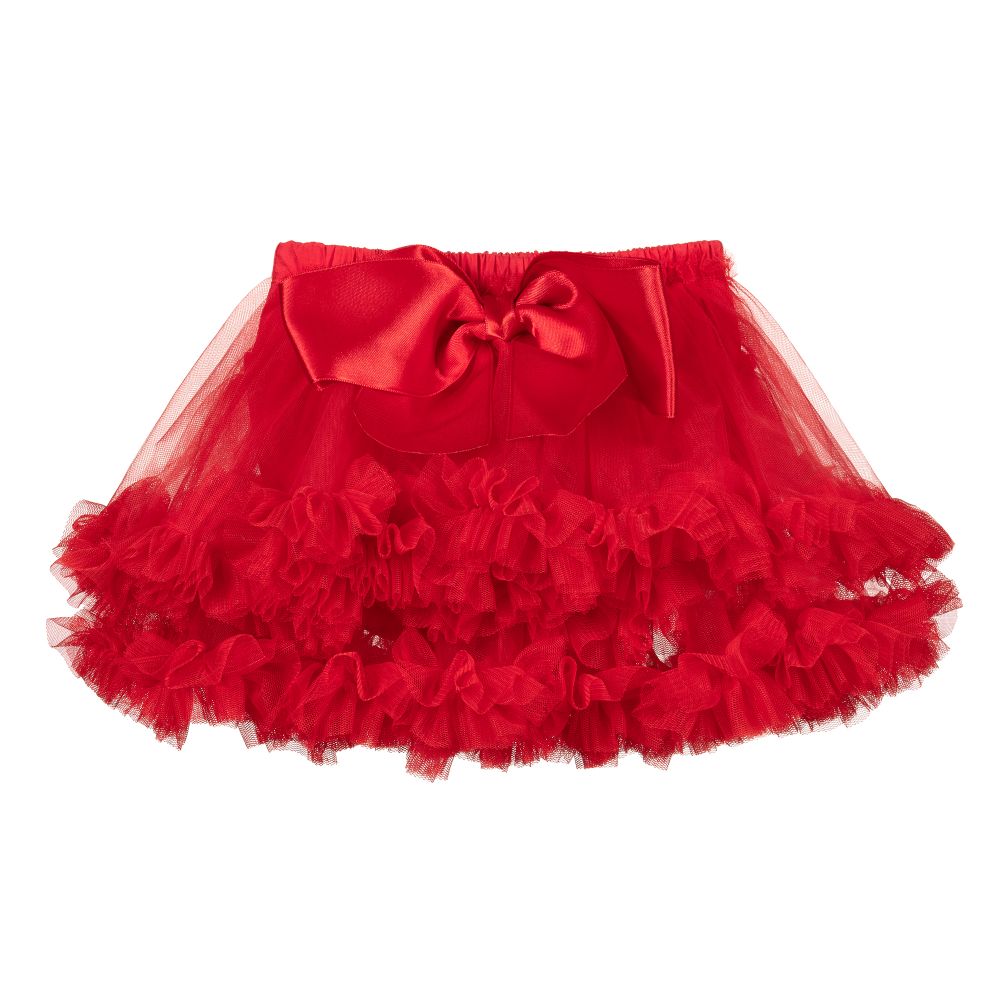 Red tutu skirt ONLY for little girls by Caramelo Kids, made in layers of soft tulle, with attached cotton knickers. It has a large red satin bow on the back.