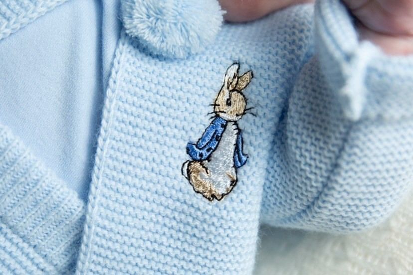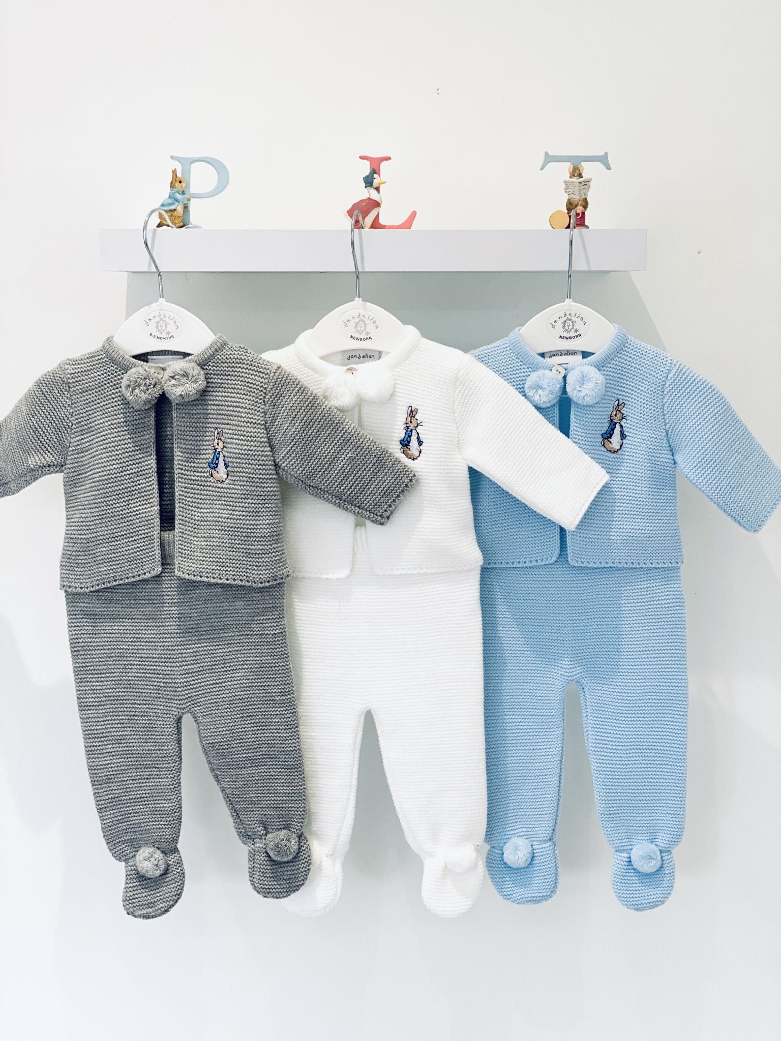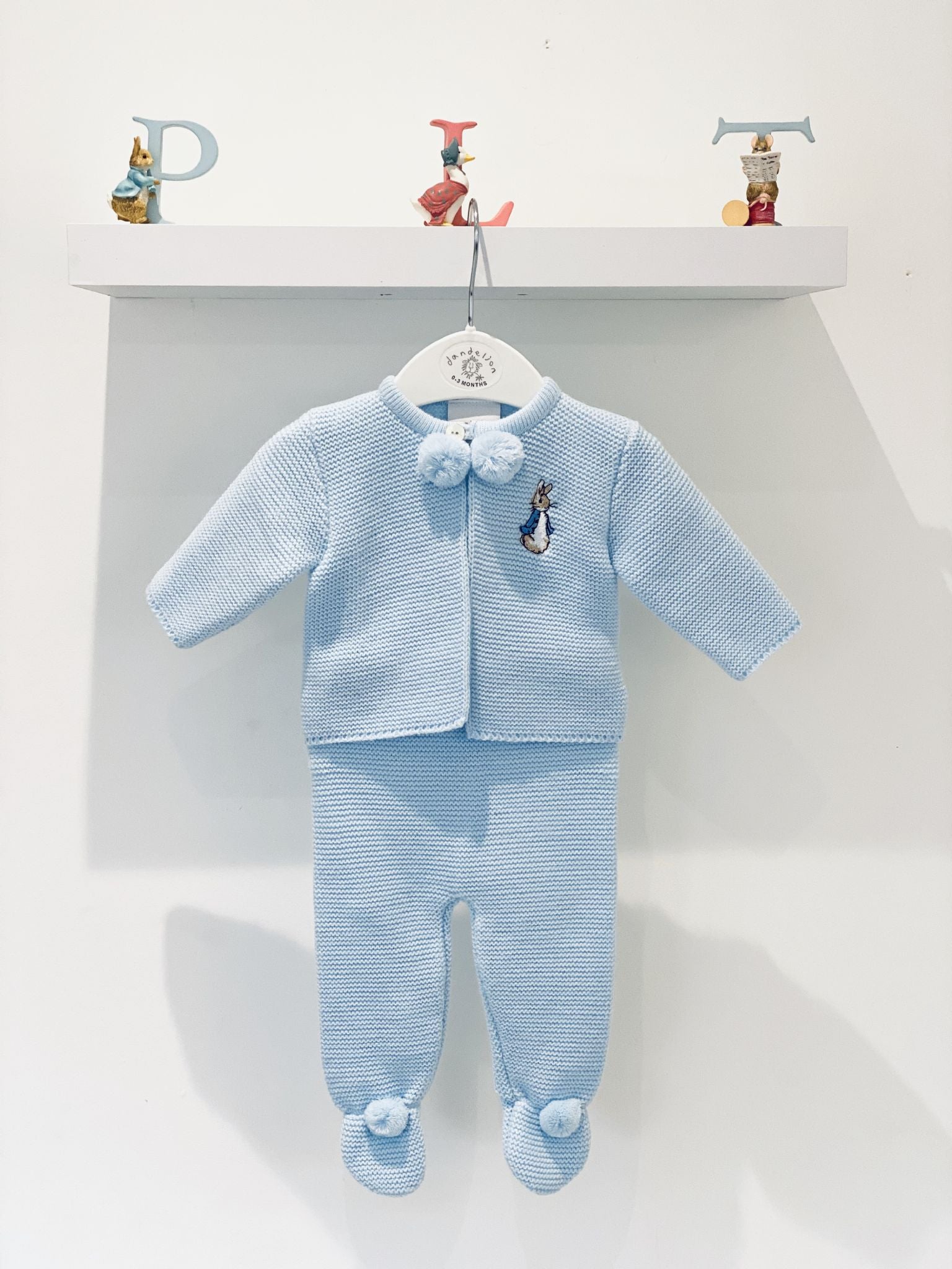 Baby boys Knitted Jacket with pom poms on the front and Peter rabbit & Trousers with full foot, perfect for a coming home outfit, Gift for a baby shower. Team it up with a babidu vest under neath.