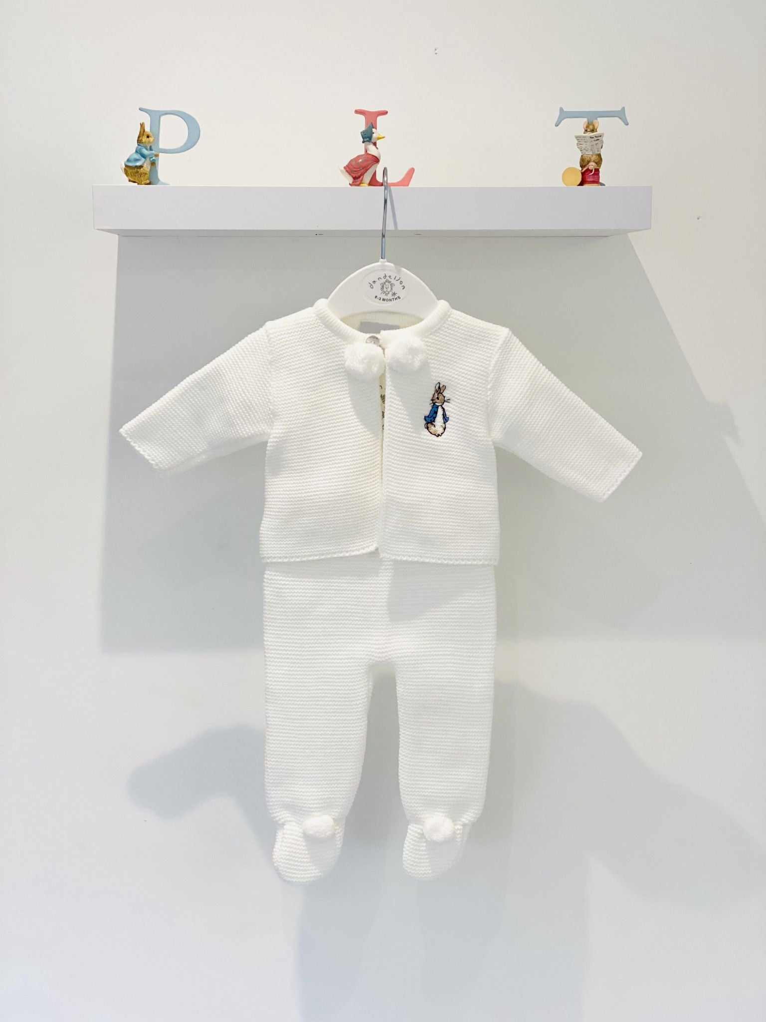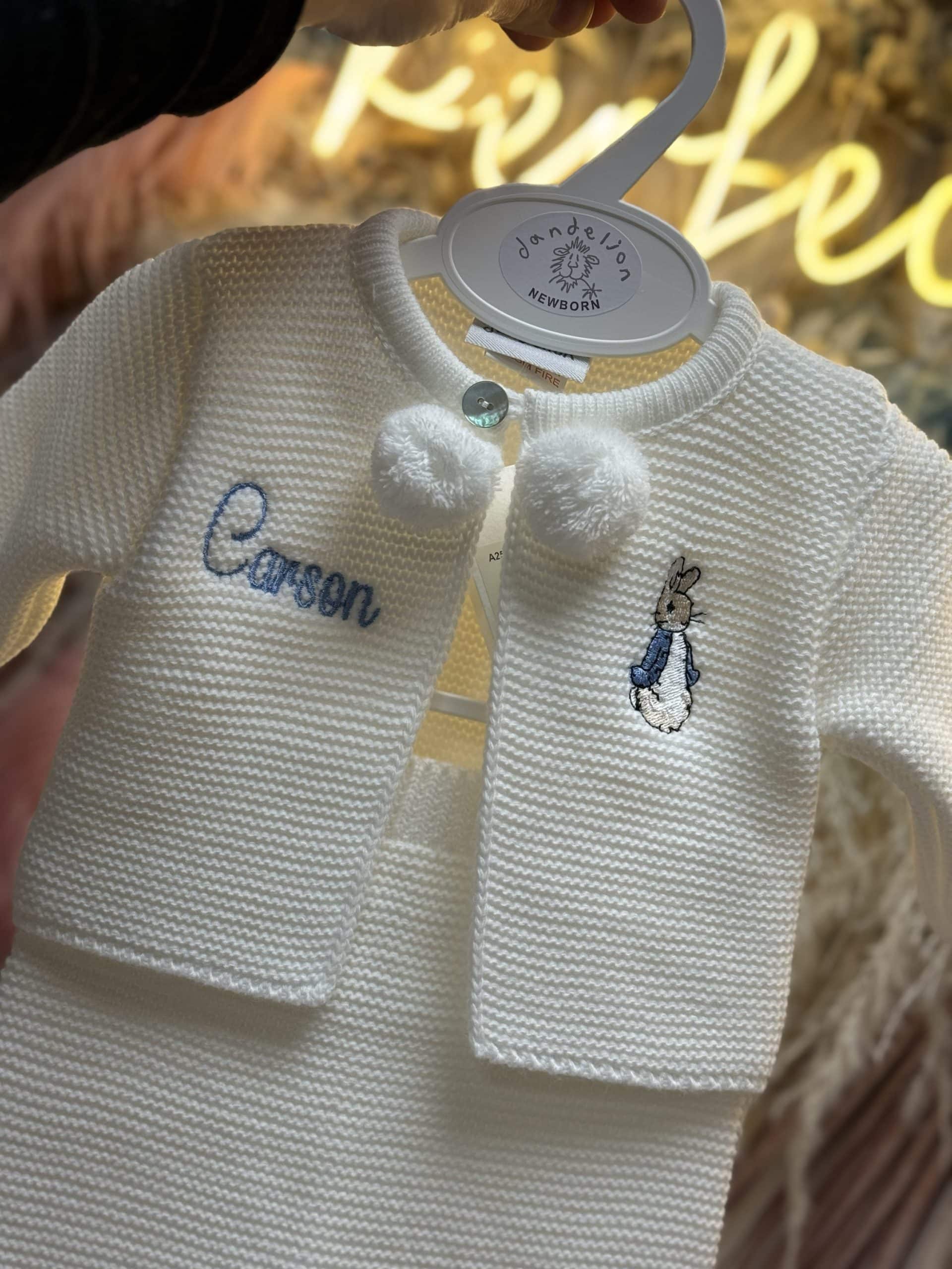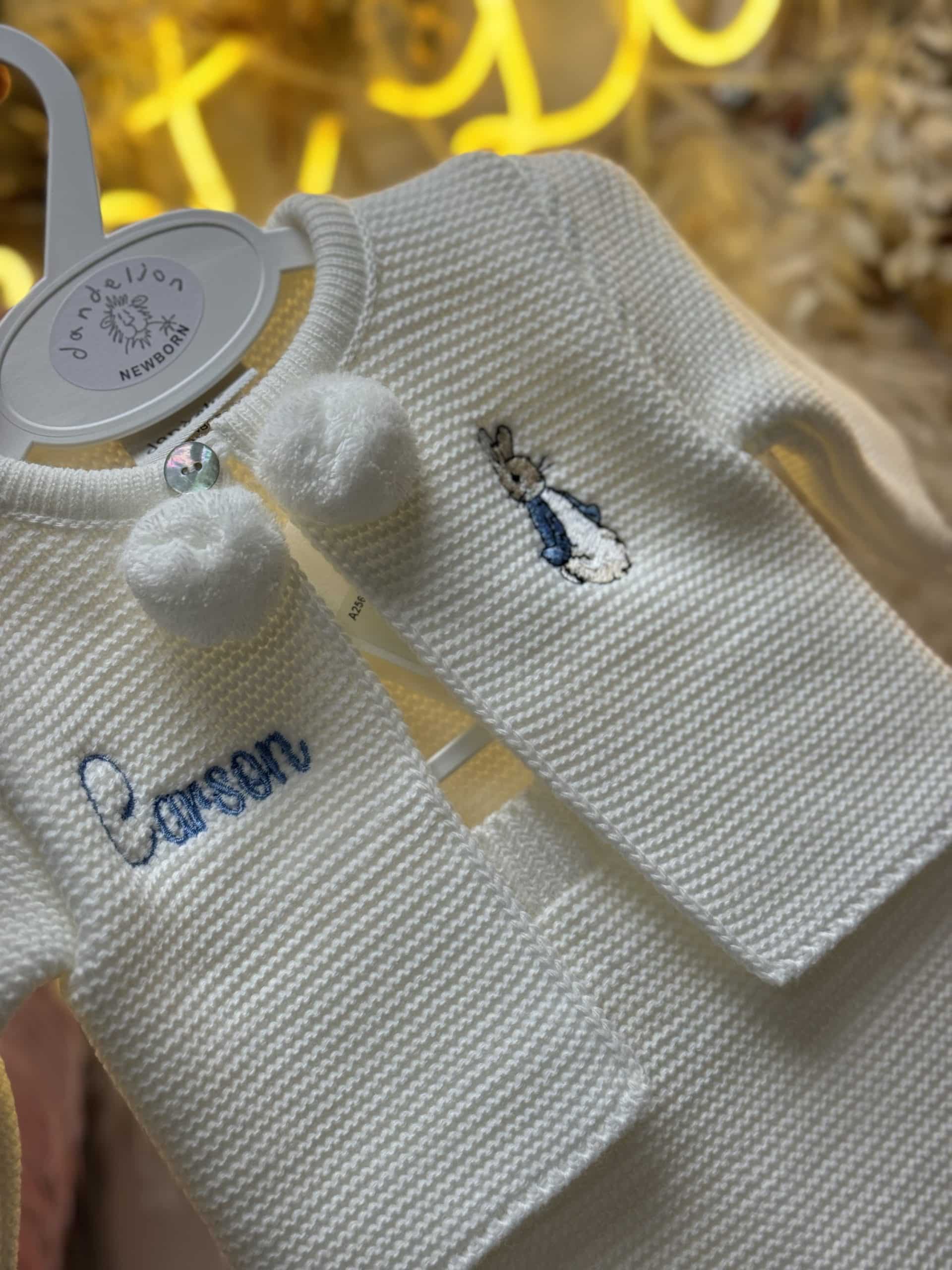 Beautiful Spanish Knitted Outfit with a Peter Rabbit Embroidery on perfect for a coming home outfit, this is one of our best sellers. check out the matching peter rabbit hat. If you choose for it to be personalised the name will be on the opposite side of peter rabbit.