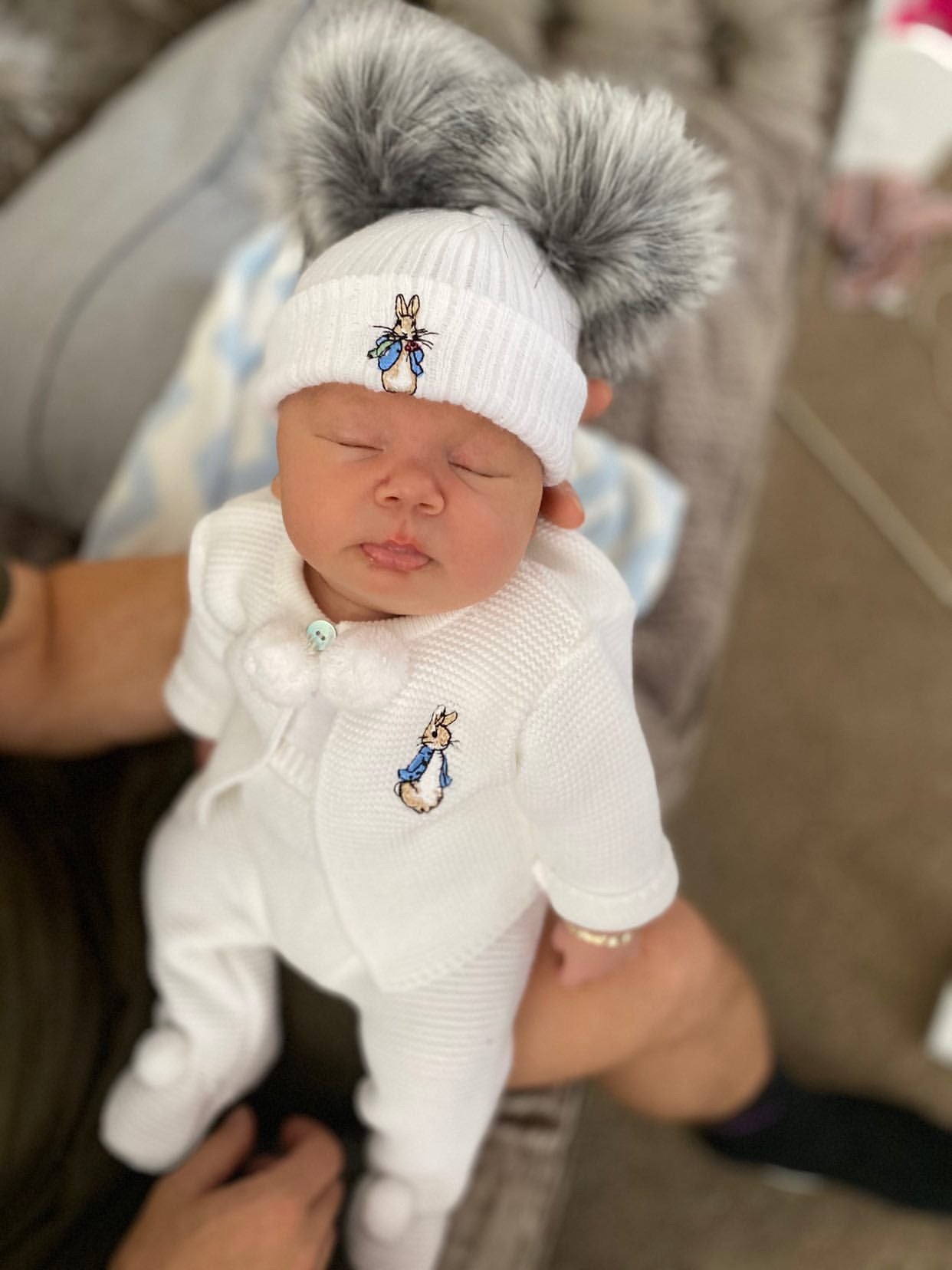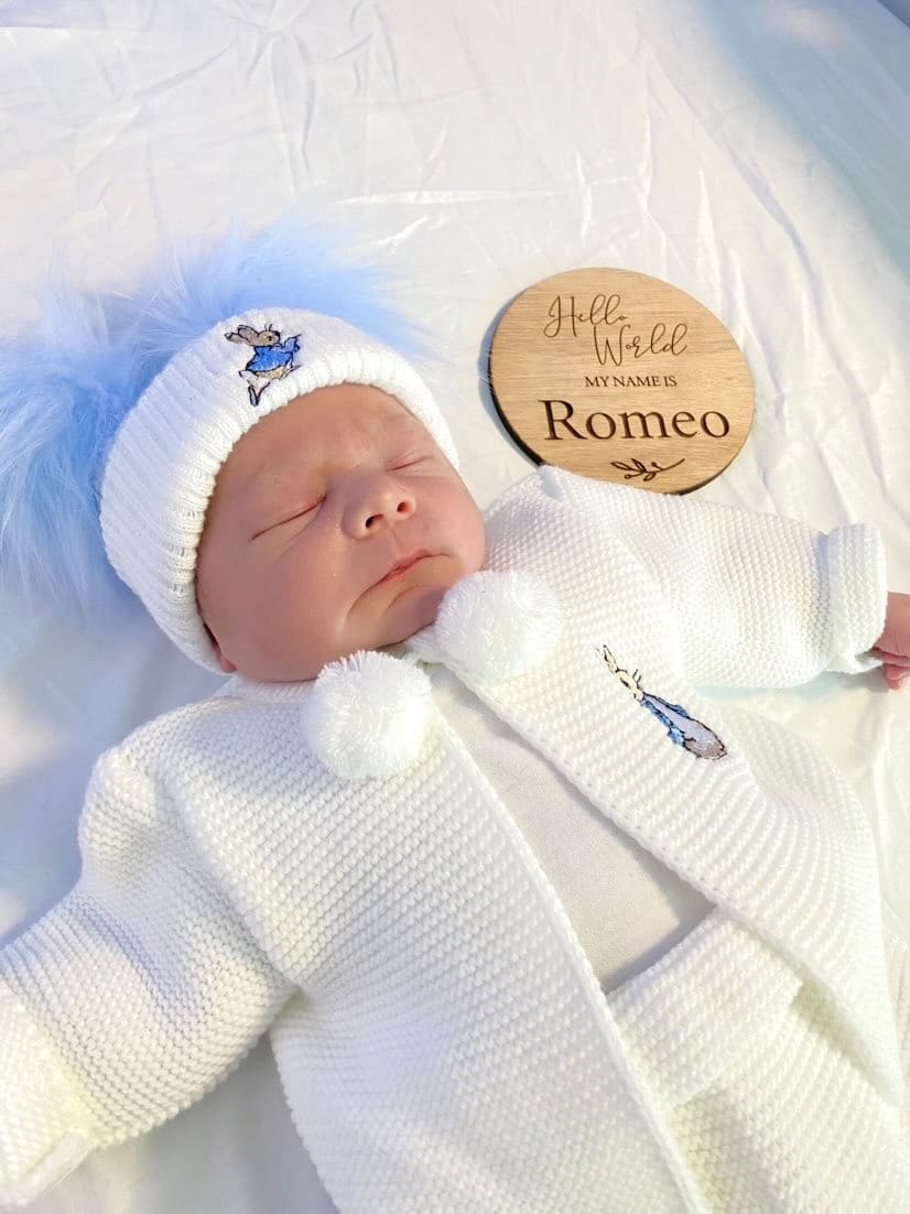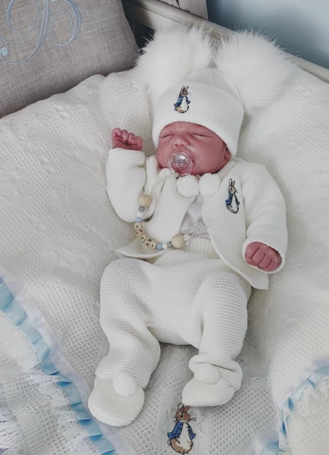 Beautiful Spanish Knitted Outfit with a Peter Rabbit Embroidery on perfect for a coming home outfit, this is one of our best sellers. check out the matching peter rabbit hat. If you choose for it to be personalised the name will be on the opposite side of peter rabbit.