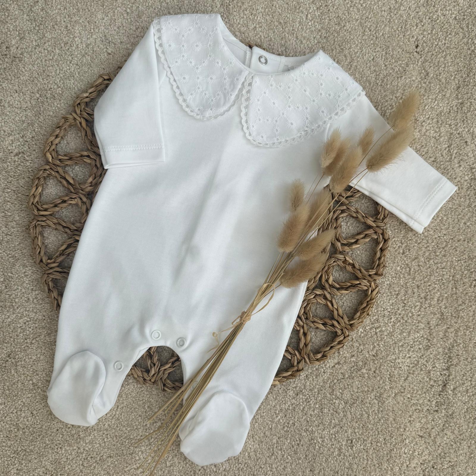Luxury White Baby Sleepsuit with Broderie Anglaise Collar