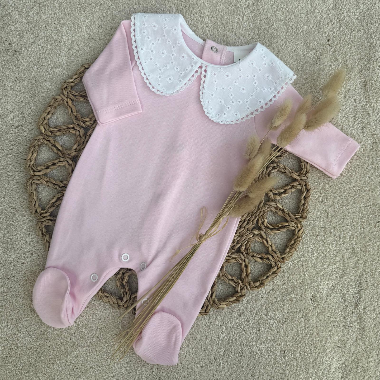 Luxury Pink Baby Sleepsuit with Broderie Anglaise Collar