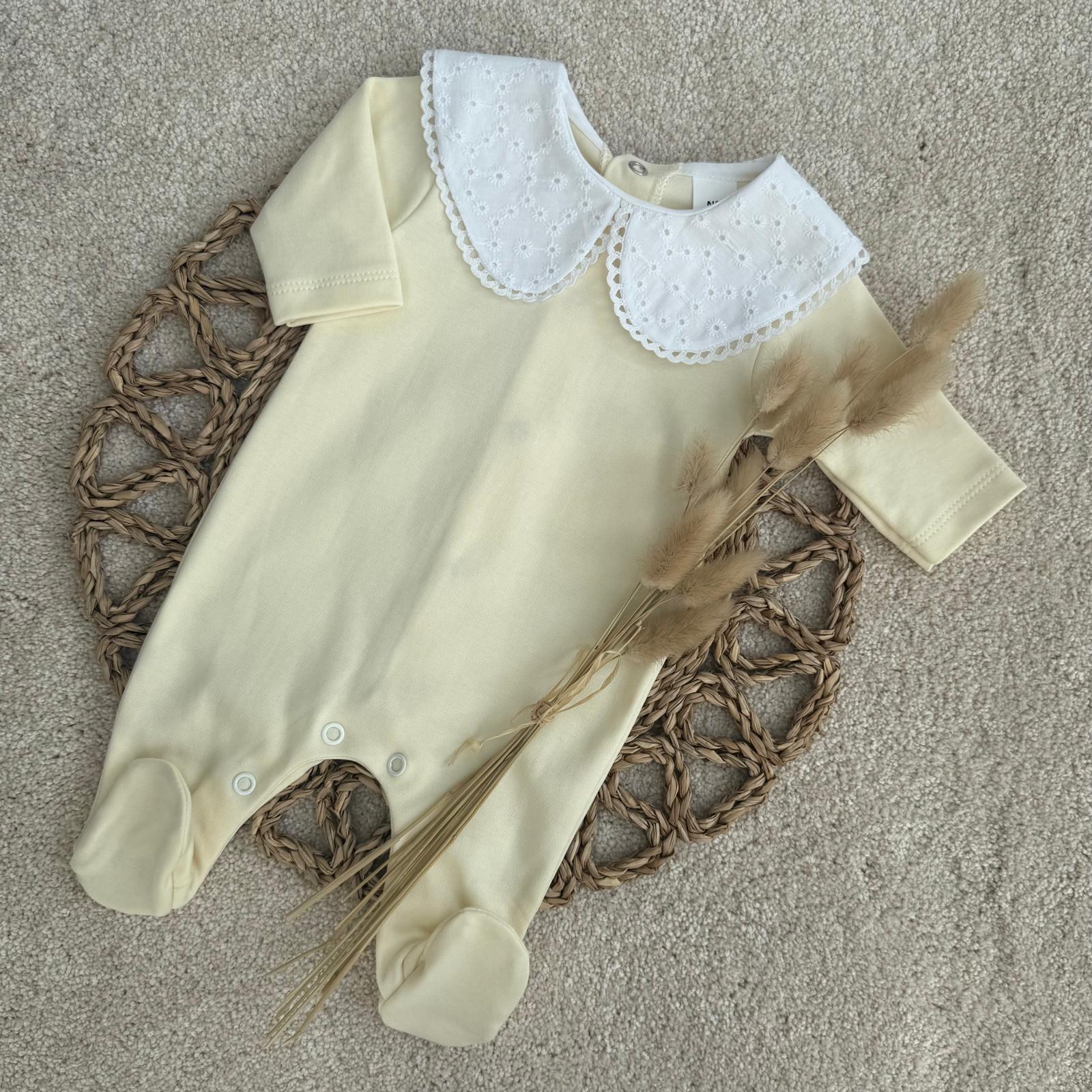 Luxury Lemon Baby Sleepsuit with Broderie Anglaise Collar
