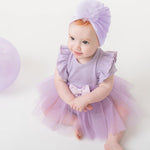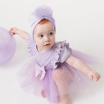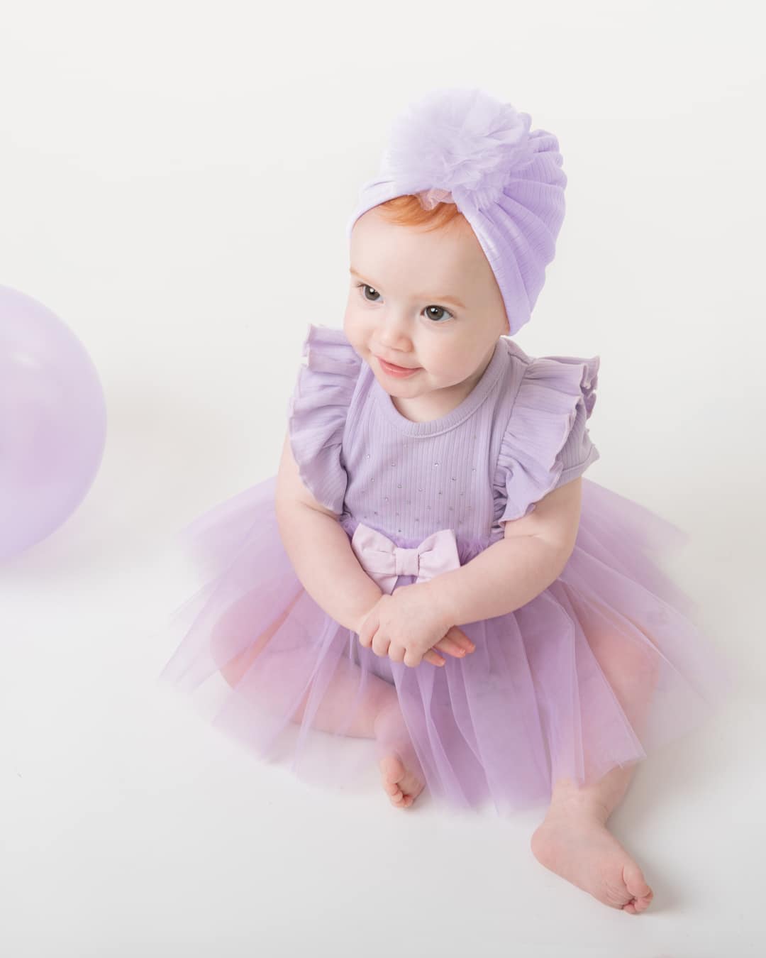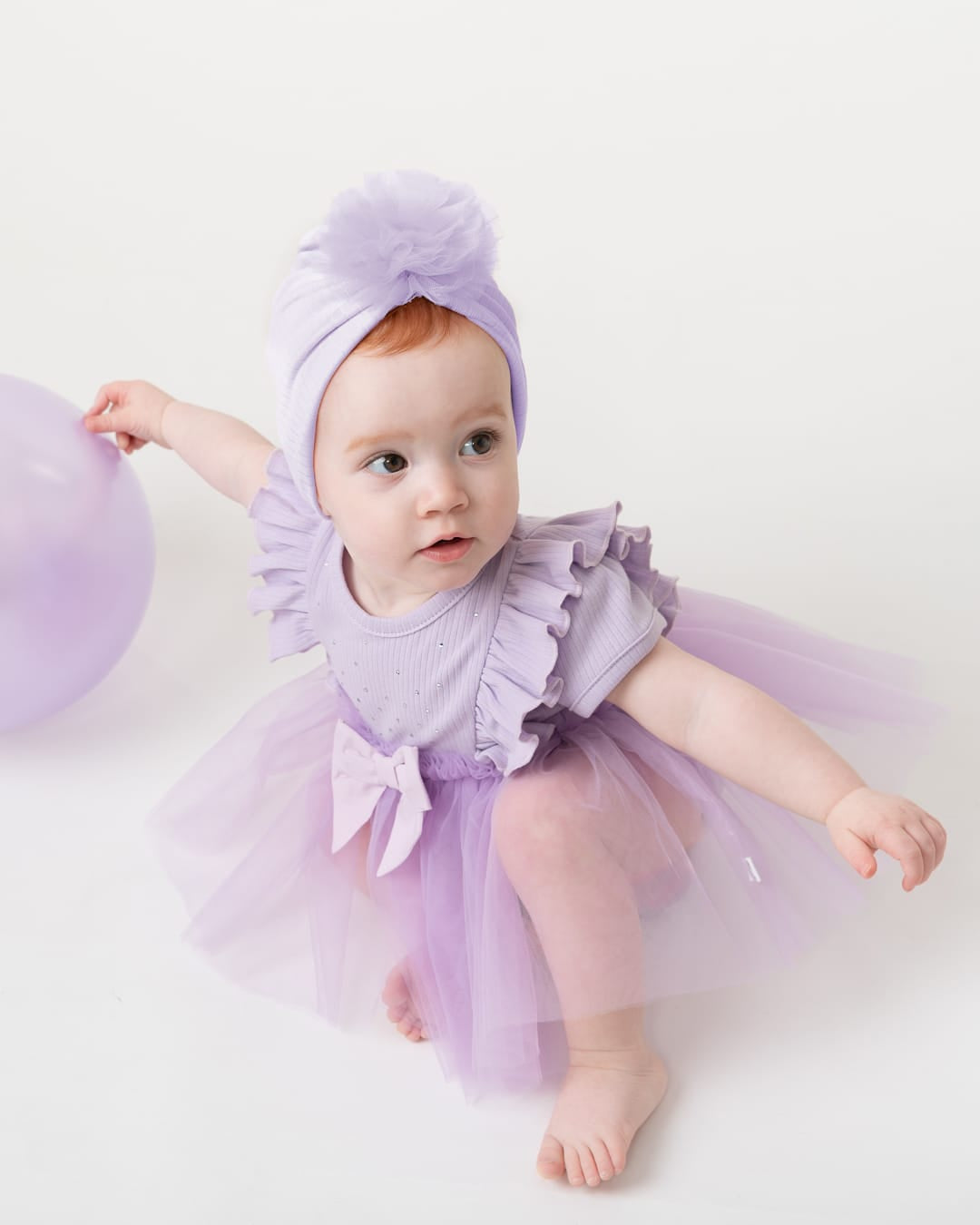 Lovely for a party, this lilac purple dress set for baby girls is by Caramelo Kids. The dress is made in soft ribbed cotton jersey, decorated with pretty ruffles, sparkly diamanté, and a fixed bow on the front. The gathered tulle skirt has attached jersey knickers which fasten with poppers between the legs. The dress comes with a matching turban style hat to complete the party look.