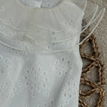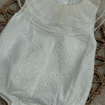 This baby girl’s white romper is a beautifully detailed piece, made from soft cotton broderie anglaise fabric with floral eyelet embroidery throughout. Here’s a breakdown of its key features: