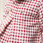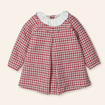 This Mac Ilusión baby girl’s dress features a classic and eye-catching red and white houndstooth pattern, woven in a soft and textured fabric. The dress has a structured silhouette with gentle pleating at the front for added volume and comfort. Decorative gold-tone buttons on the chest add a touch of elegance and charm, making it a perfect choice for festive occasions or smart outings. The high neckline and long sleeves give it a timeless, refined look, while the rich color and intricate weave reflect Mac Ilusión’s signature craftsmanship.