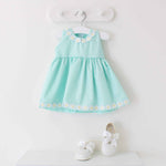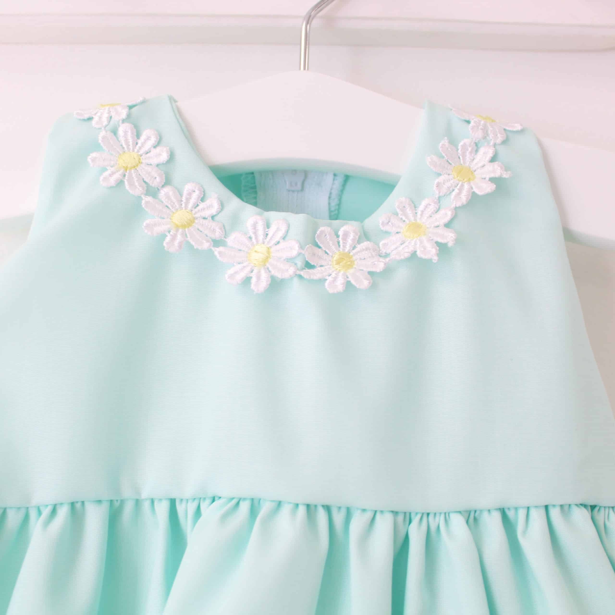 Girls Stunning Sleeveless summer dress, The dress has daisy around the waist and along the bottom with a lace frill. This dress has a zip on the back to zip up.