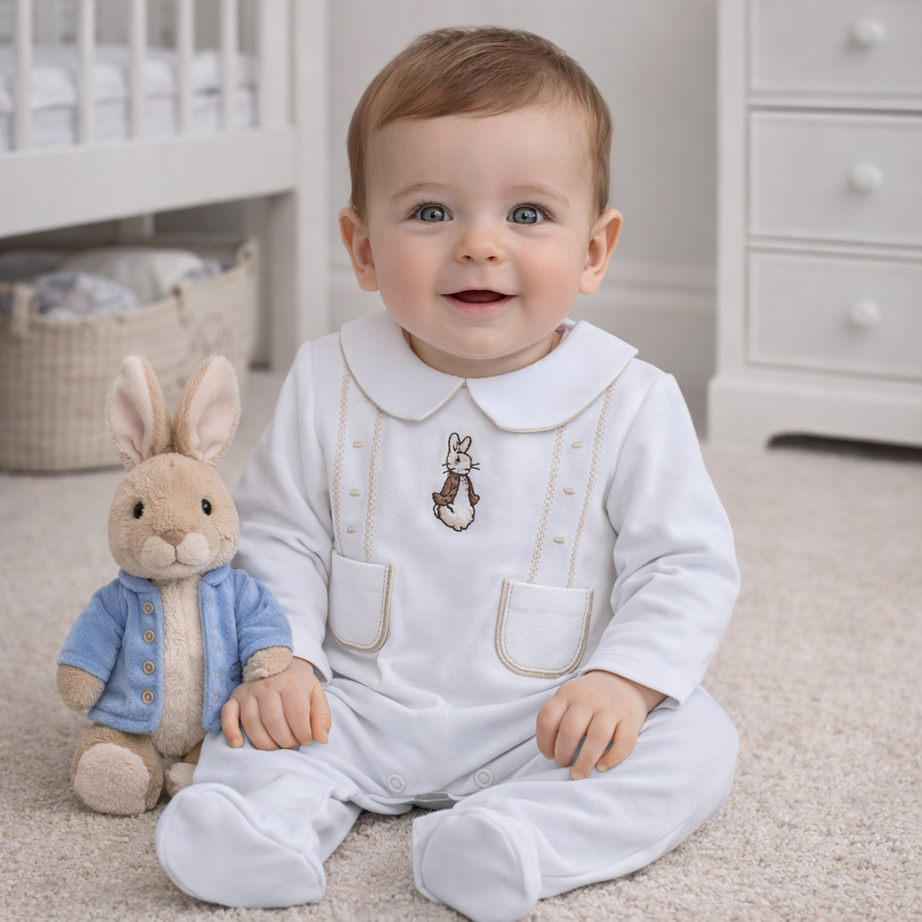 This adorable baby sleep suit is made from soft, breathable cotton, ensuring comfort and coziness for your little one. The pure white fabric is beautifully accented with a sweet blue detail, adding a pop of color. The front features a charming embroidered Peter Rabbit design, bringing a touch of whimsy to bedtime. Please size up as these are small. For easy dressing, the sleep suit is designed with convenient poppers running up the back, making it simple to change your baby without any hassle. Perfect for keeping your baby snug and stylish, this sleep suit combines both comfort and cuteness in one delightful piece.