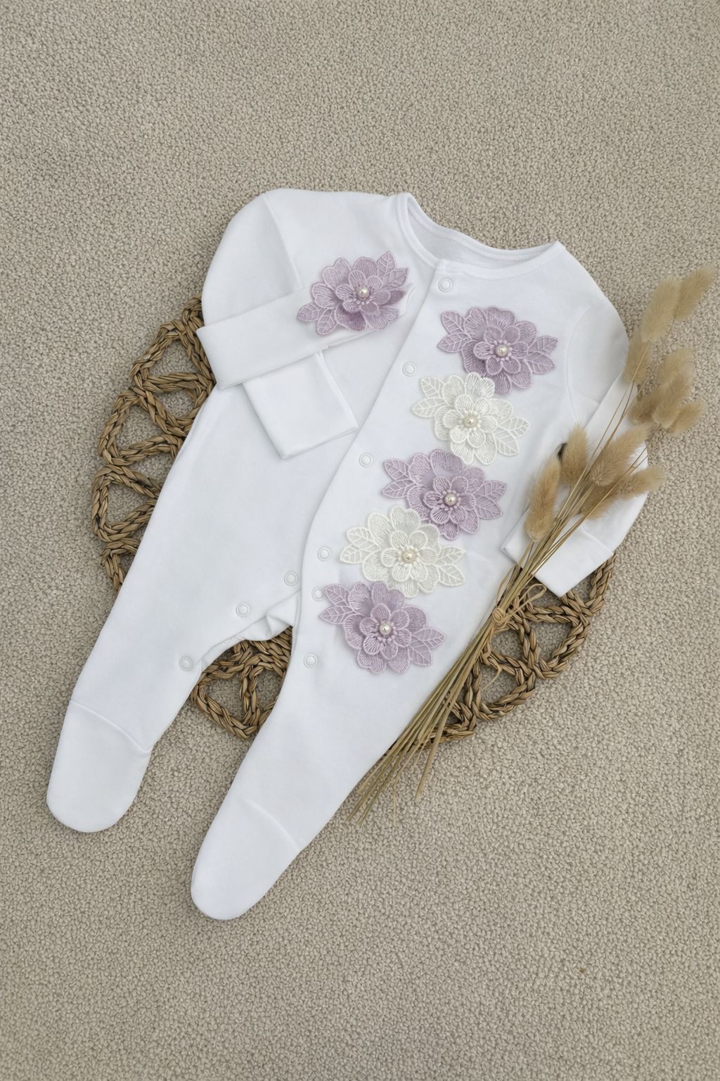 🌸 Personalised Floral Lace Baby Sleepsuit Set