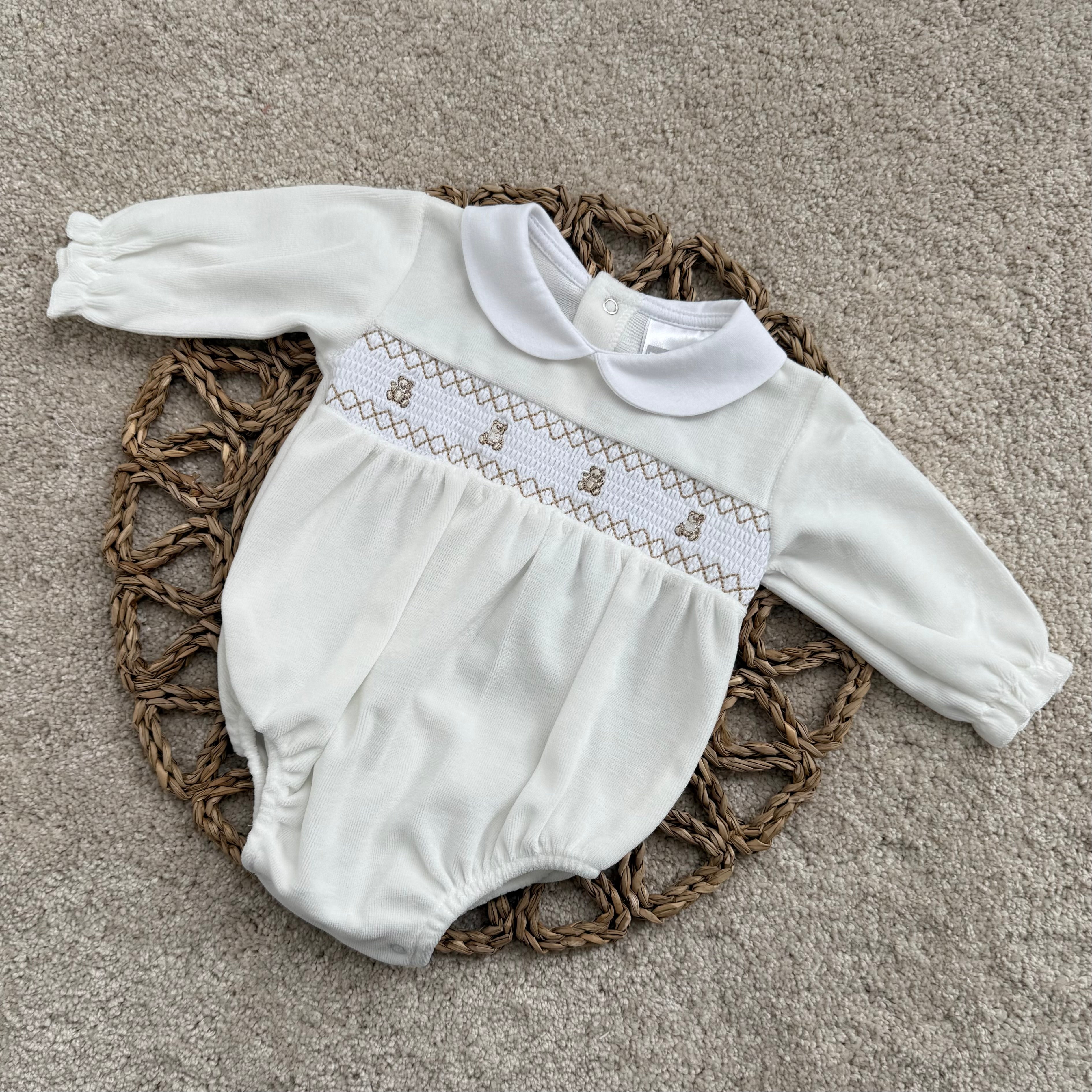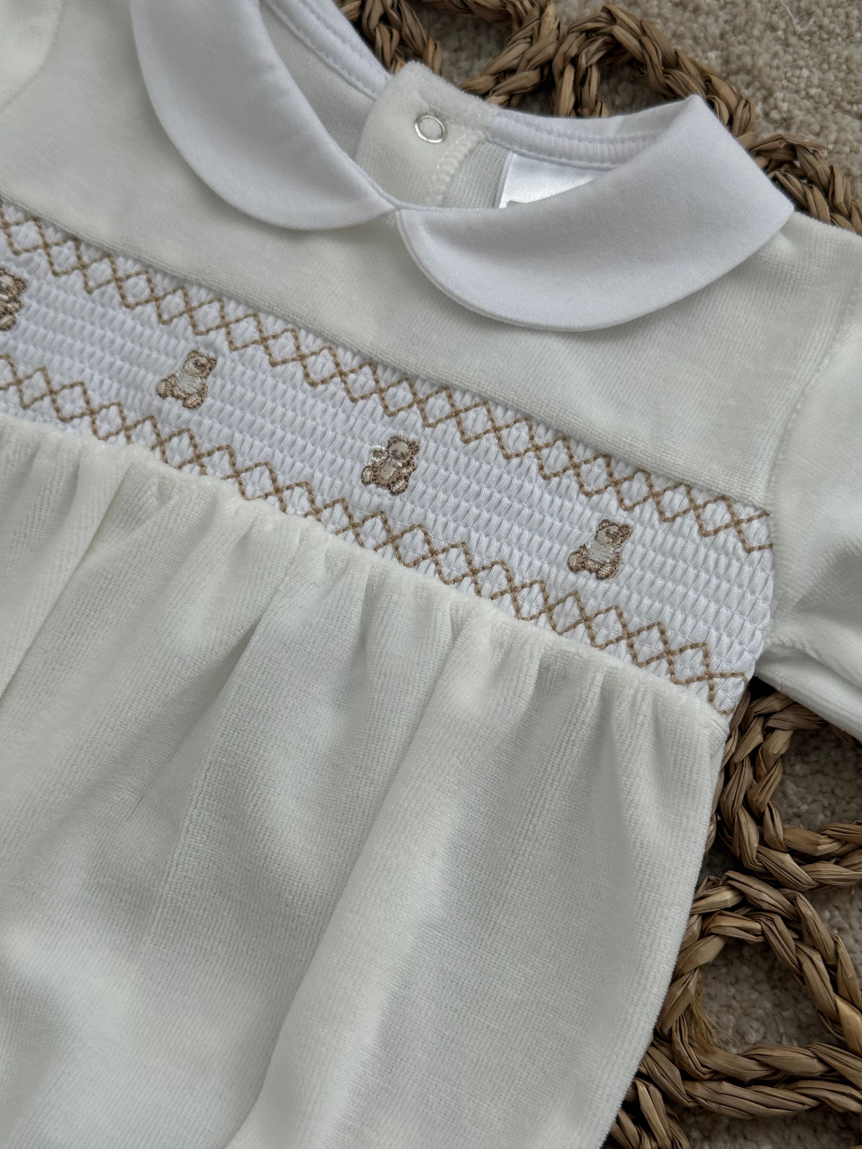 Wrap your little one in soft luxury with our ivory velour smocked romper– a sweet and timeless all-in-one for babies. Made from plush velour fabric, this romper keeps your baby cozy and warm, while the delicate smocking detail across the chest adds a classic, elegant touch. Adorned with cute little teddy bear motifs on the front, it’s perfect for peaceful naps, special occasions, or simply snuggling up at home. Designed for both comfort and style, it’s an ideal choice for your baby’s winter wardrobe.