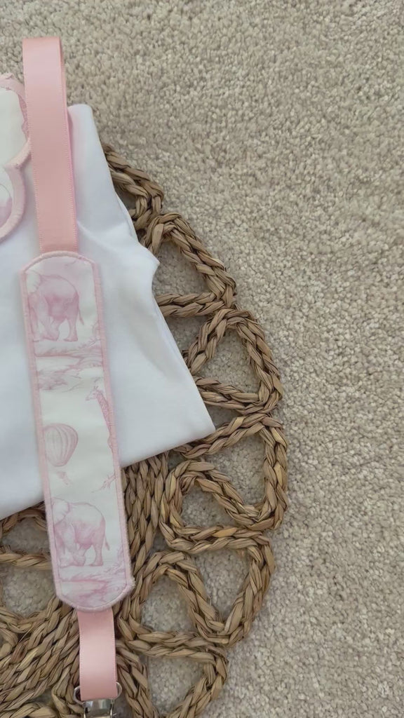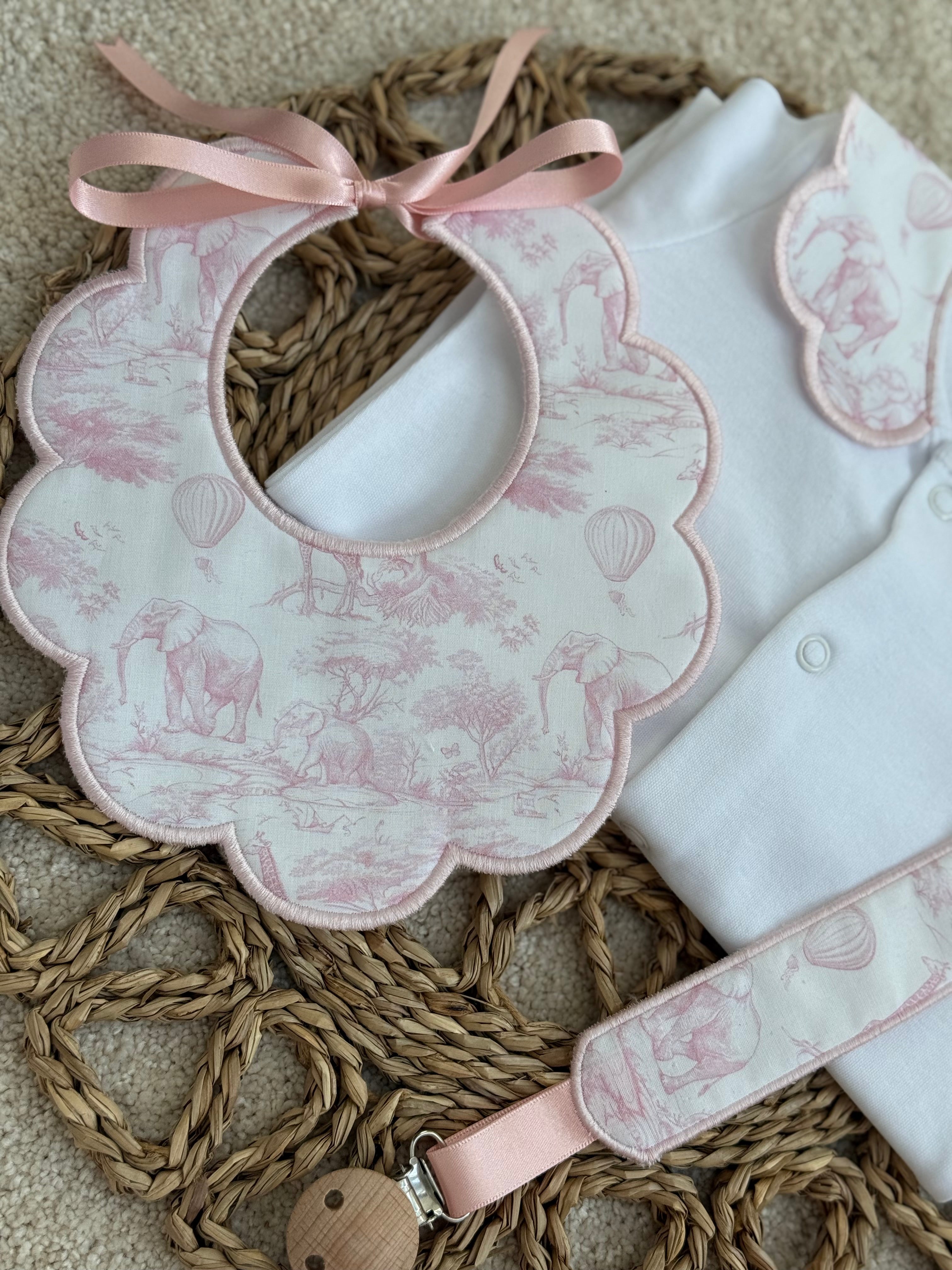 Girls Baby Pink Safari Print Handmade Sleepsuit, Dummy Clip & Bib Set