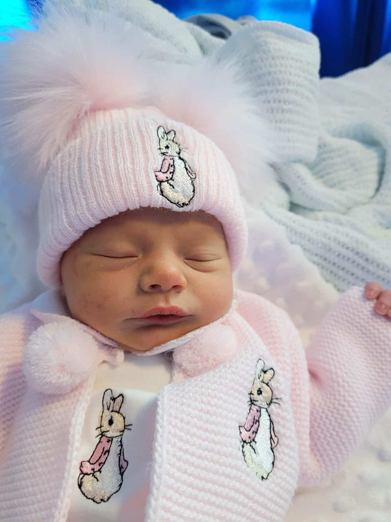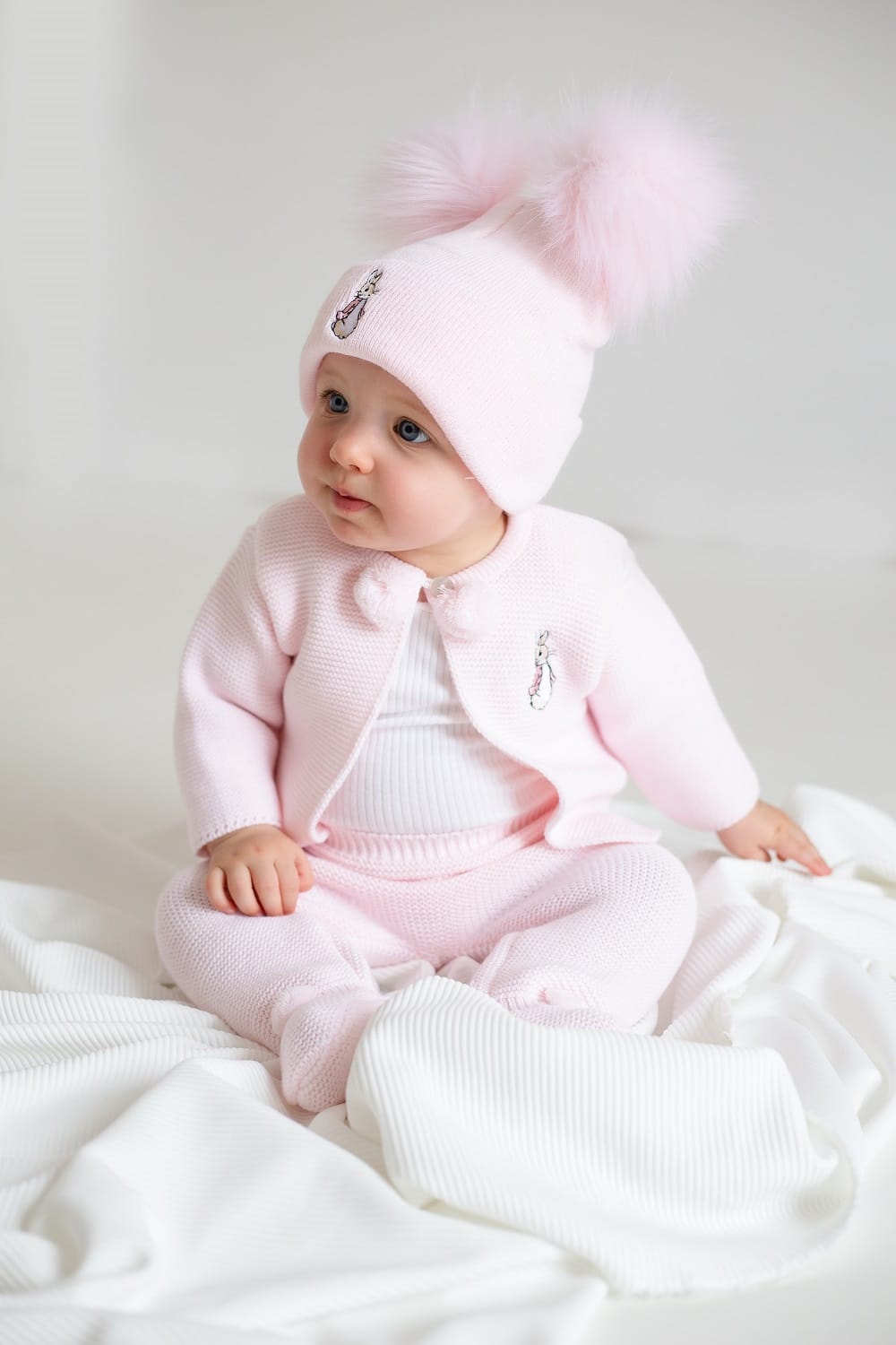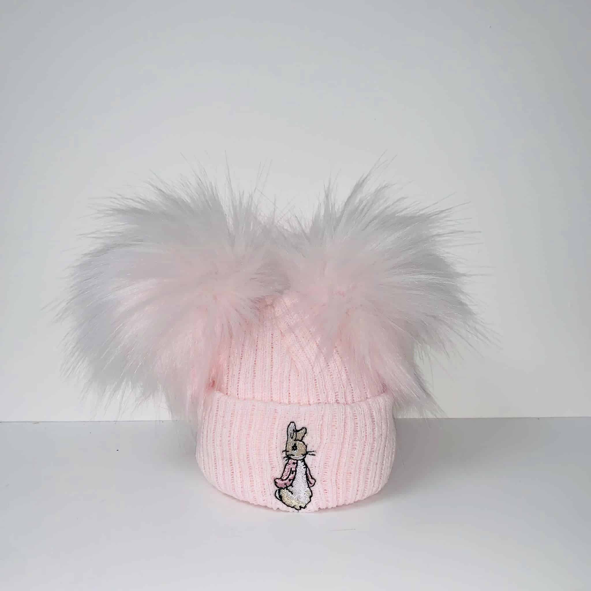 A beautiful pom hat embroidered with our famous Flopsy Bunny embroidery.