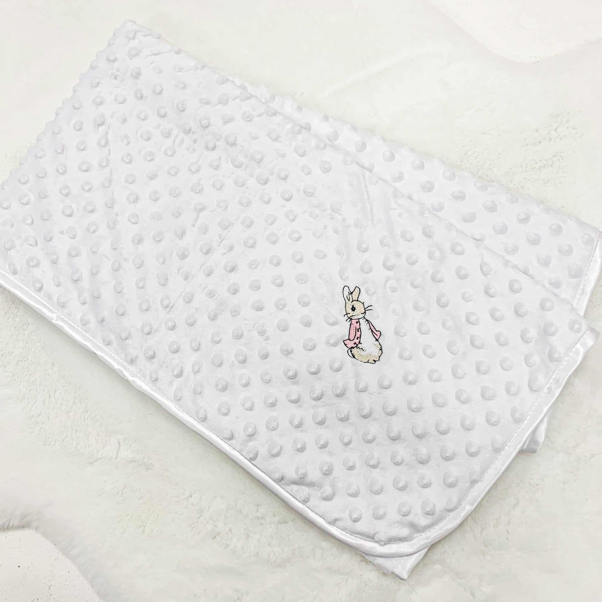 A soft velour blanket with dimpled fabric to one side with satin piping embroidered with our famous Peter Rabbit or Flopsy Bunny design.
