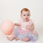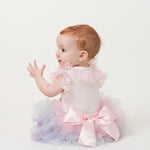 Rainbow tutu skirt ONLY for little girls by Caramelo Kids, made in layers of soft tulle, with attached cotton knickers. It has a large Pink satin bow on the back.