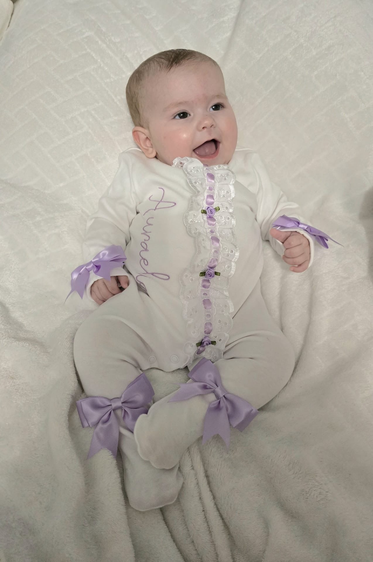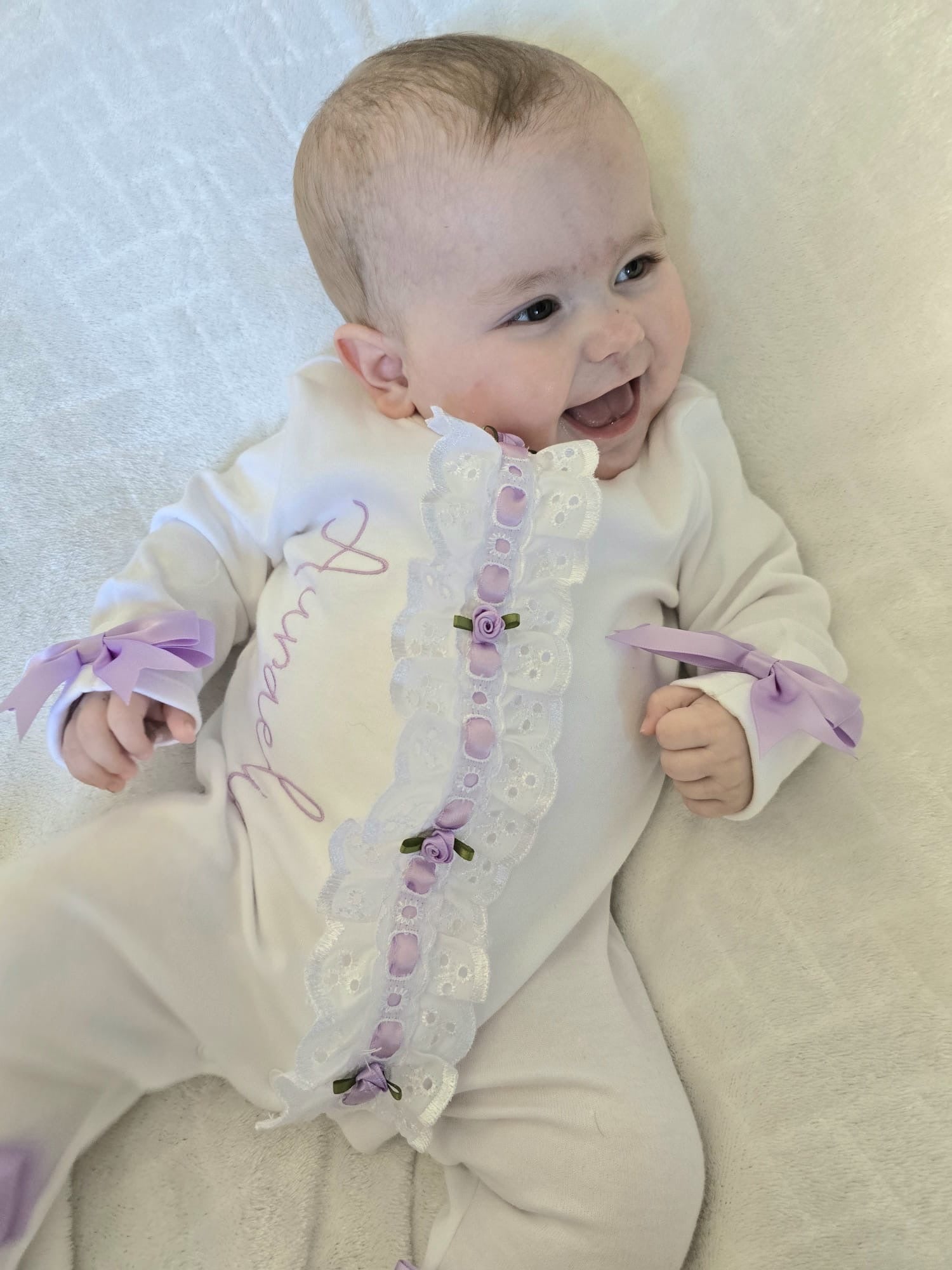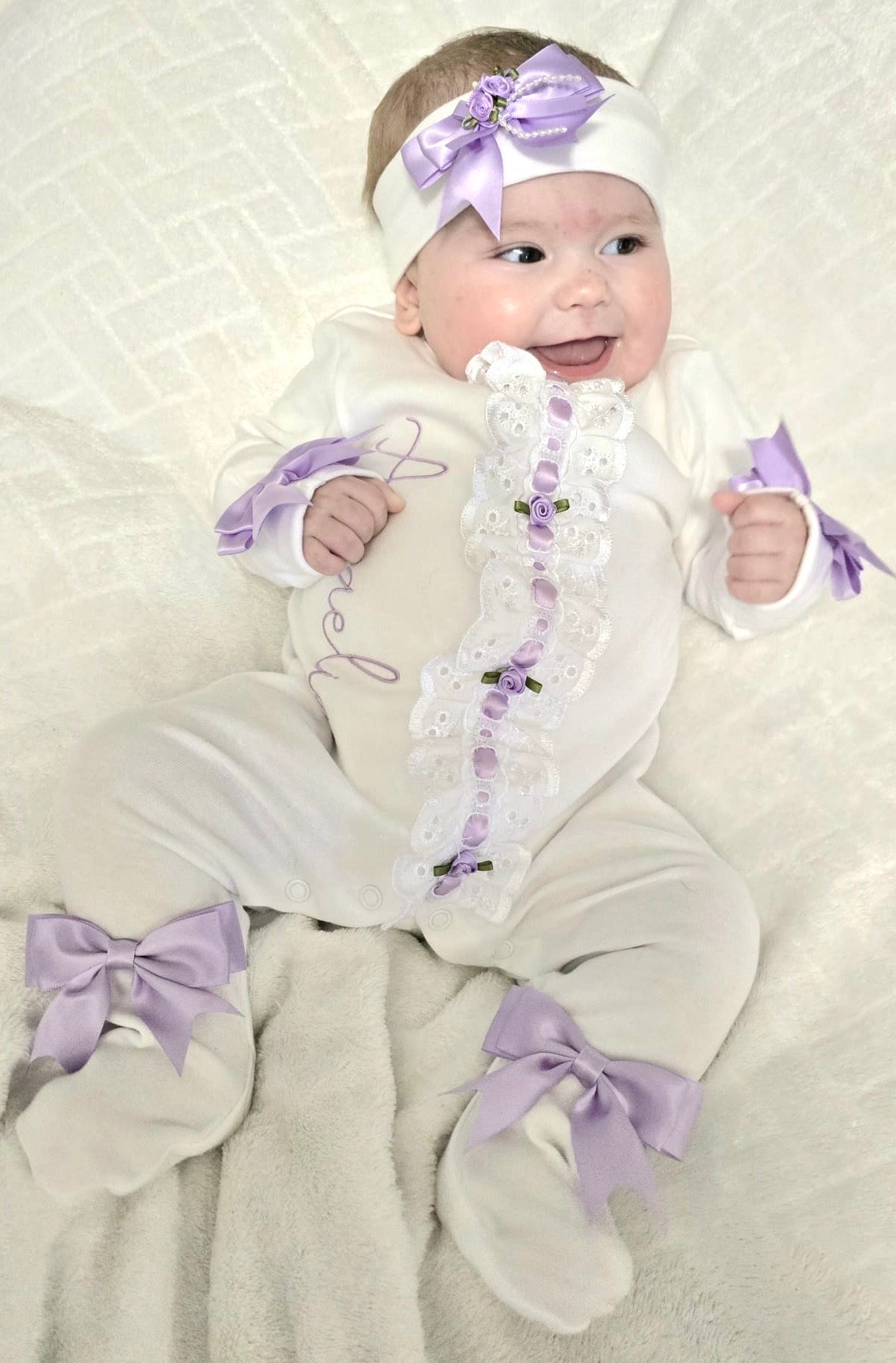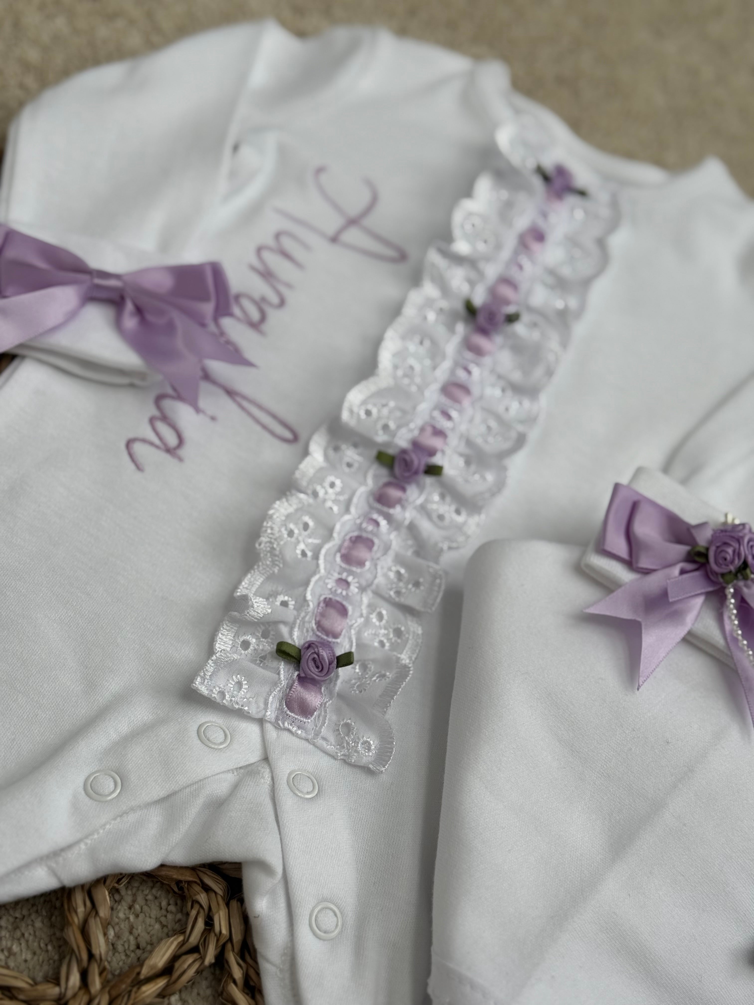 This charming baby girl's handmade sleepsuit is a perfect blend of comfort and elegance. The sleepsuit features intricate detailing, including a delicate frill down the front, adorned with soft lilac ribbons and sweet rosebuds for a touch of femininity. Lilac bows embellish the feet and cuffs, adding an extra layer of sweetness to the design. To complete the look, a beautiful flower headband is included, perfectly complementing the ensemble.