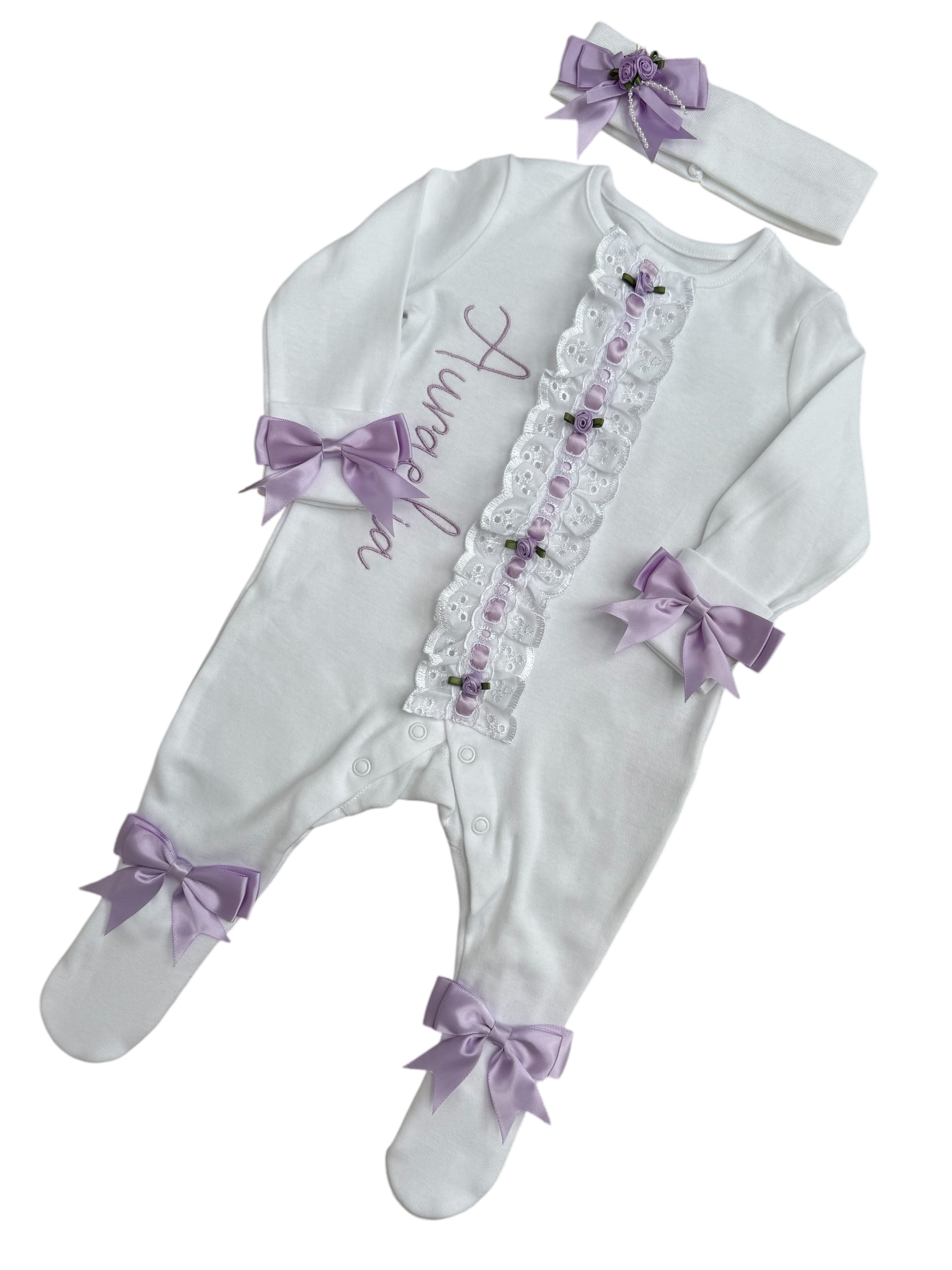 Baby Girls Handmade Lilac Frill Sleepsuit & Headband