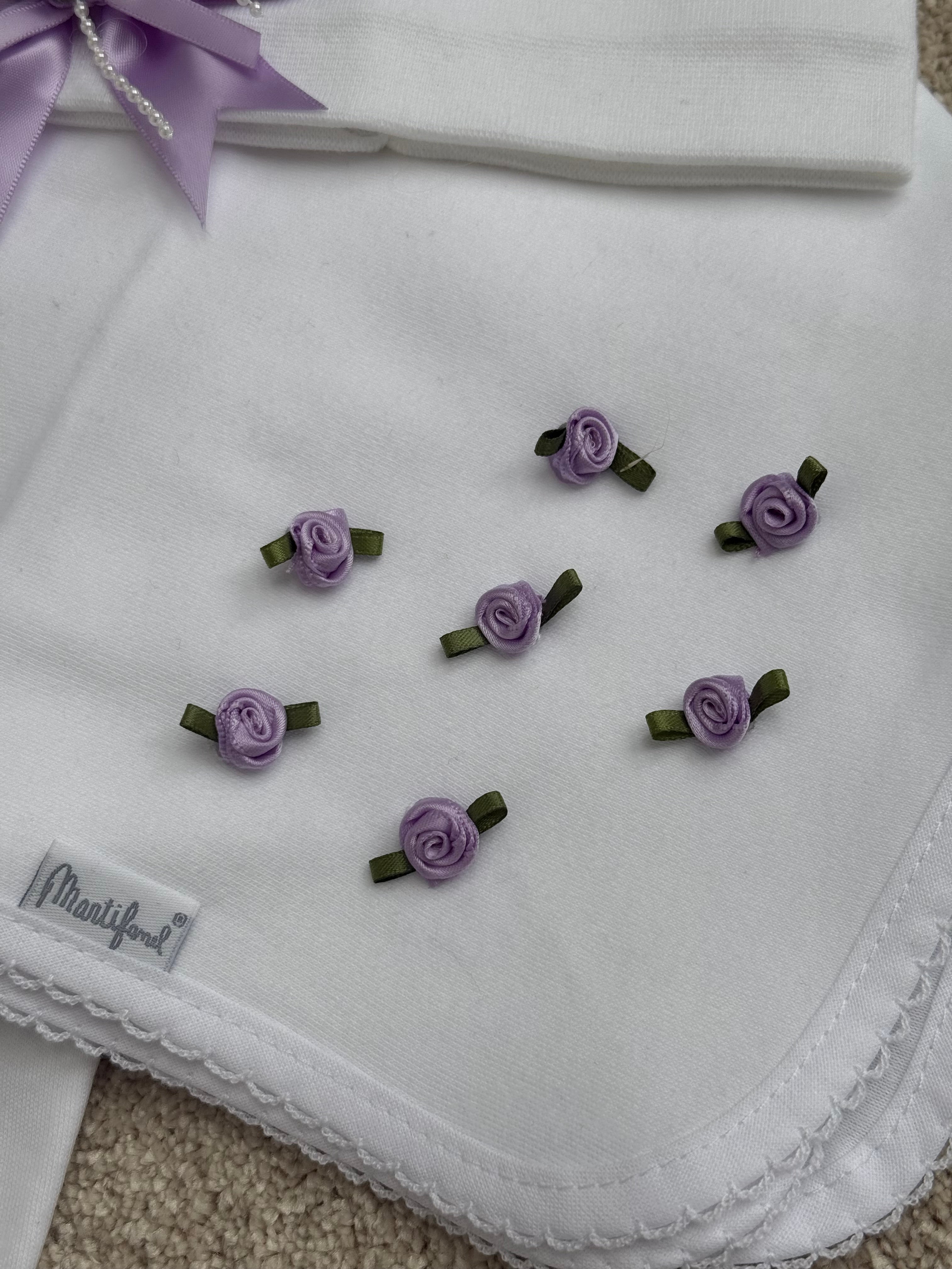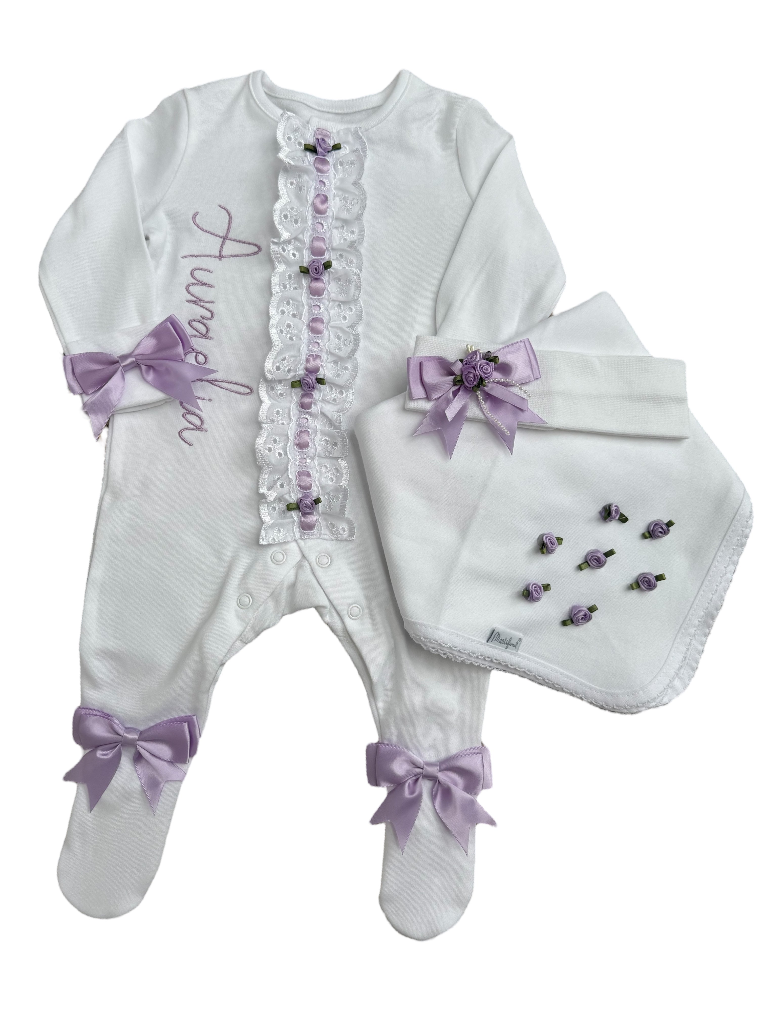 This charming baby girl's handmade sleepsuit is a perfect blend of comfort and elegance. The sleepsuit features intricate detailing, including a delicate frill down the front, adorned with soft lilac ribbons and sweet rosebuds for a touch of femininity. Lilac bows embellish the feet and cuffs, adding an extra layer of sweetness to the design. To complete the look, a beautiful flower headband is included,Comes with a Muslin with beautiful matching rose buds, perfectly complementing the ensemble.