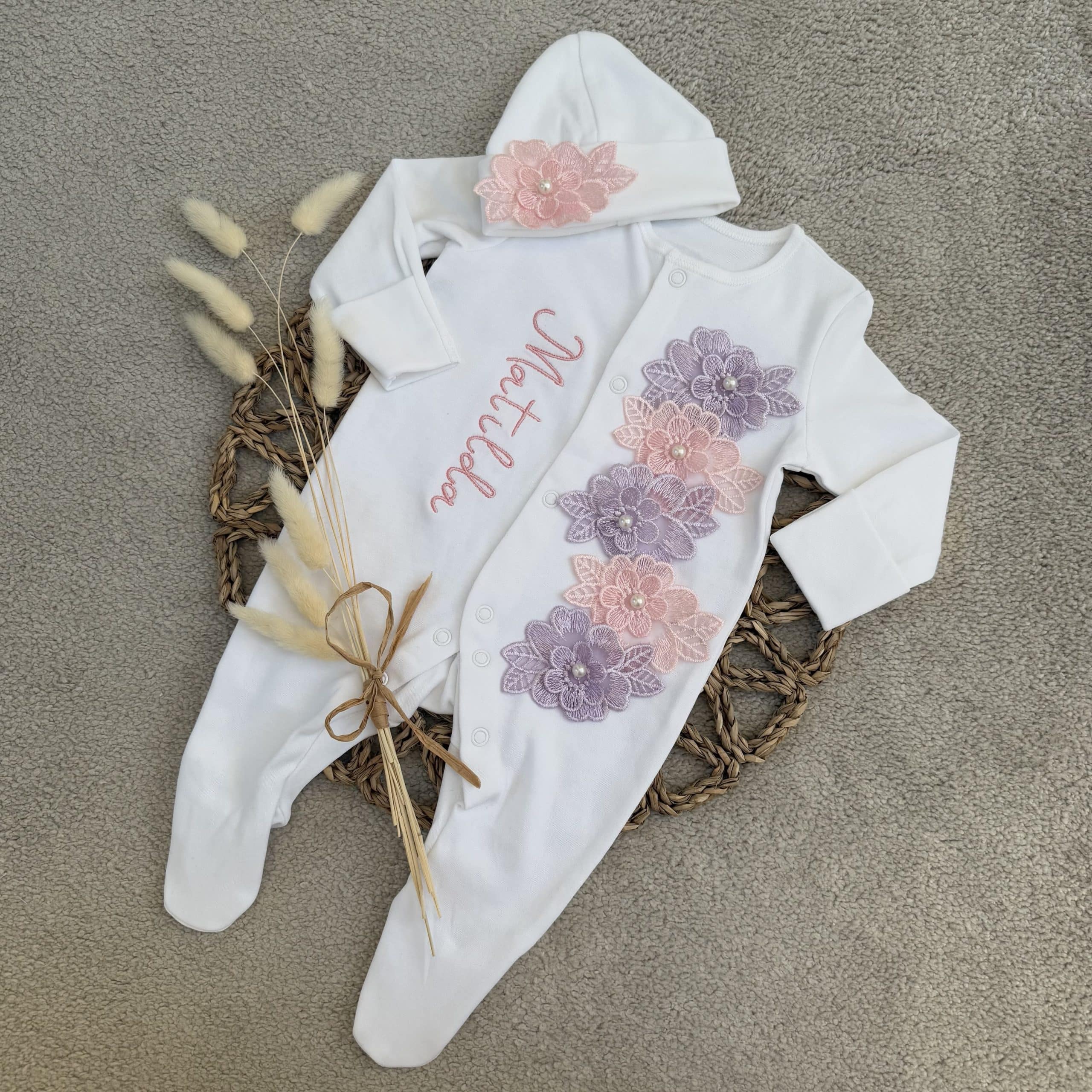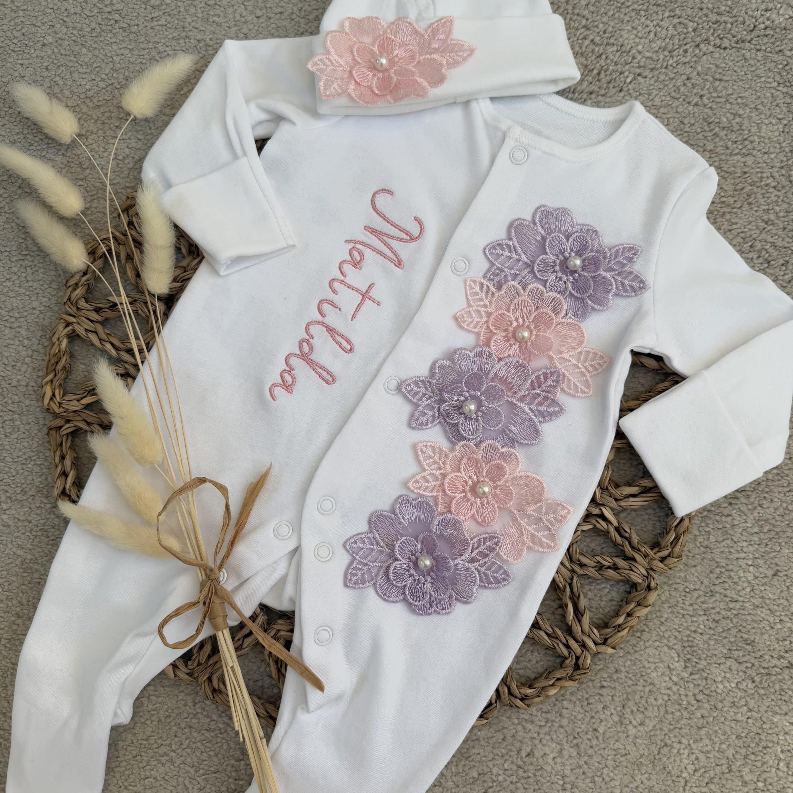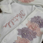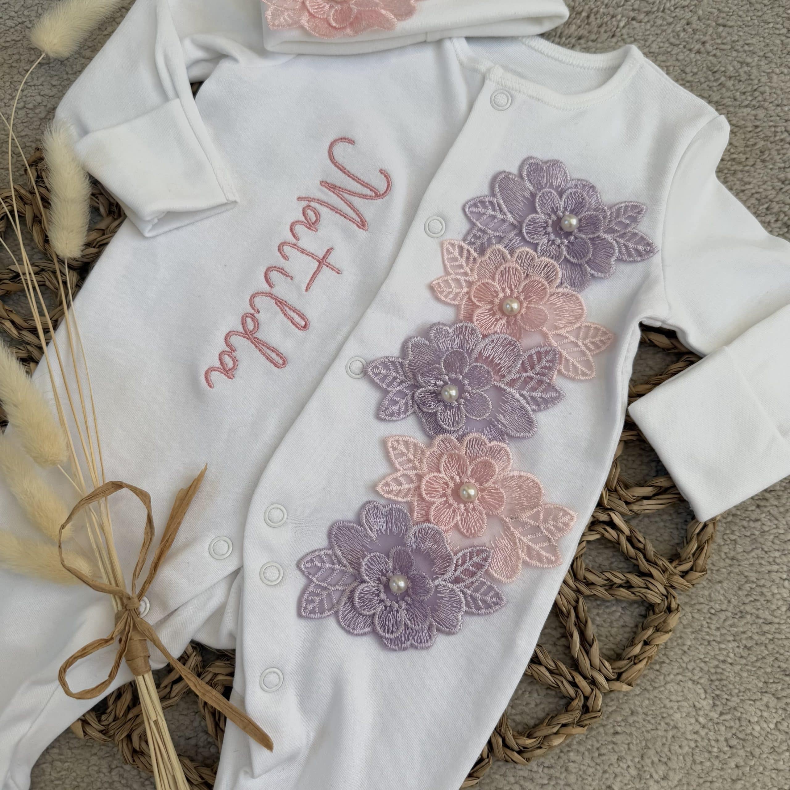 This is a beautiful unique handmade baby grow with 3D flower lace trims down the front made from 100% polyester you can have this with or with personalisation on the front. With a beanie hat is to match the baby grow.