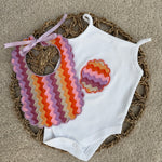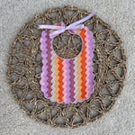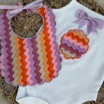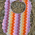 Baby girls hand made Stripe bib edged in pink, with a matching cotton vest with an appliqué on the front and front.