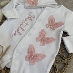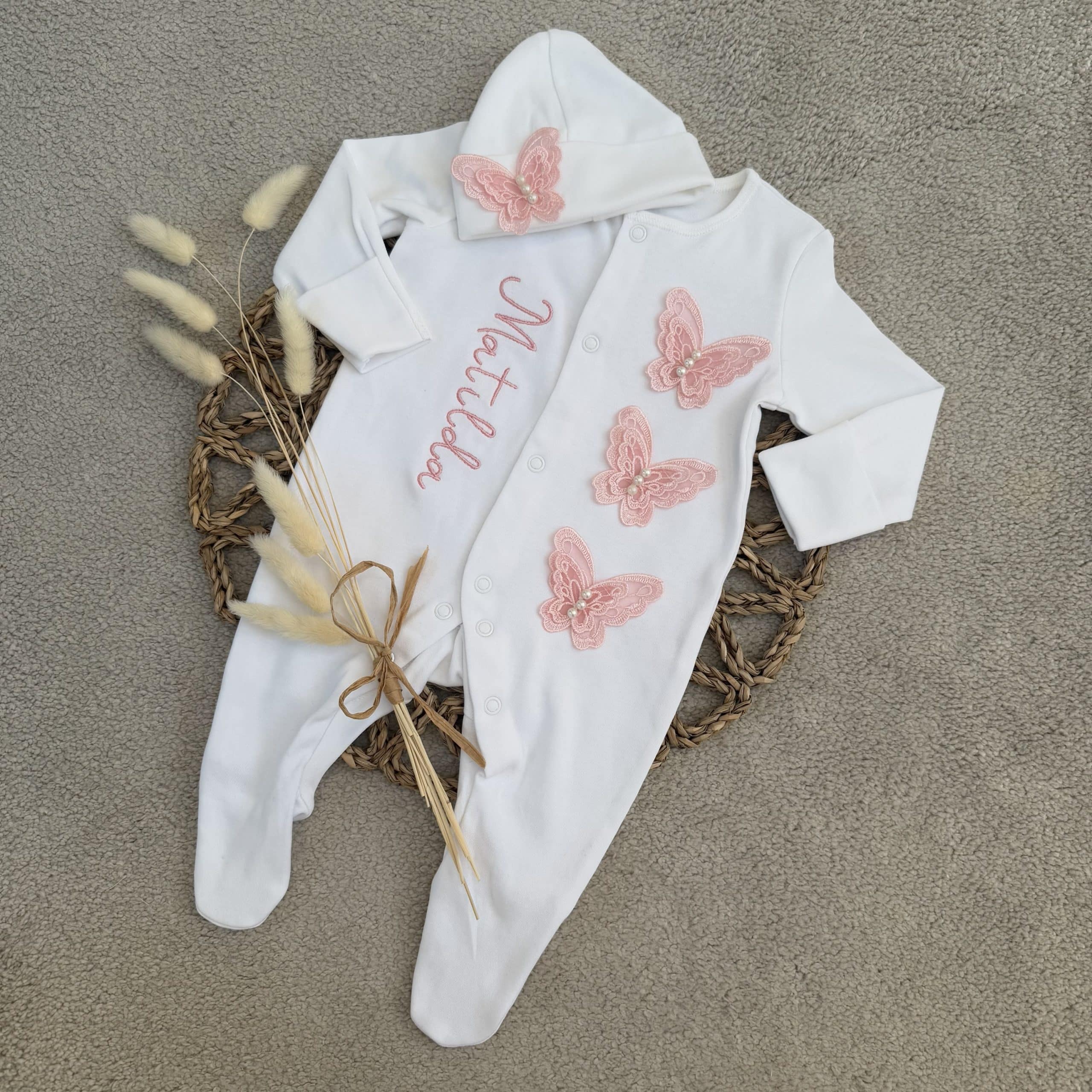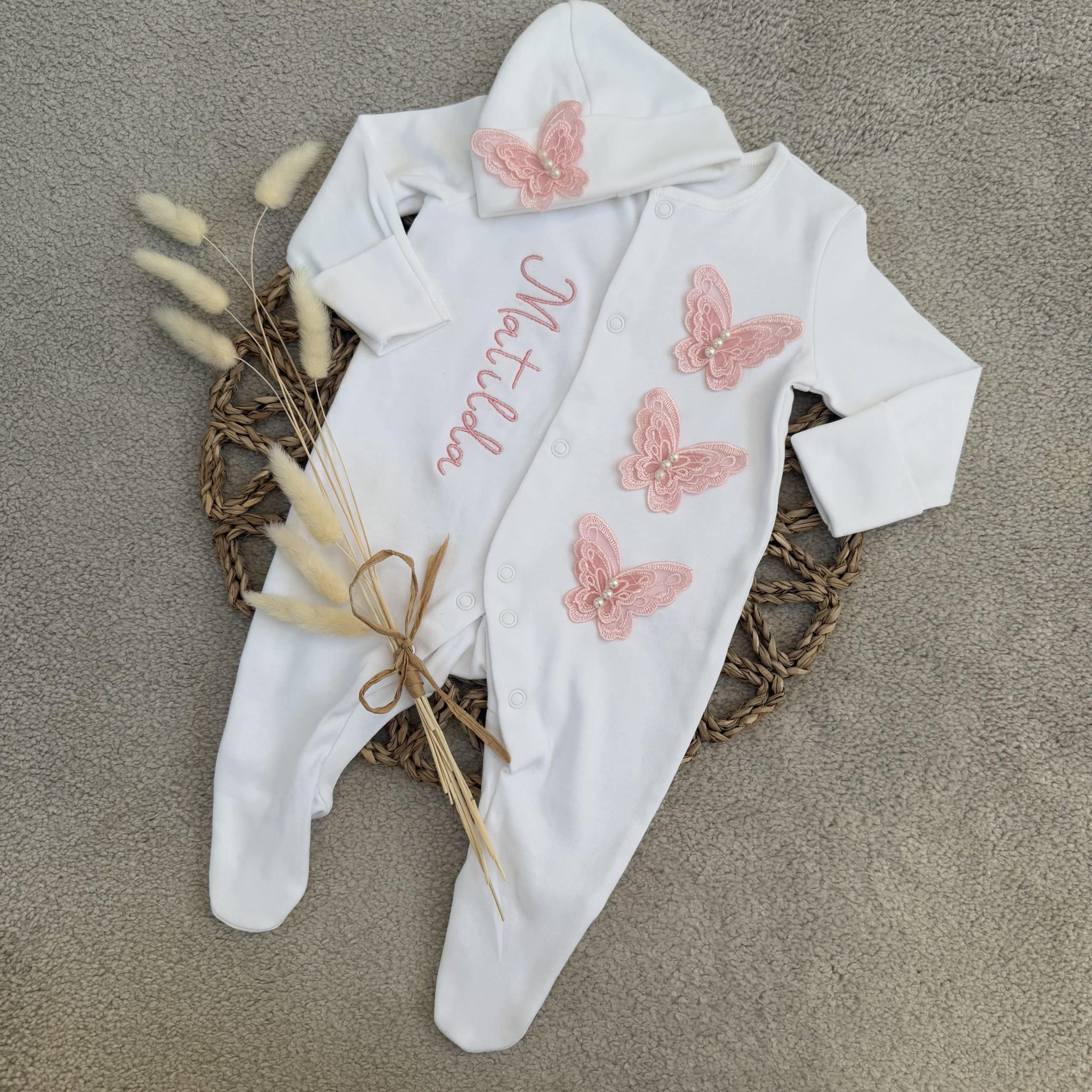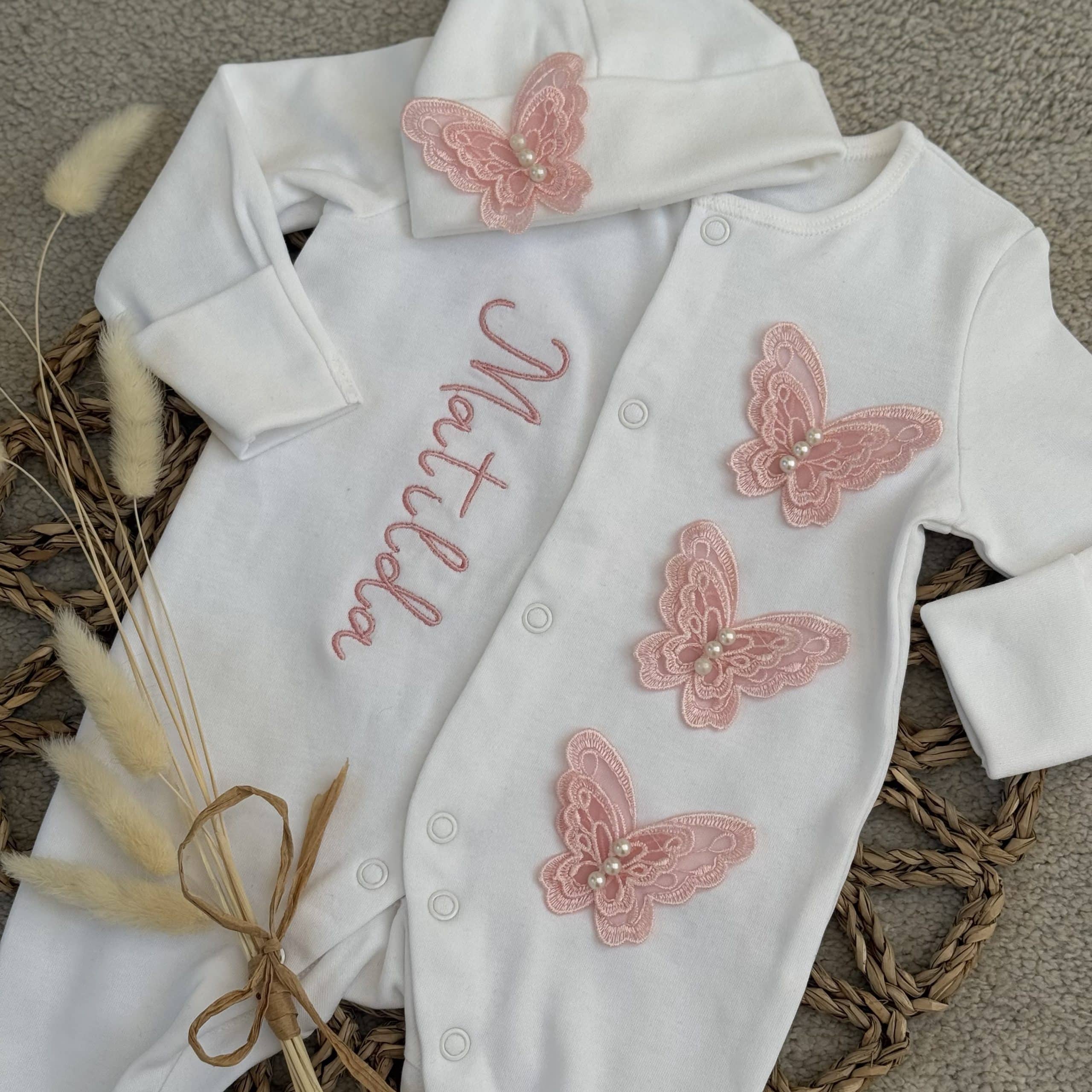 This is a beautiful unique handmade baby grow with 3D butterfly lace trims down the front made from 100% polyester you can have this with or with personalisation on the front. With a beanie hat is to match the baby grow.