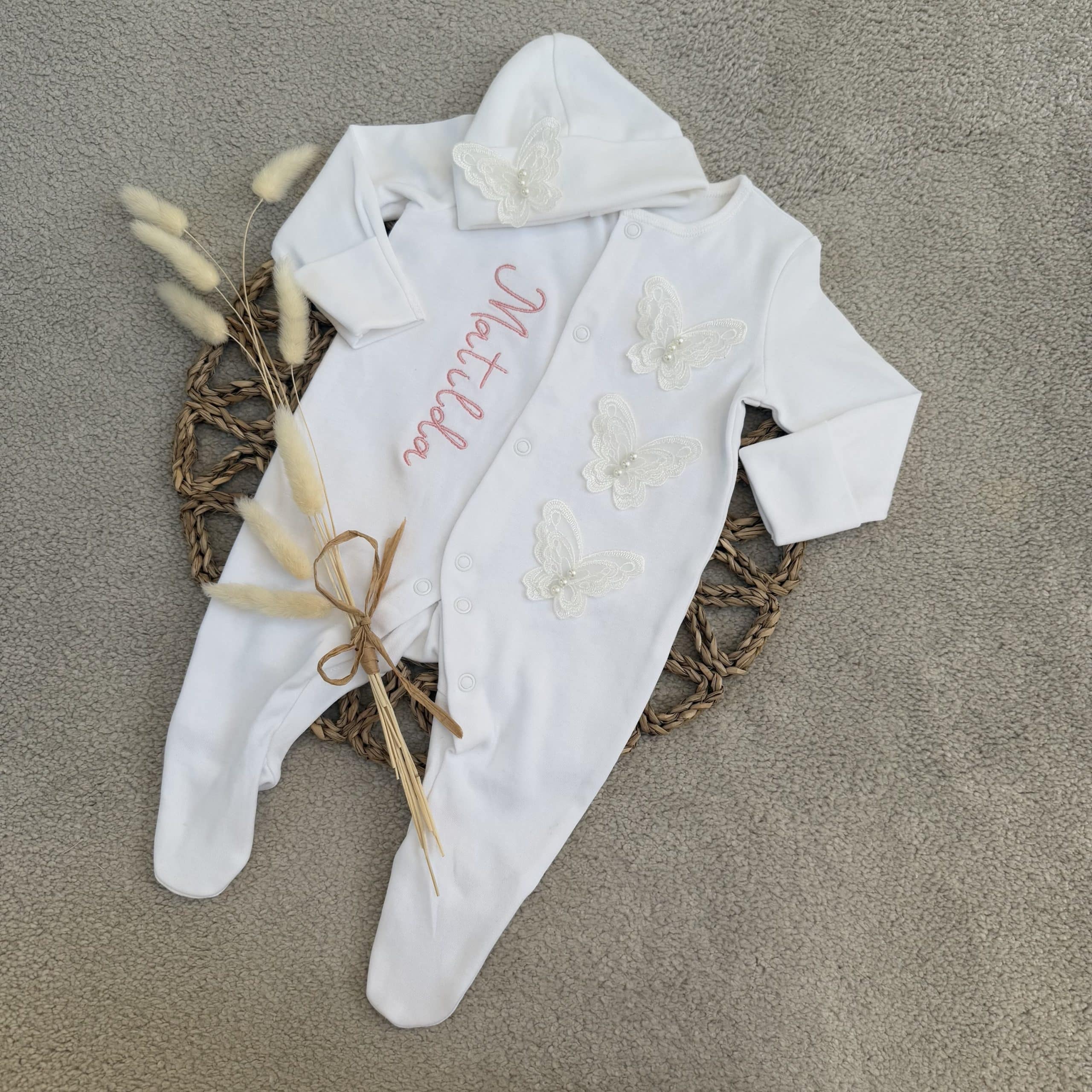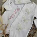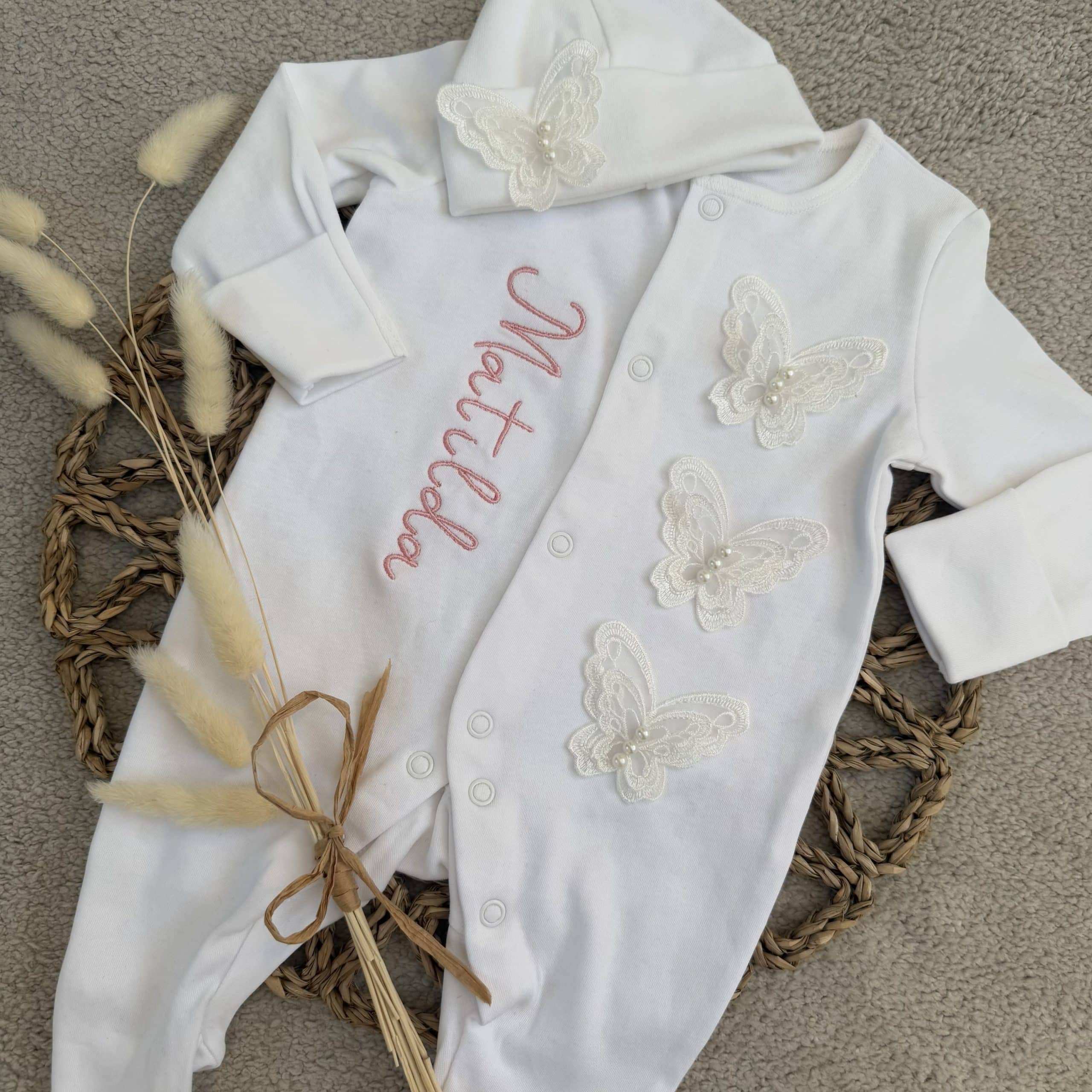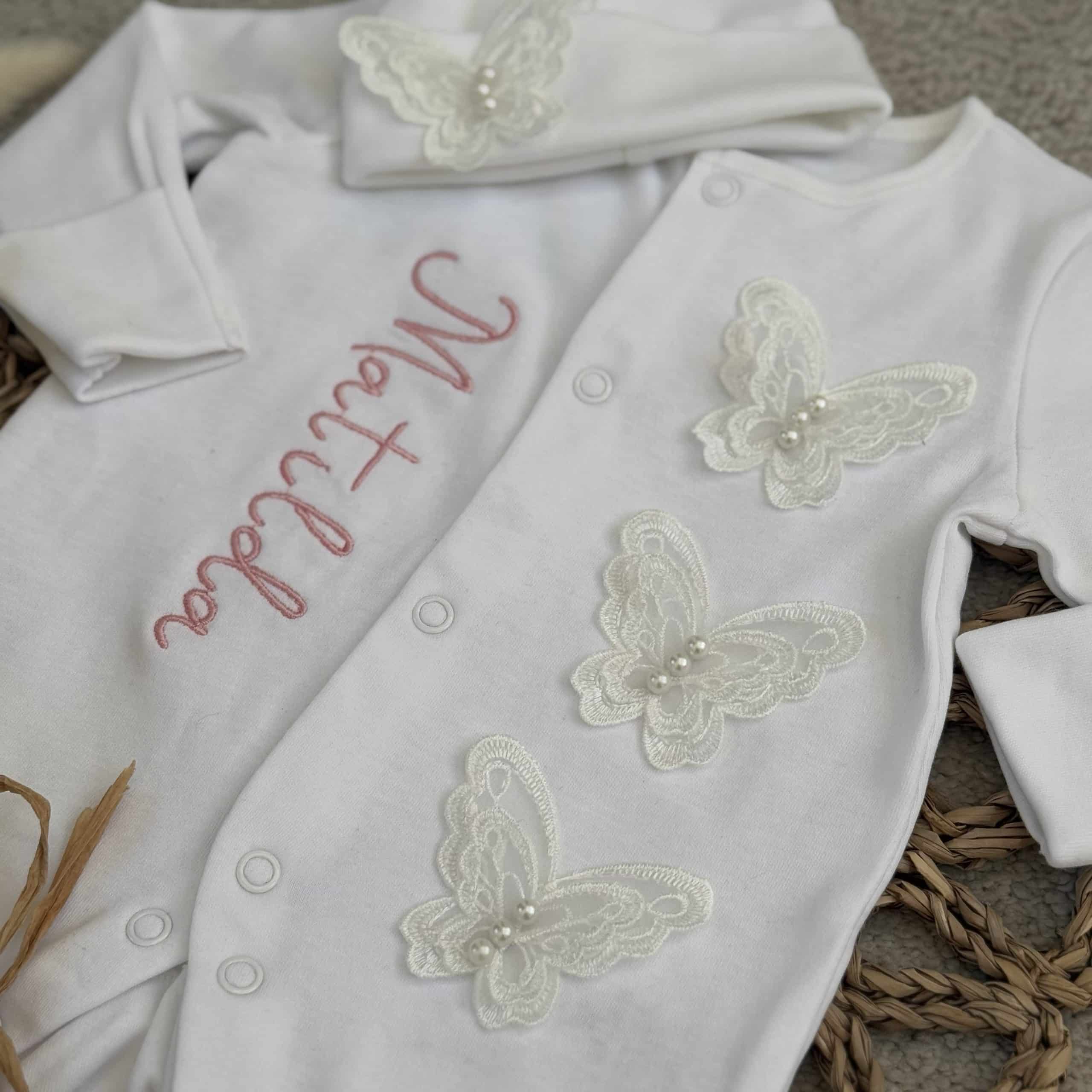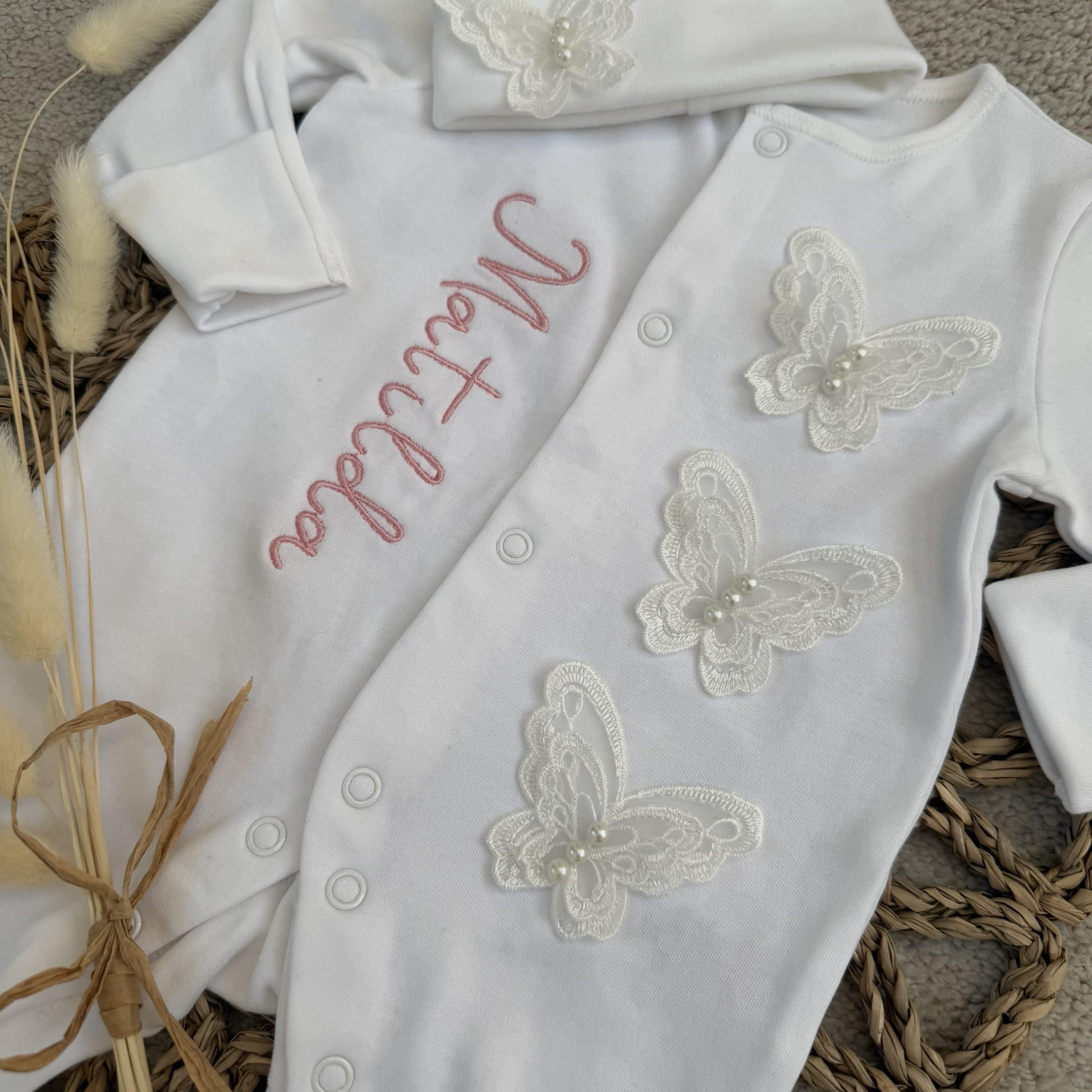 This is a beautiful unique handmade baby grow with 3D butterfly lace trims down the front made from 100% polyester you can have this with or with personalisation on the front. With a beanie hat is to match the baby grow.