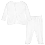 3-piece baby set, for baby boys and girls, made in beautifully soft, white cotton jersey. The top is edged in delicate scalloped trim and fastens on the back with poppers. The trousers have an elasticated waistband for comfort