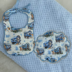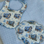 Wrap your little one in comfort and charm with this beautifully handcrafted baby set, featuring a soft baby blue waffle-textured blanket and a matching bib. Both pieces showcase a delightful vintage-style wagon and baby print appliqué, carefully stitched for durability and style. The bib is finished with a satin blue ribbon tie for an elegant touch and adjustable fit.