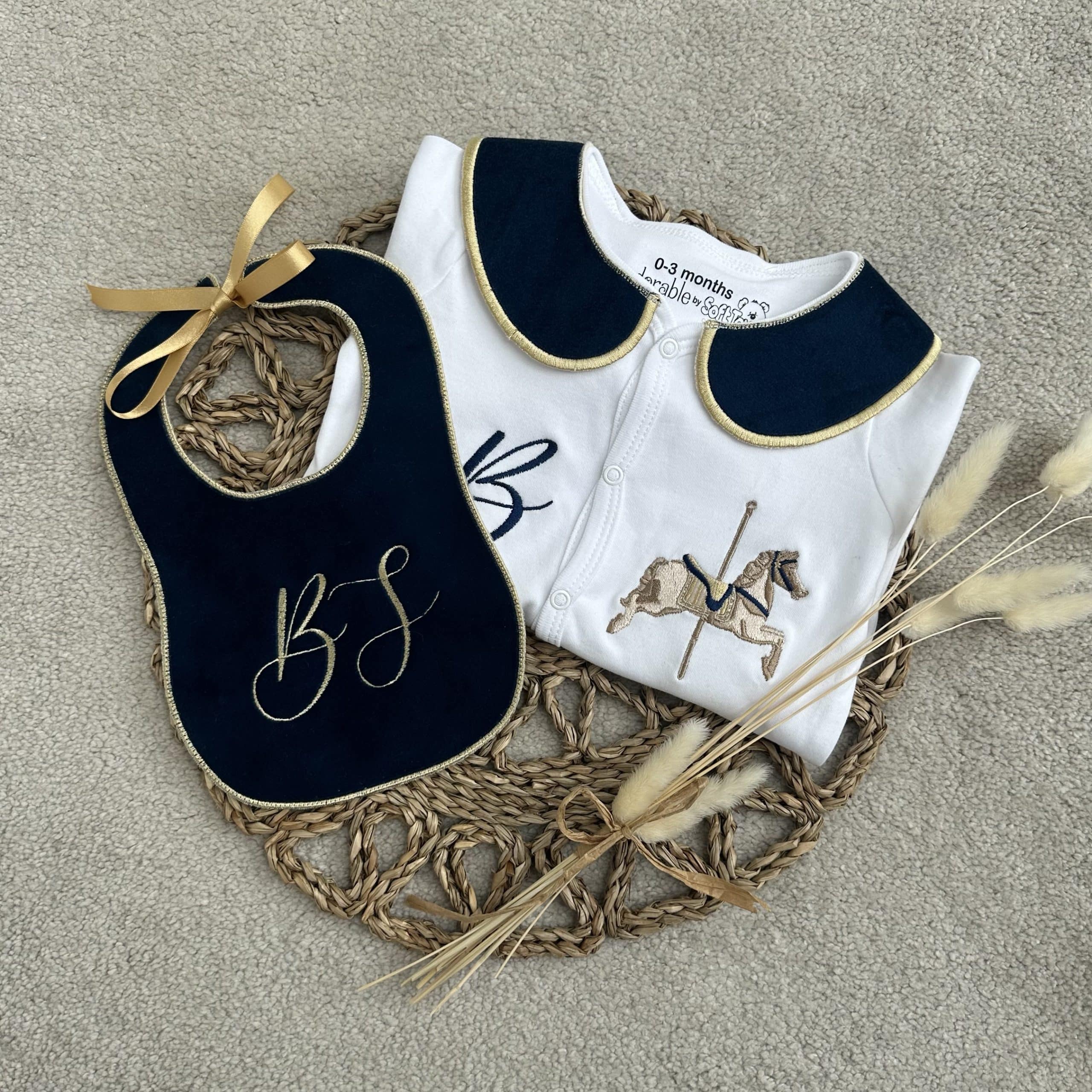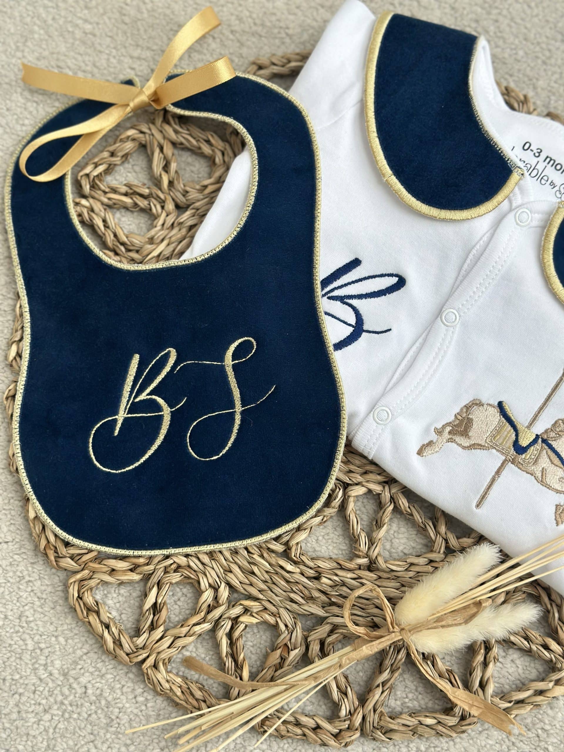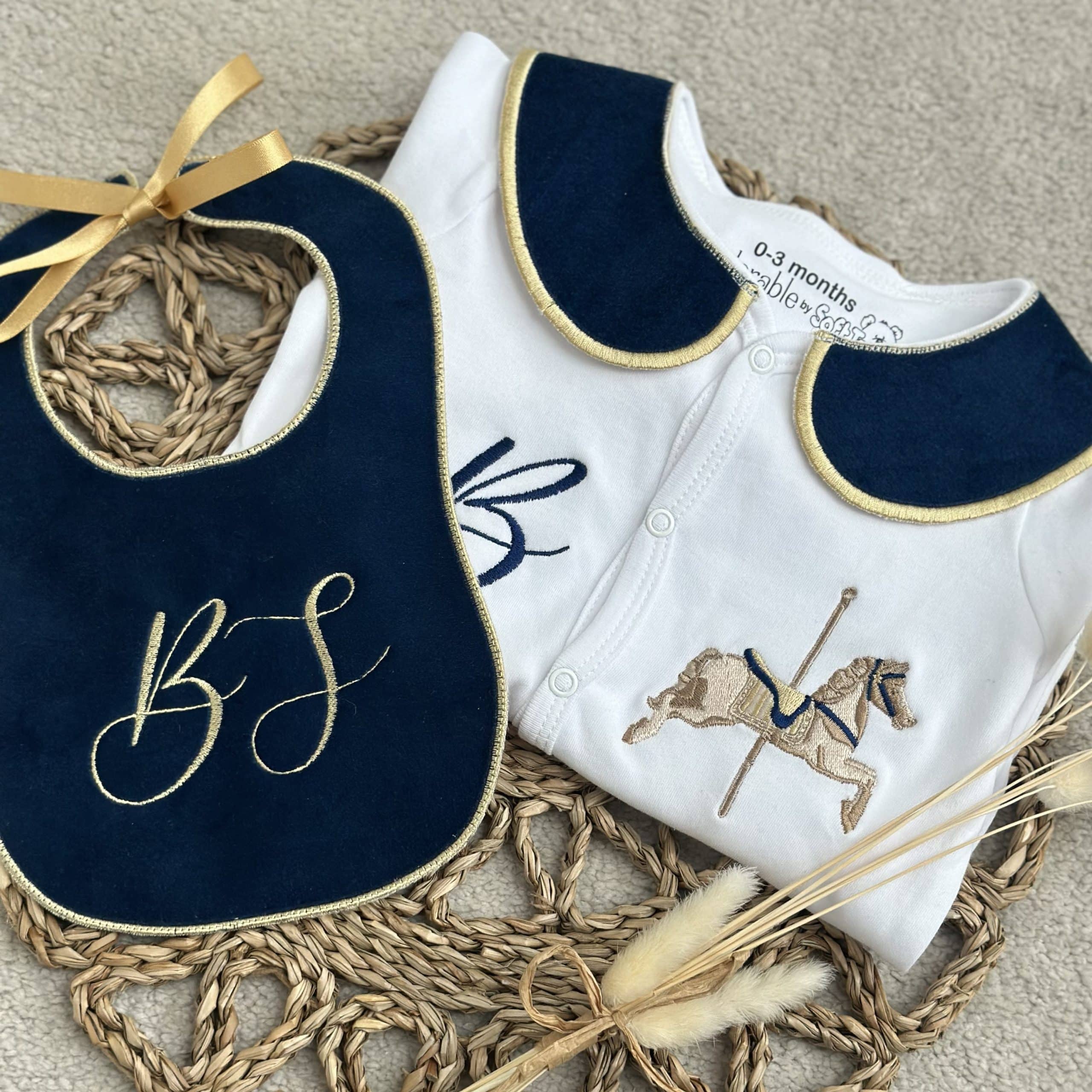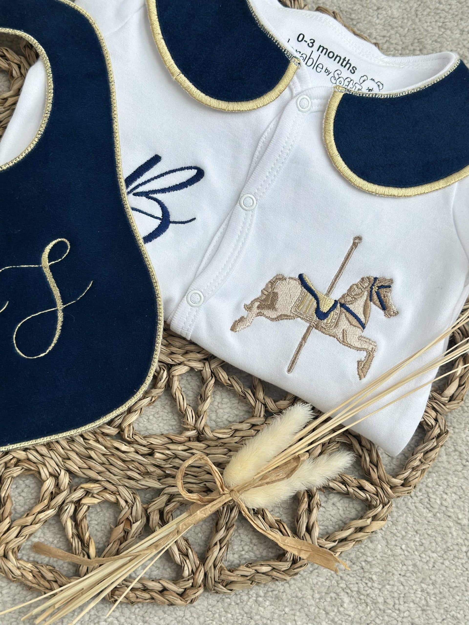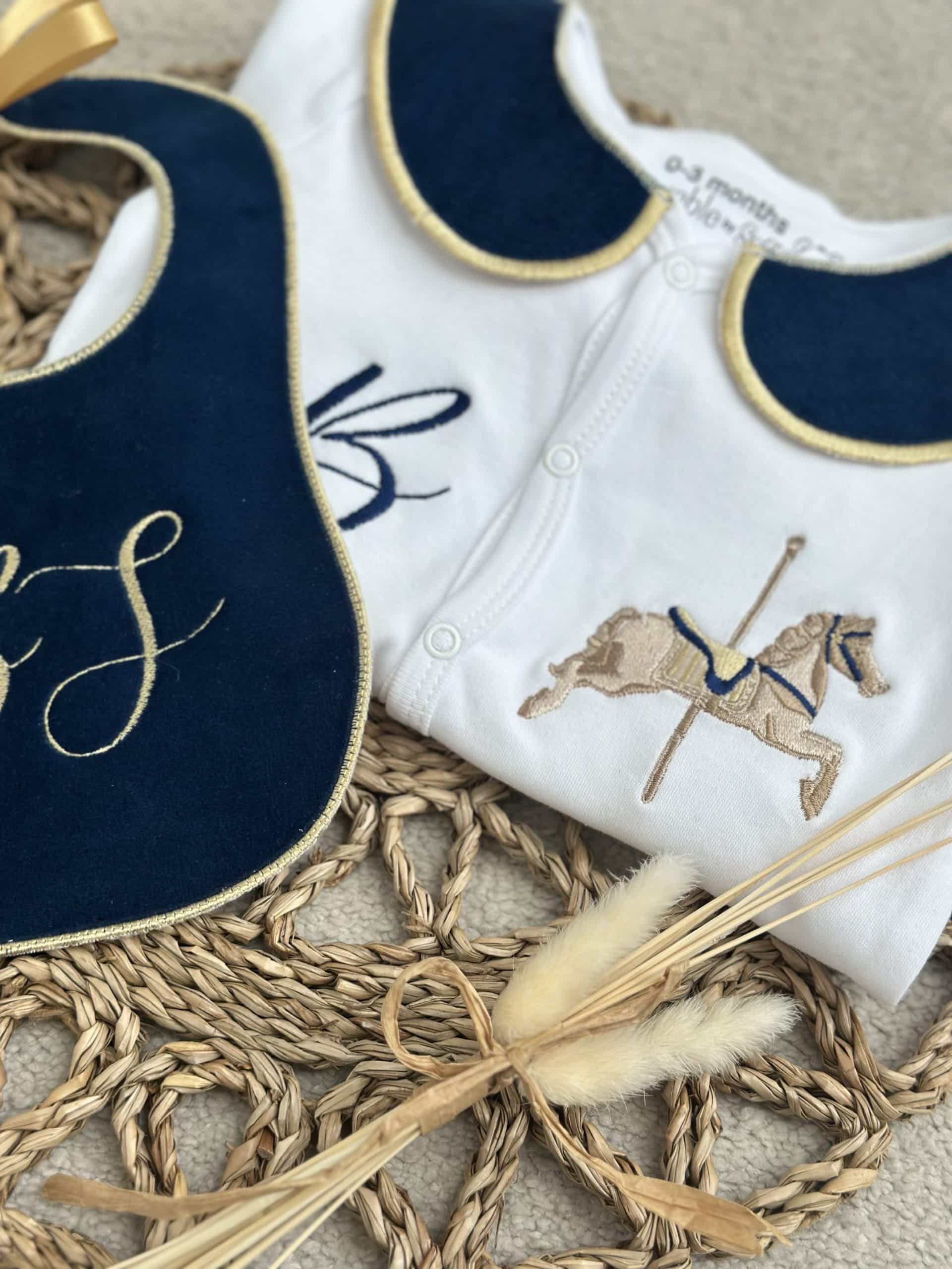This handmade sleepsuit set is a charming and cozy choice for your little one. Crafted with love and care, the set features a soft, comfortable sleepsuit with a luxurious velvet collar, adding an elegant touch to the overall design. The included handmade bib is adorned with an embroidered horse, giving it a whimsical, vintage-inspired look that’s both adorable and timeless.