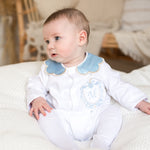 Boys Satin Crest Handmade Sleepsuit & Bib Set