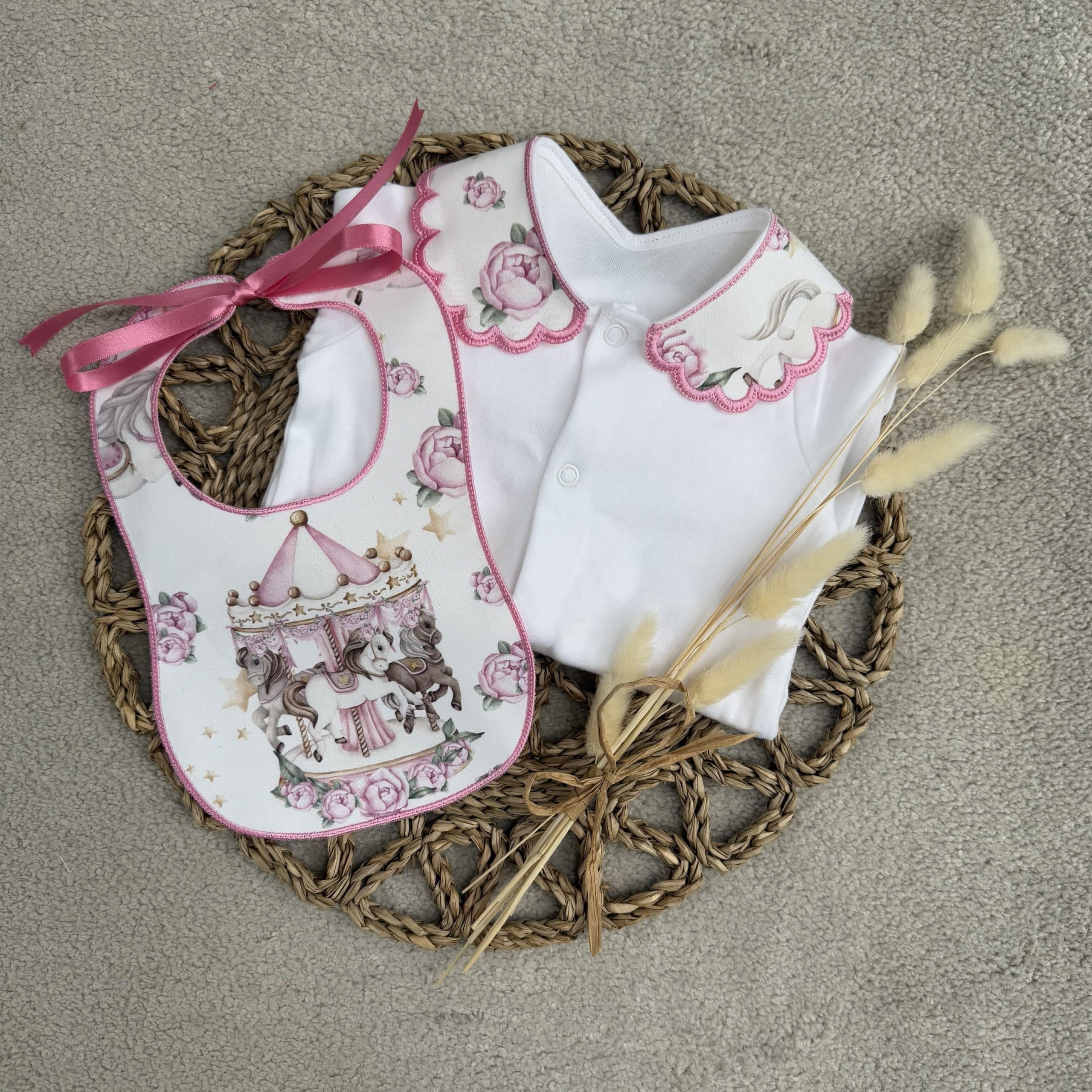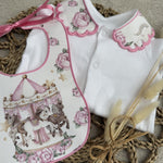 Girls Bright Pink Carousel Handmade Sleepsuit And Bib
