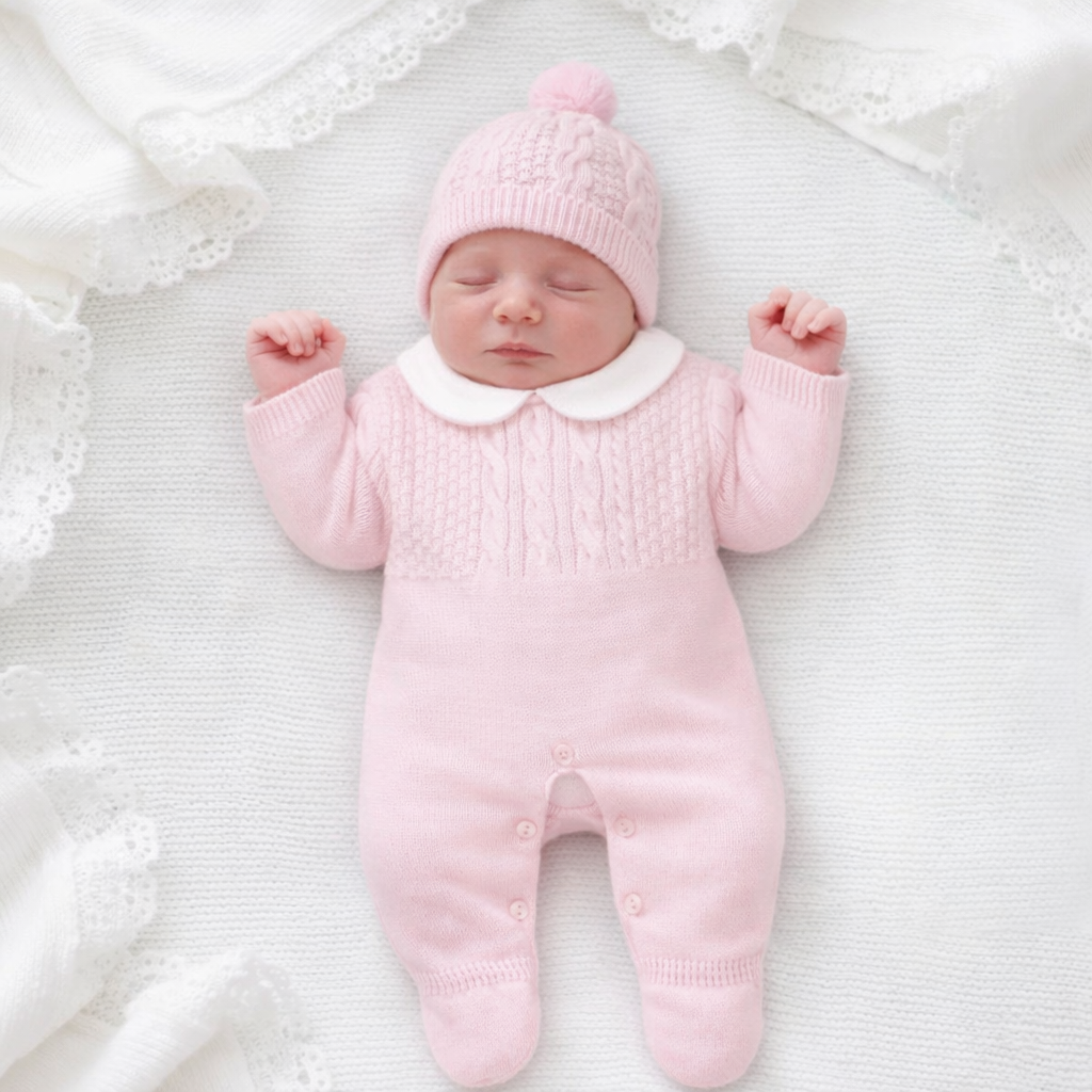 Beautiful Cable & basket weave pattern romper with Collar comes with a Cute Bobble Hat with cable knitted pattern Manufactured in Portugal for Dandelion