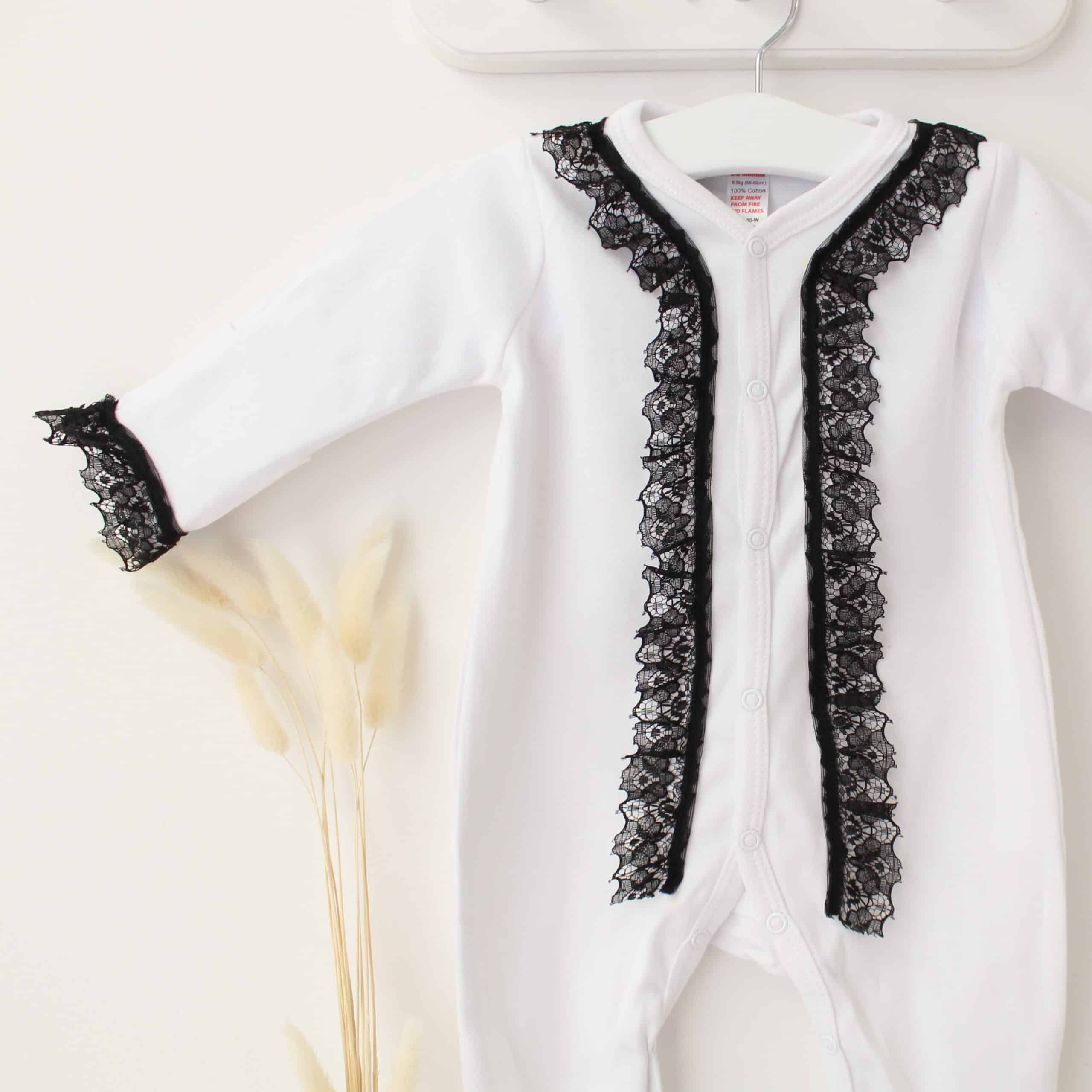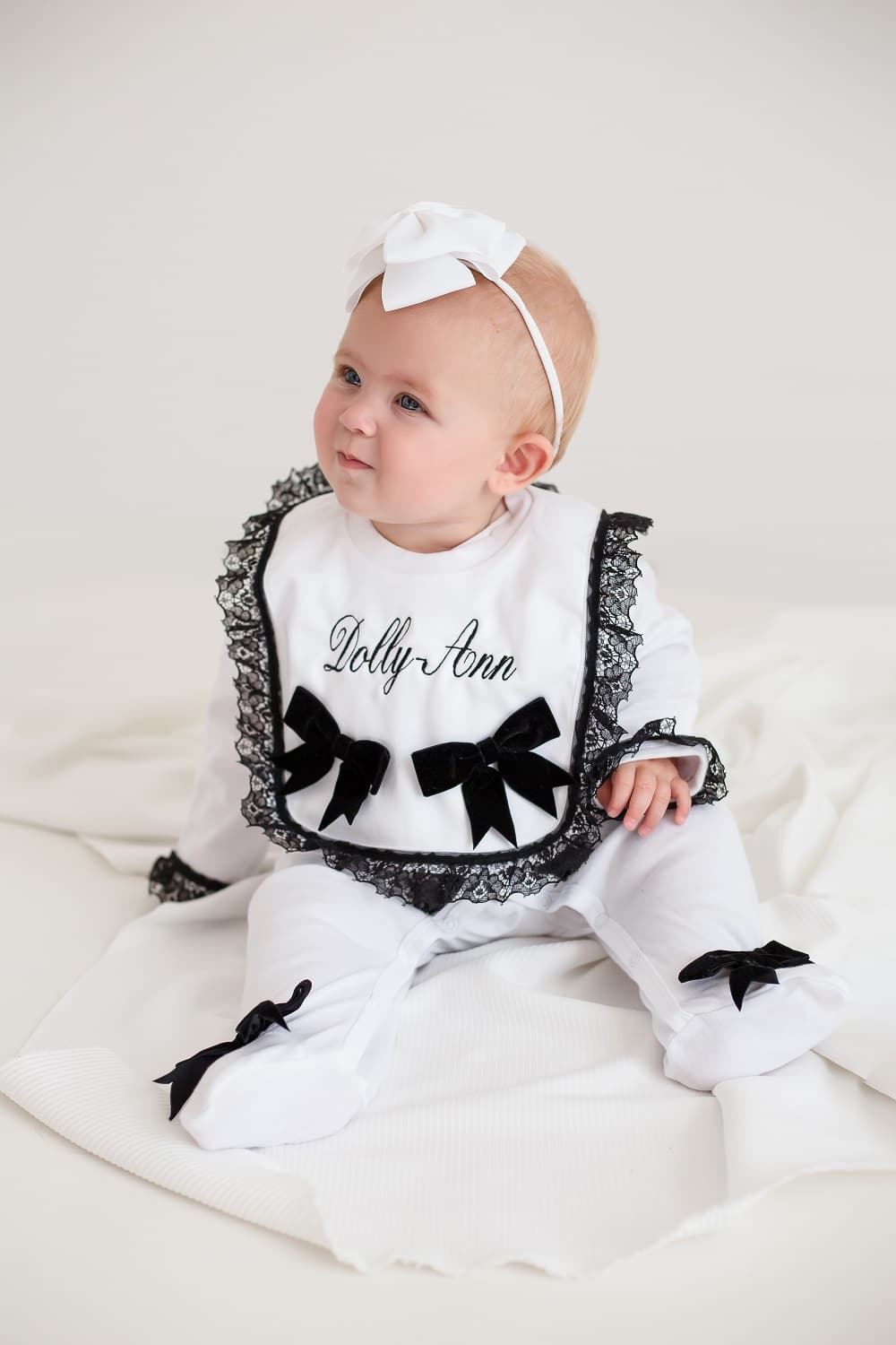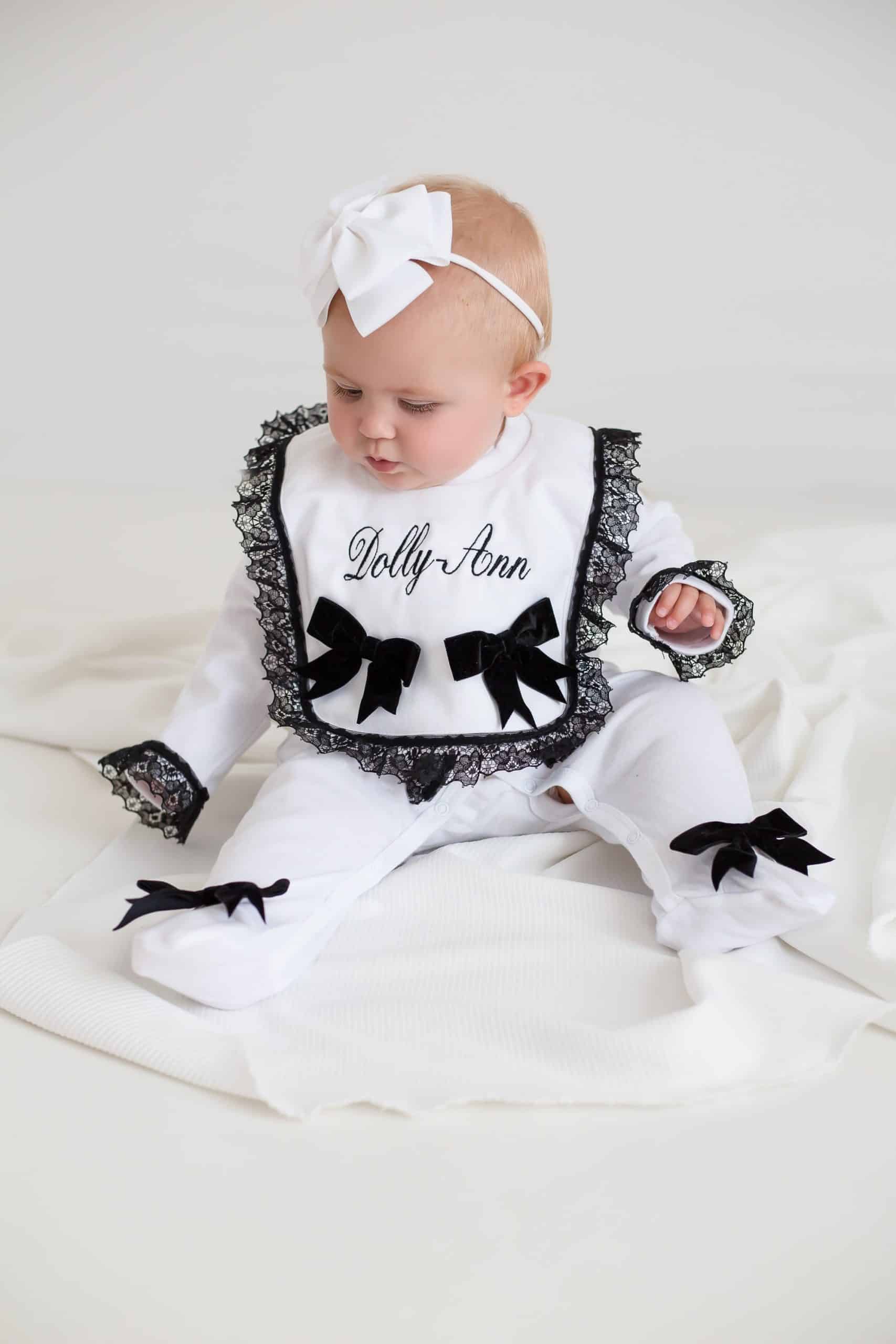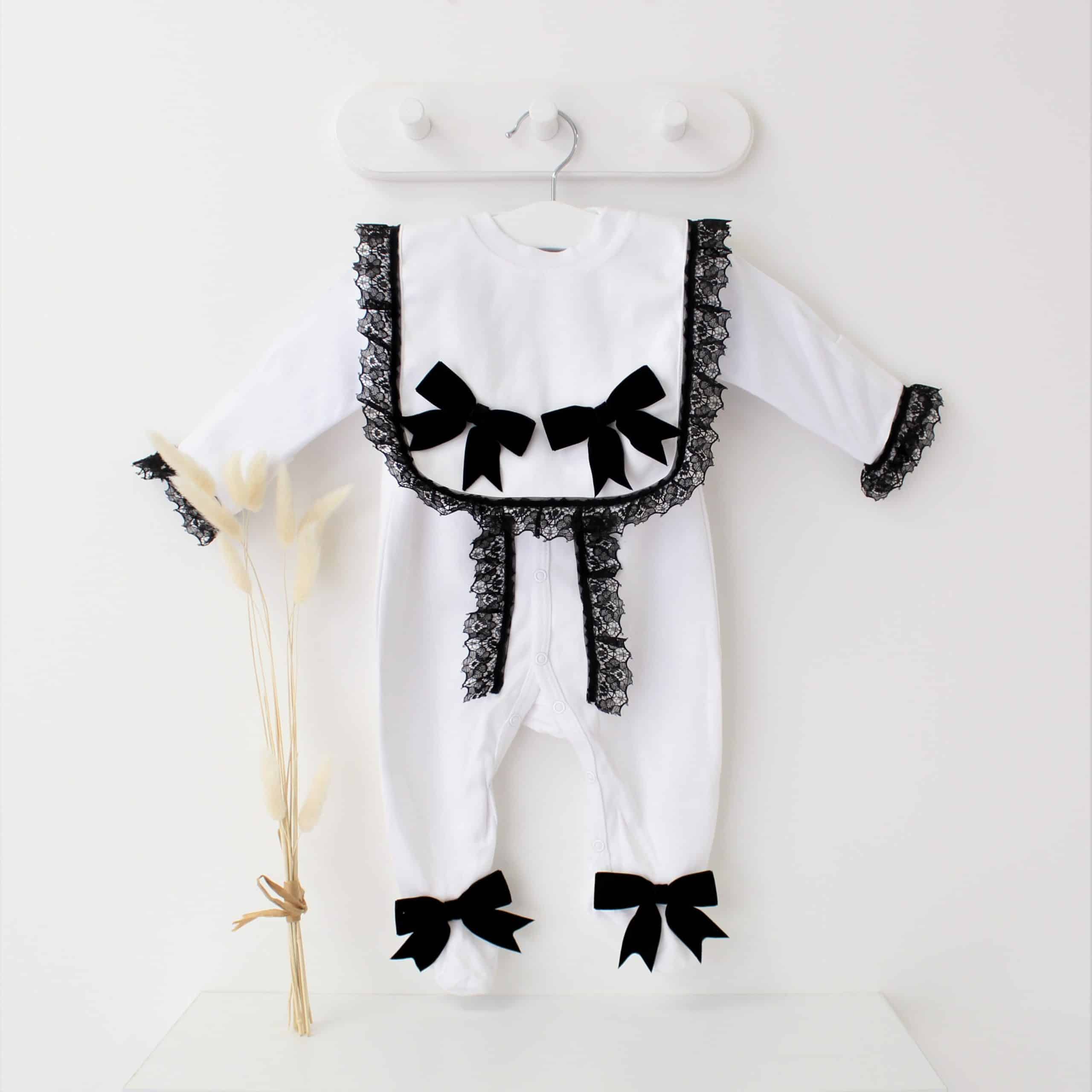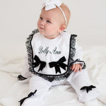 This beautiful unique handmade sleepsuit is just perfect! with a lace frill around the collar and down the front with frills around the cuffs, This handmade sleepsuit has a stunning Bows on the feet, and personalised name in embroidery down the front in Black (Extra). This sleepsuit comes with a matching bib with the matching lace frill around the edge and matching black bows, with name on the front in Black. (Extra)