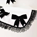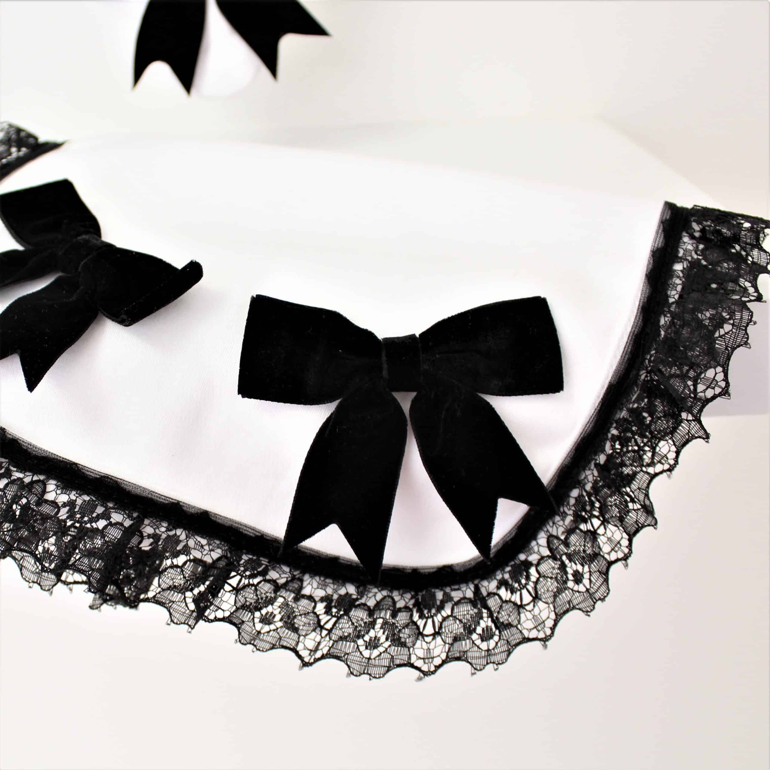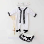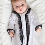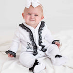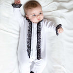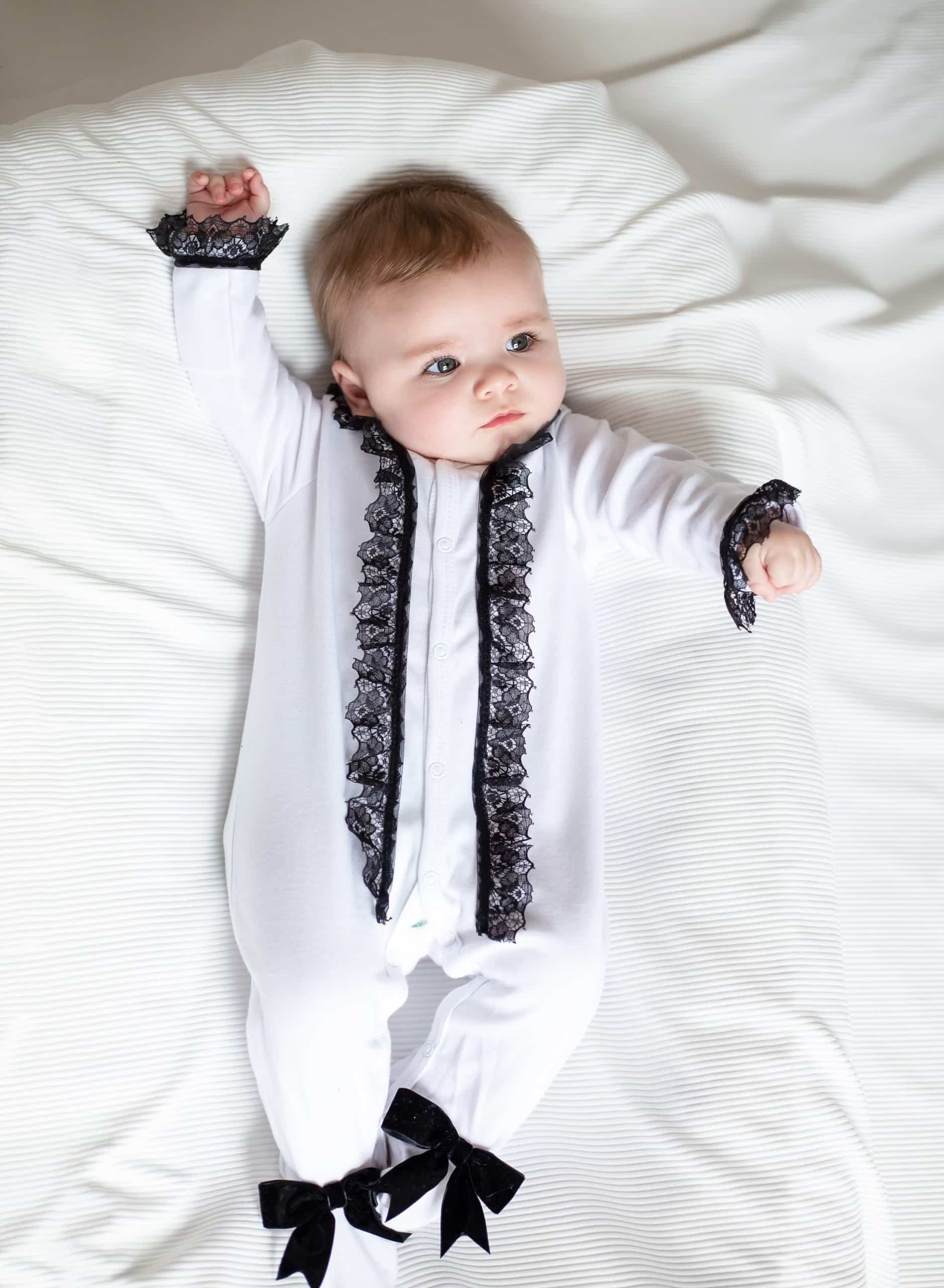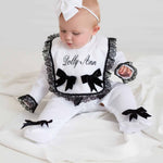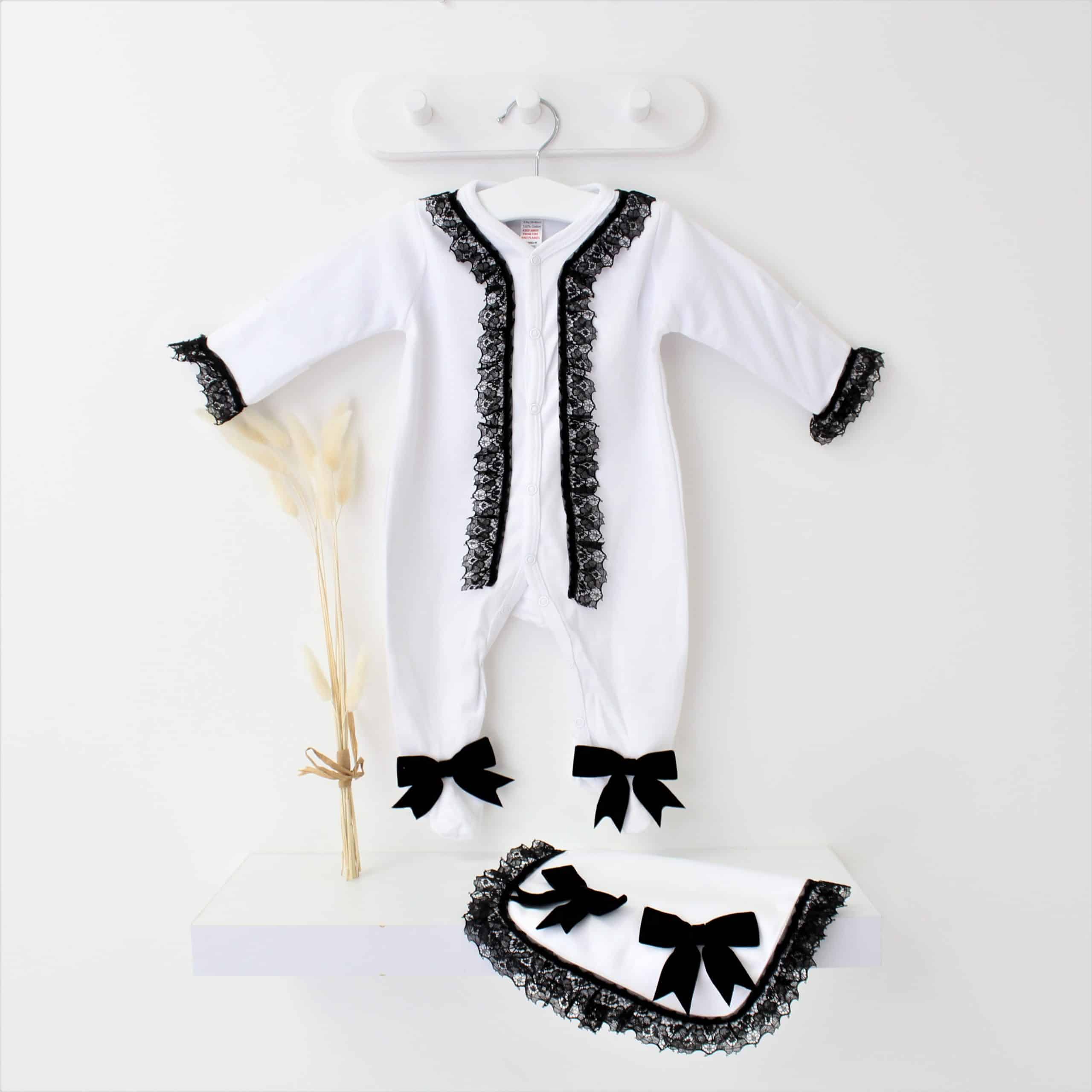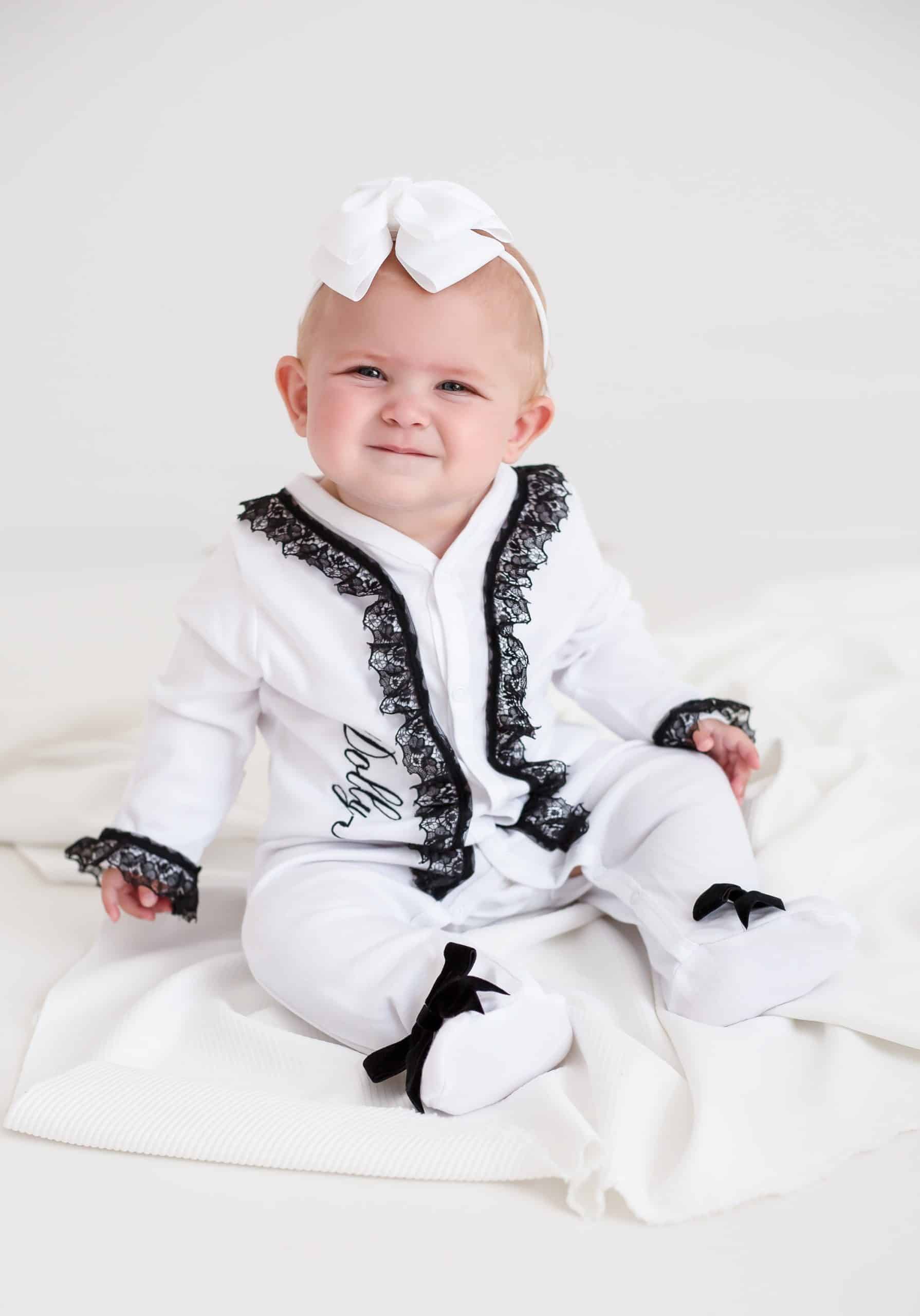 This beautiful unique handmade sleepsuit is just perfect! with a lace frill around the collar and down the front with frills around the cuffs, This handmade sleepsuit has a stunning Bows on the feet, and personalised name in embroidery down the front in Black (Extra). This sleepsuit comes with a matching bib with the matching lace frill around the edge and matching black bows, with name on the front in Black. (Extra)