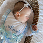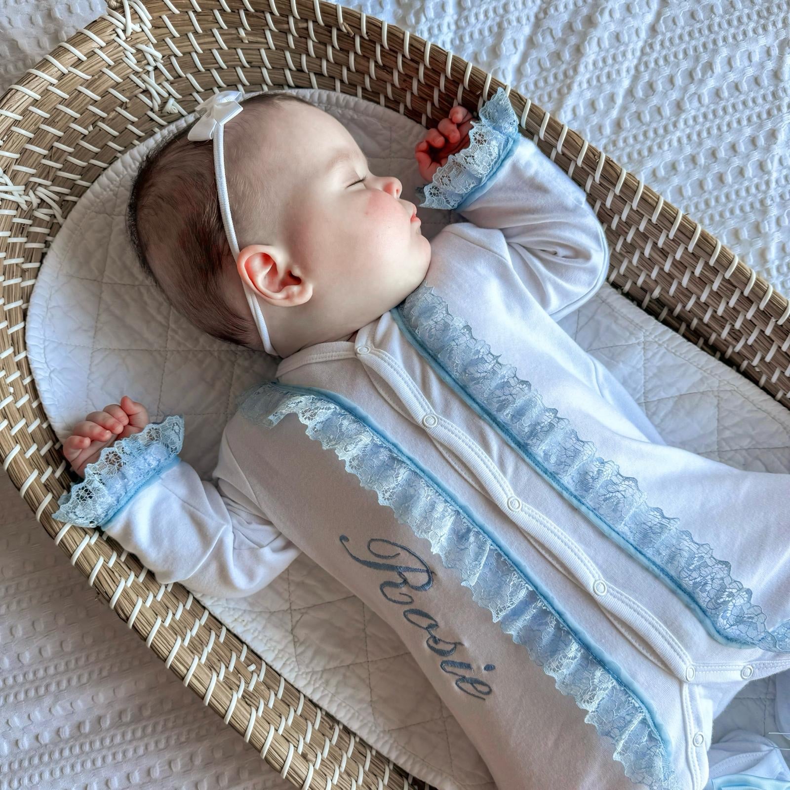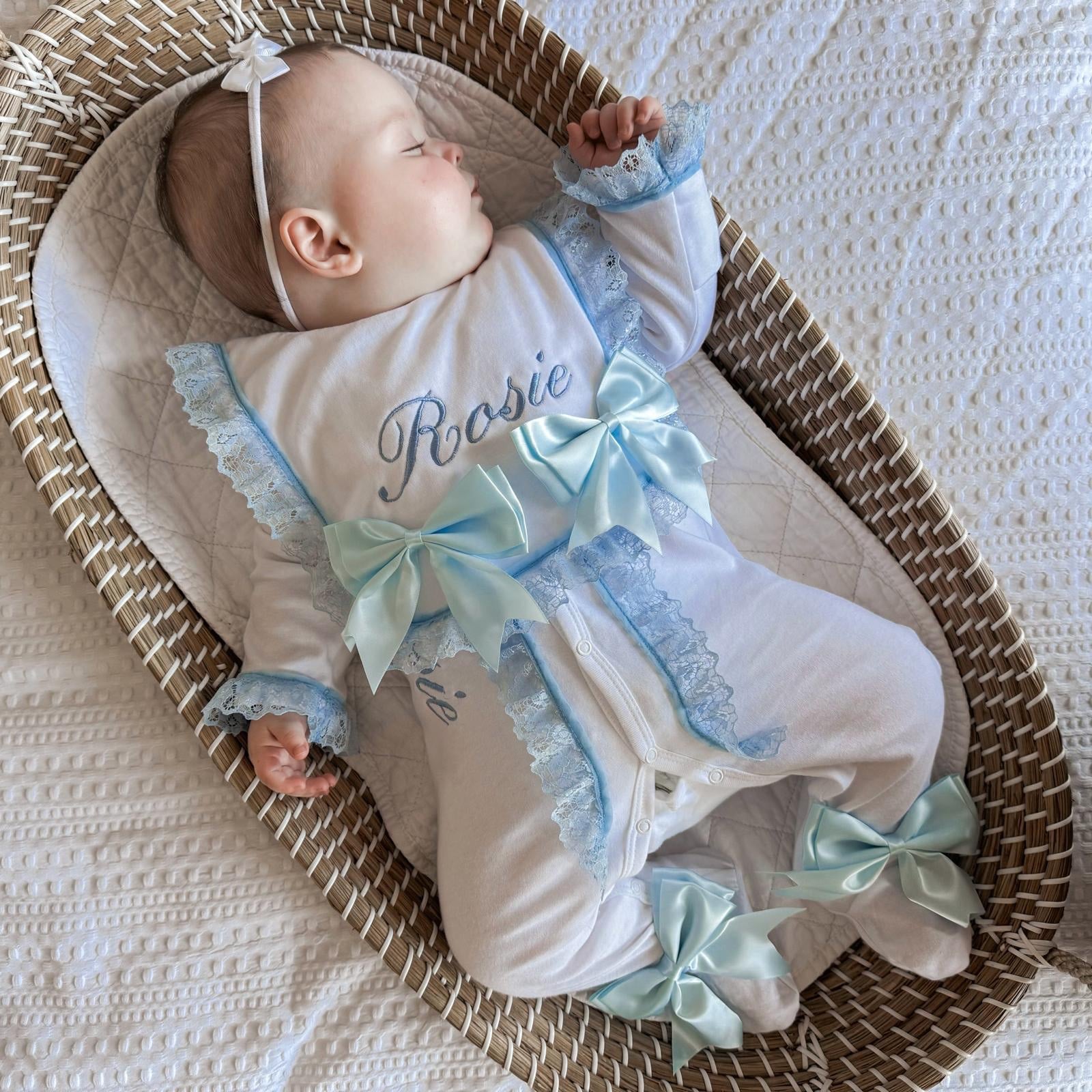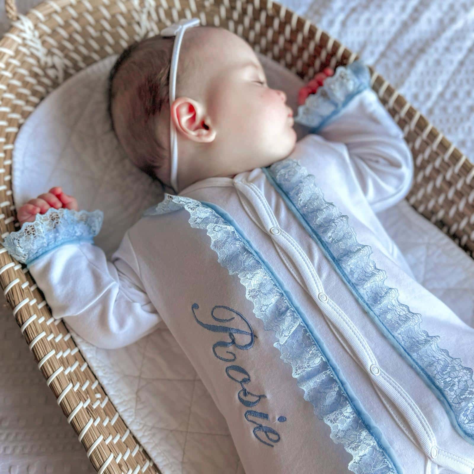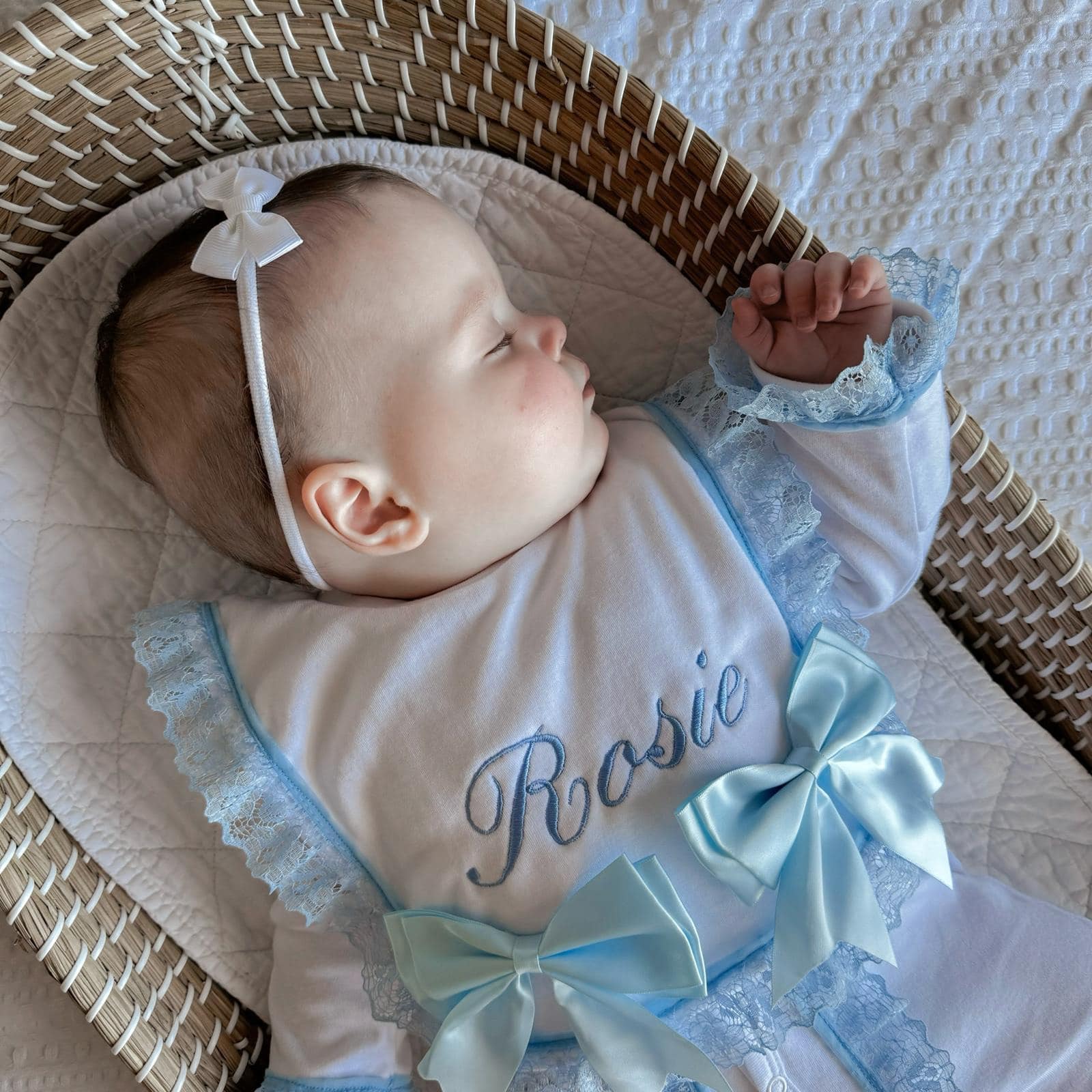 This beautiful unique handmade sleepsuit is just perfect! with a lace frill around the collar and down the front with frills around the cuffs, This handmade sleepsuit has a stunning Bows on the feet, and personalised name in embroidery down the front in Blue (Extra). This sleepsuit comes with a matching bib with the matching lace frill around the edge and matching blue bows, with name on the front in Blue. (Extra)