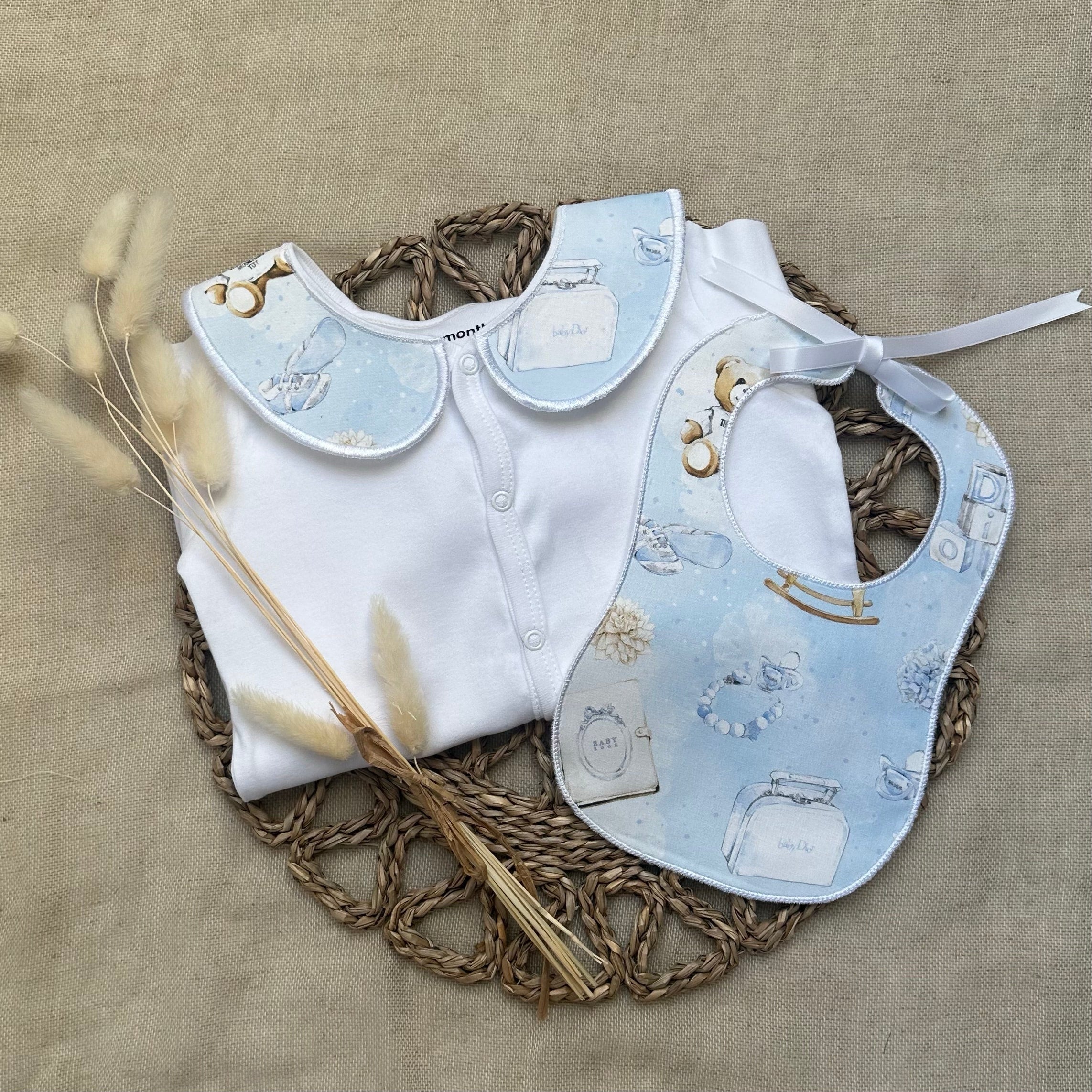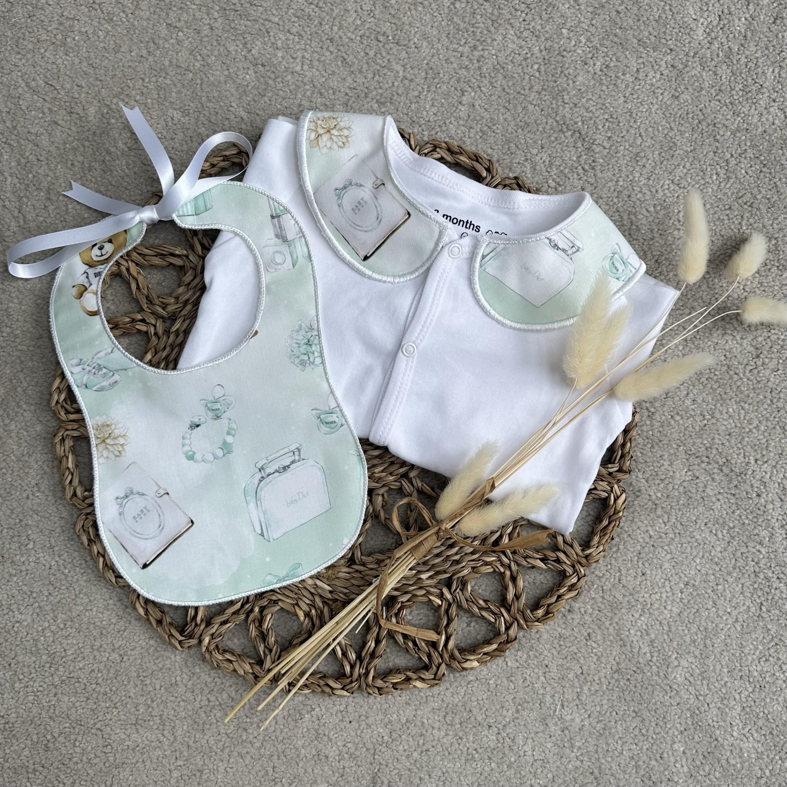 This is a beautiful unique handmade sleepsuit , with A handmade print collar and matching print bib this can be personalised with name embroidery on the bib and Front of sleepsuit..