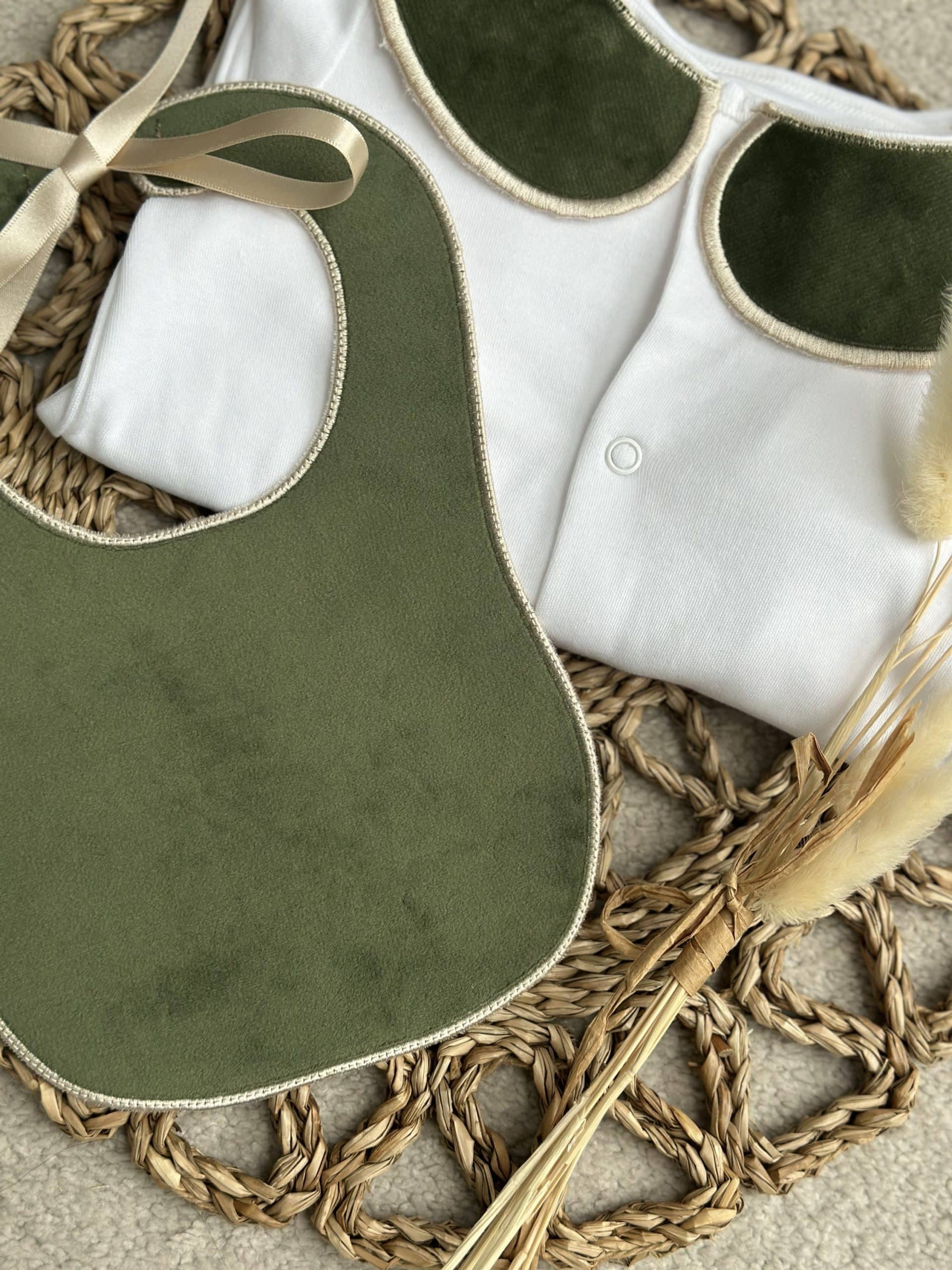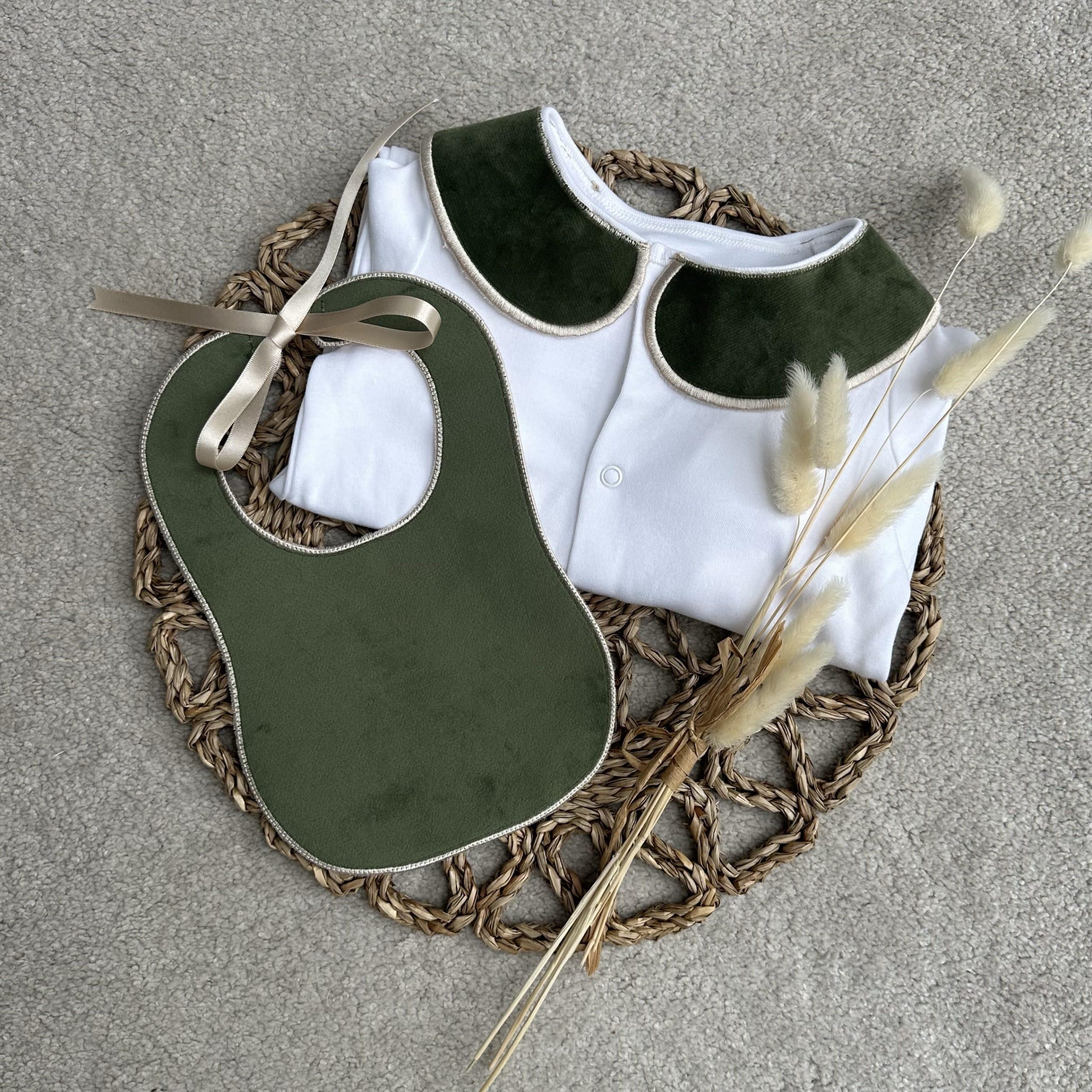 This is a beautiful unique handmade sleepsuit , with A handmade velvet collar and velvet bib this is personalised with name embroidery on the bib and sleepsuit.