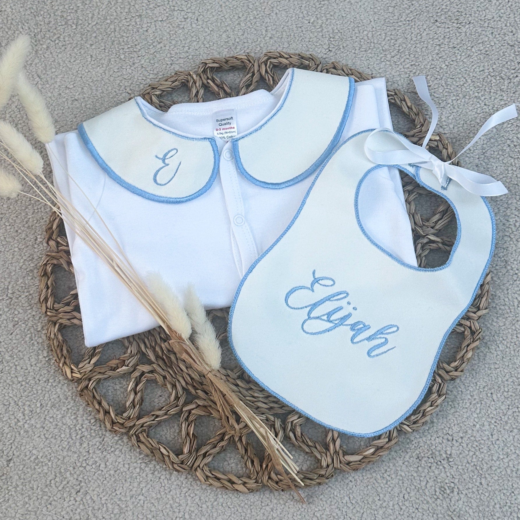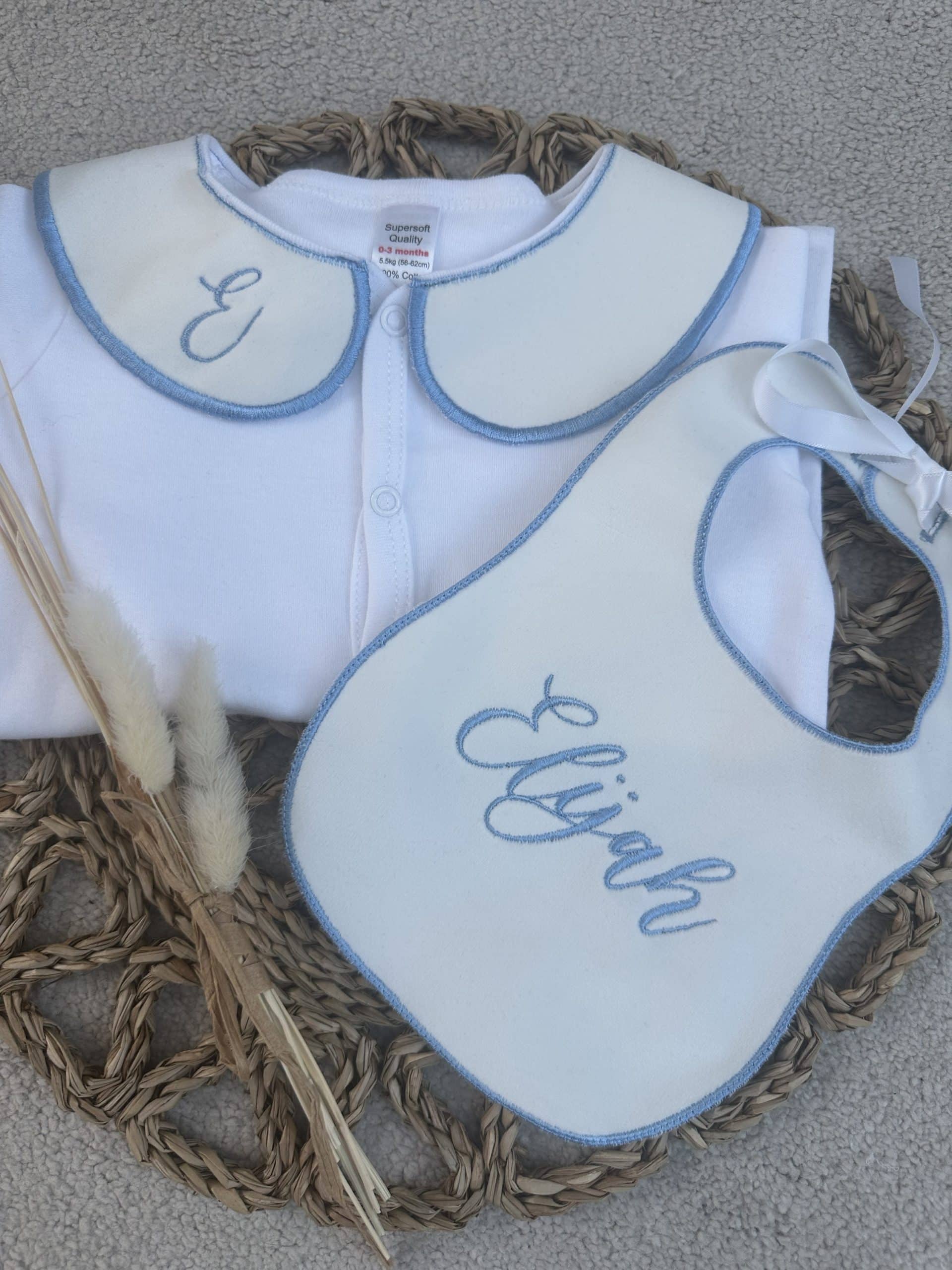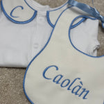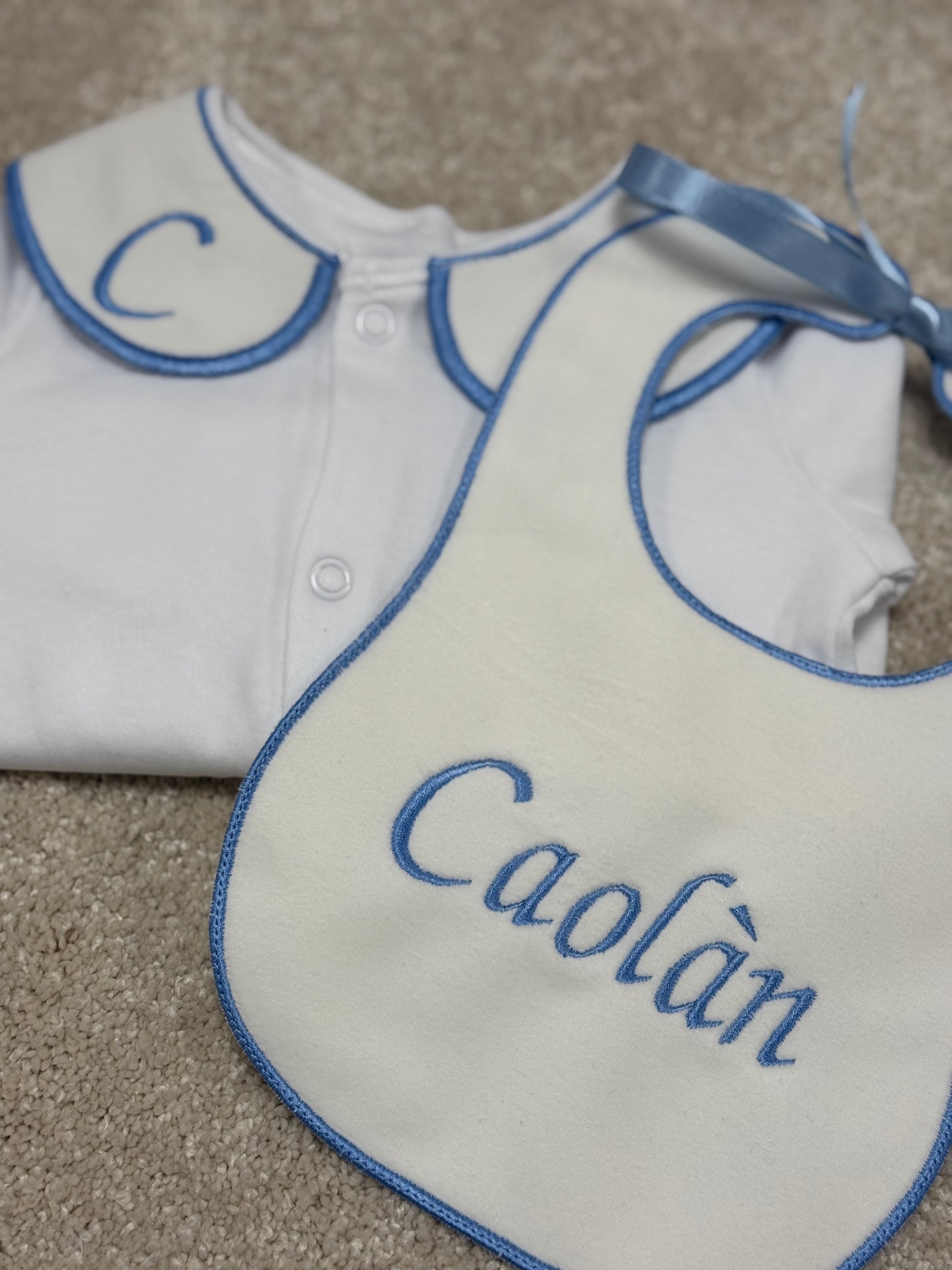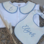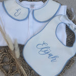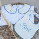 Perfect Little Thing Boys White & Blue Handmade Sleepsuit And Bib