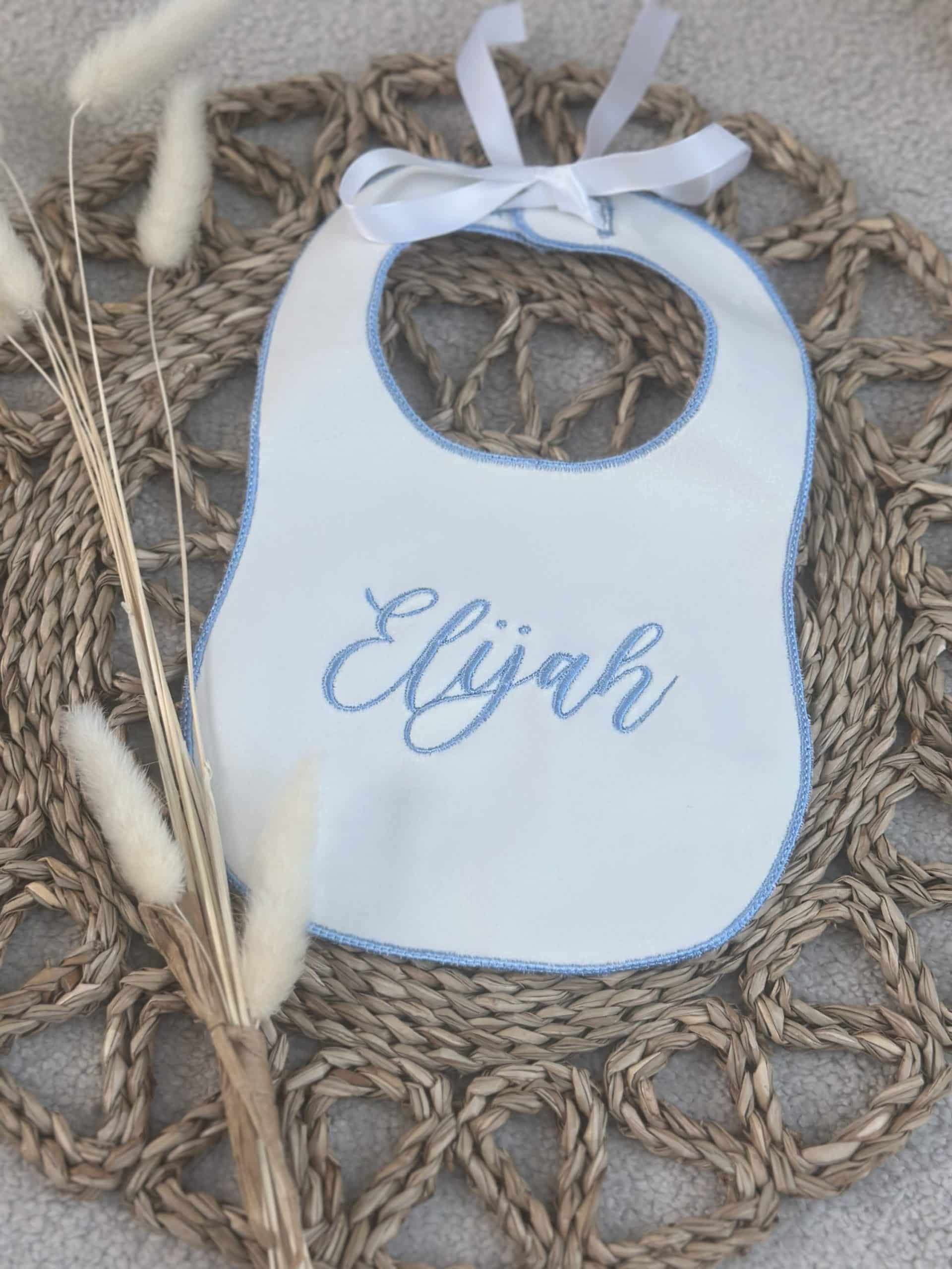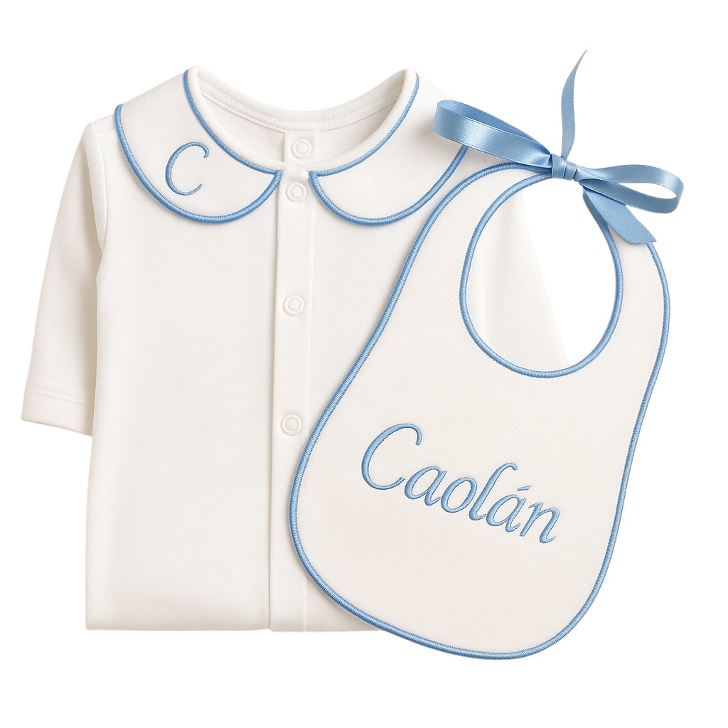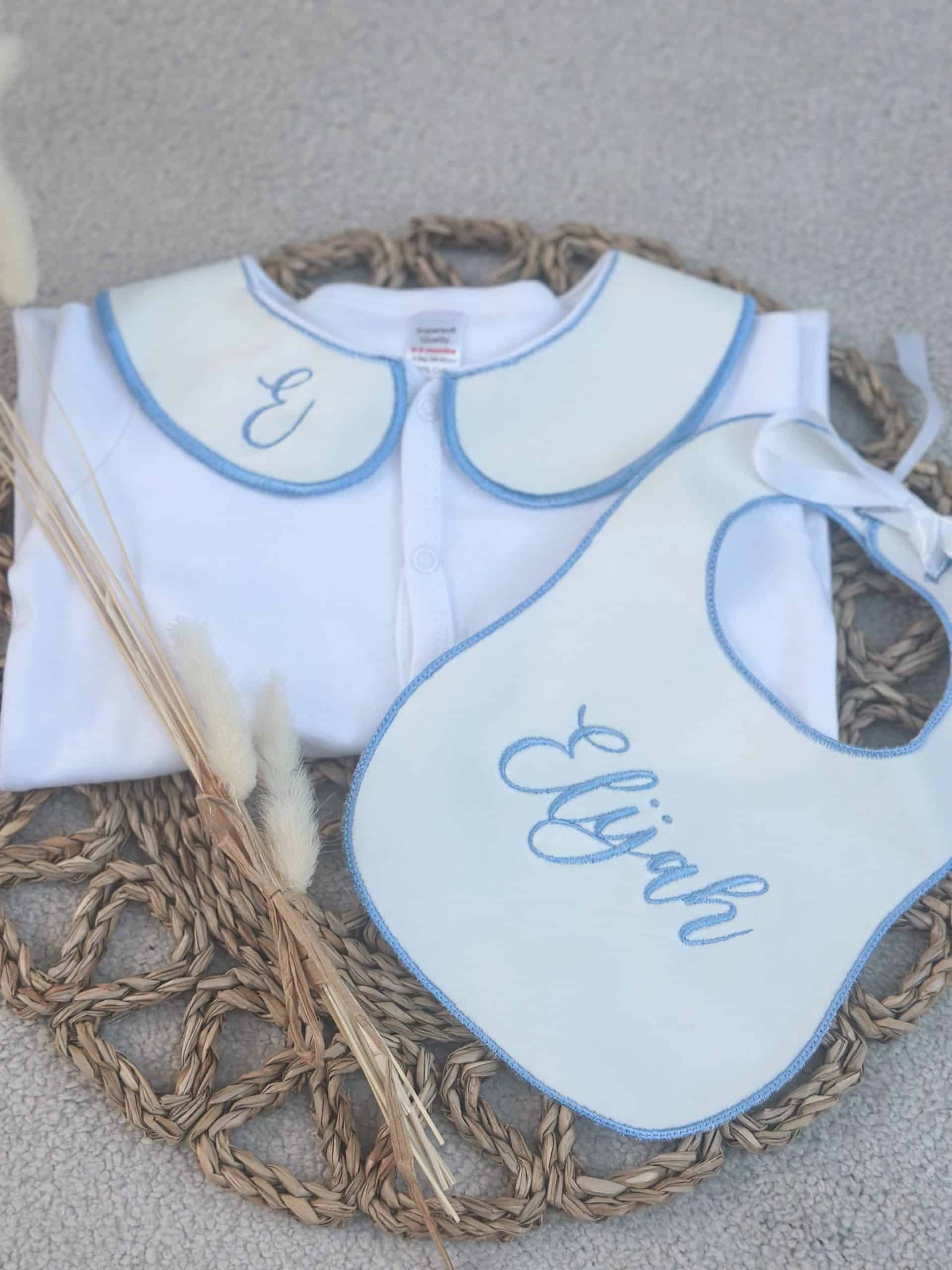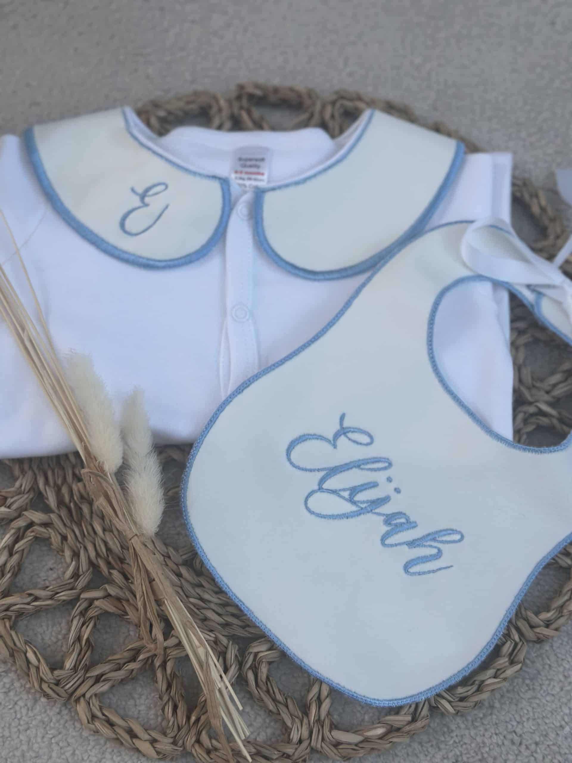 Perfect Little Thing Boys White & Blue Handmade Sleepsuit And Bib