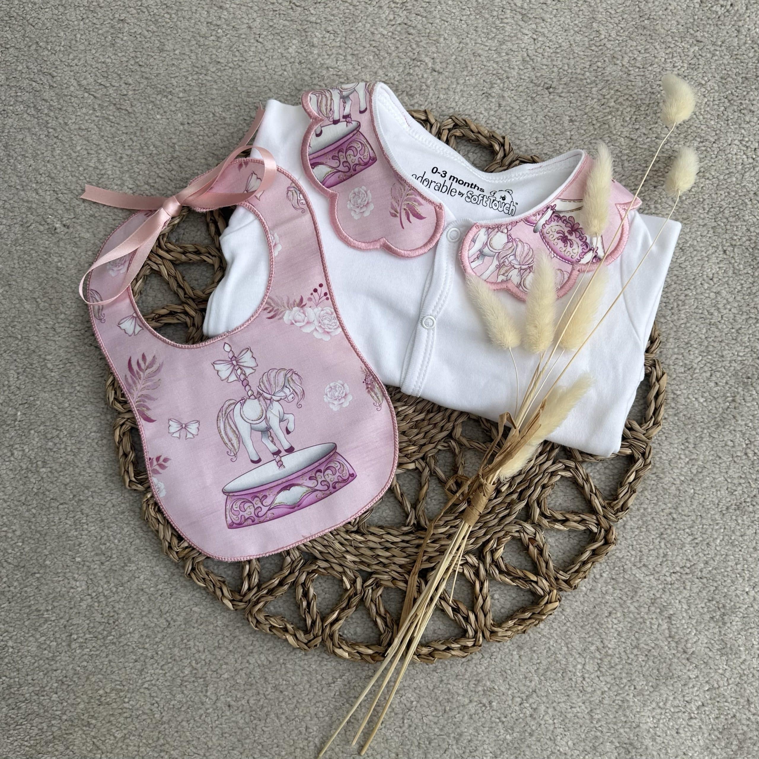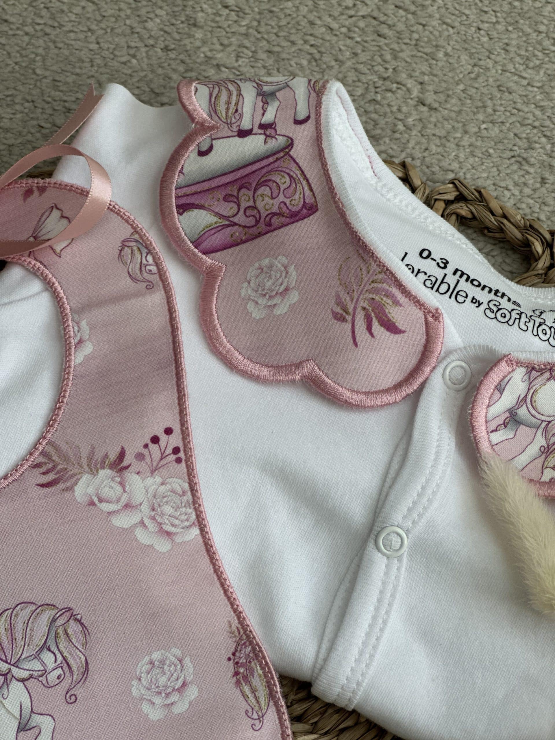 Girls All Pink Carousel Handmade Sleepsuit And Bib
