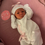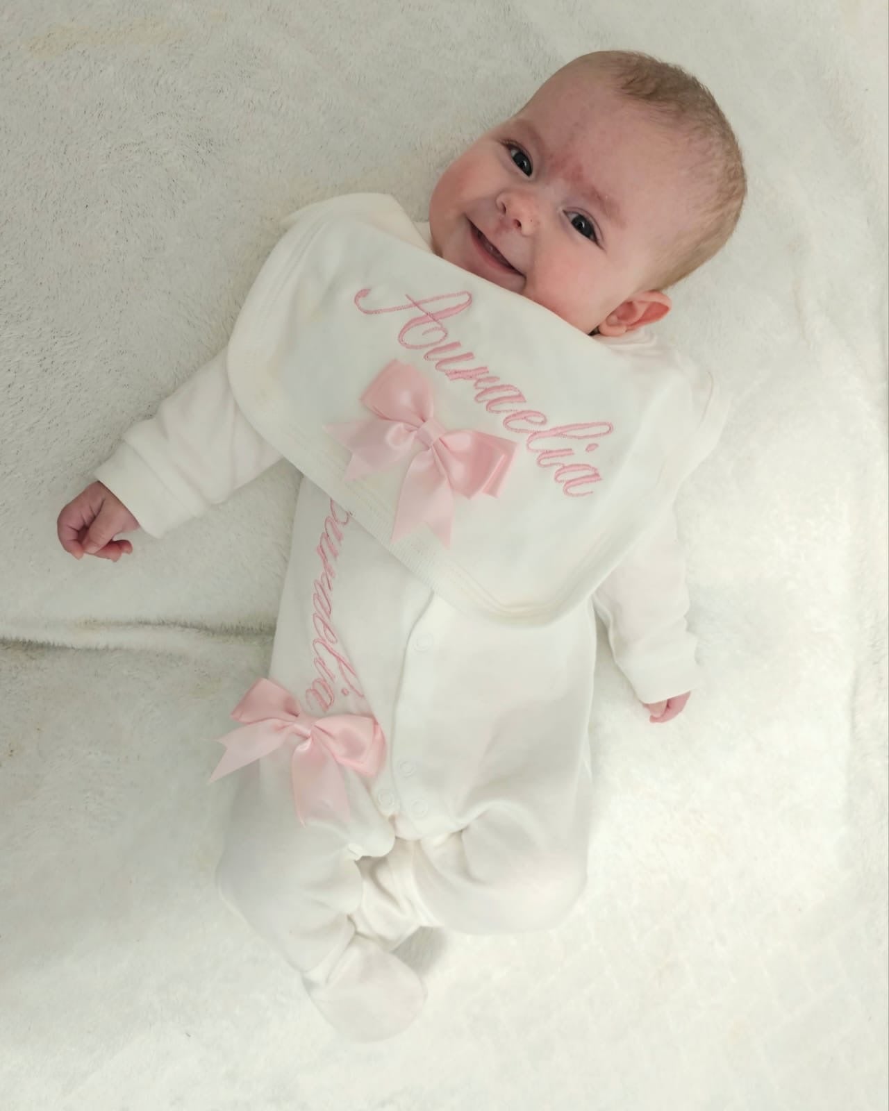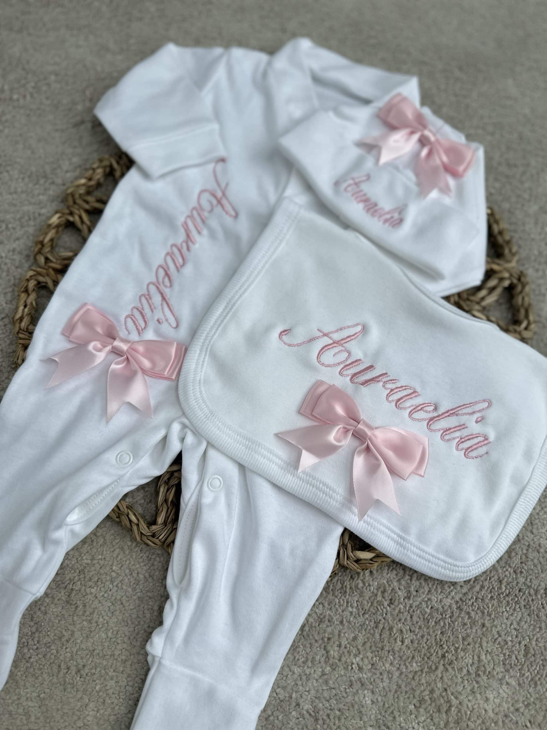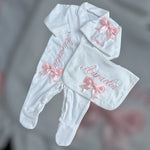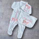Sleepsuit, hat and bib is 100% cotton with stain bows and embroidery. Available in Pink, Beige, mint green bows also velvet pink,green black and red bows.