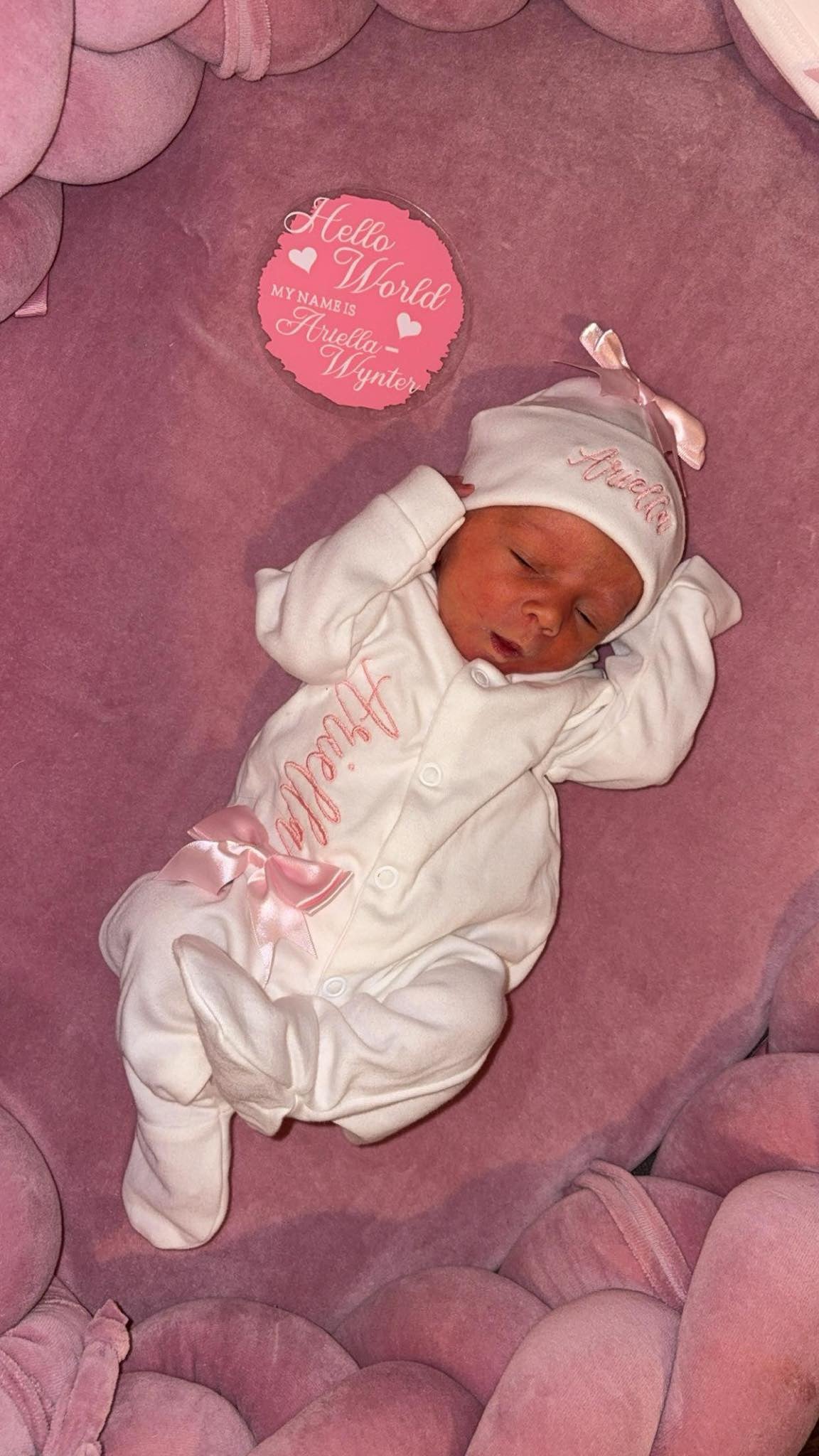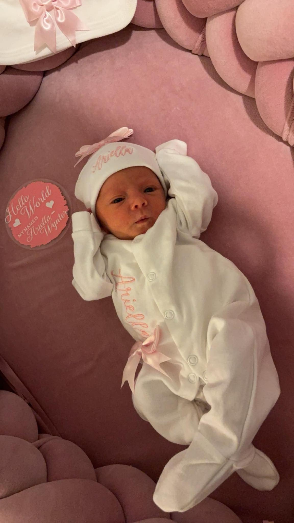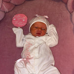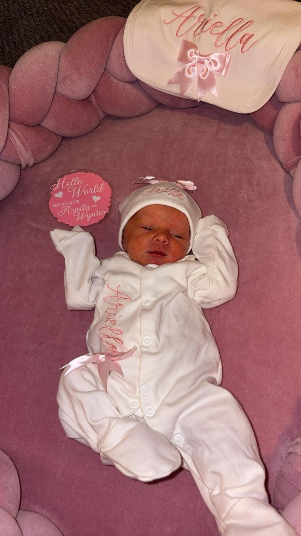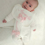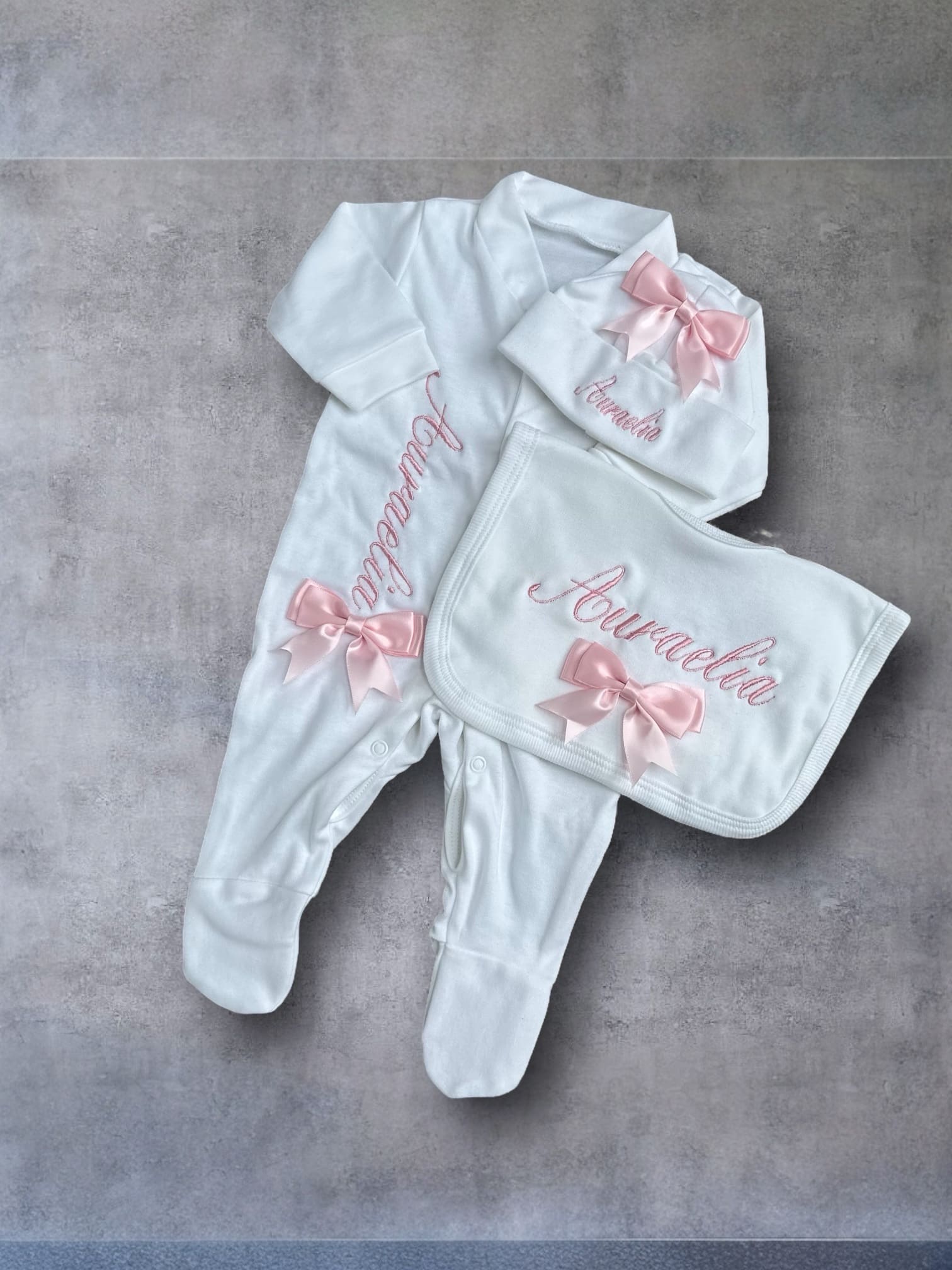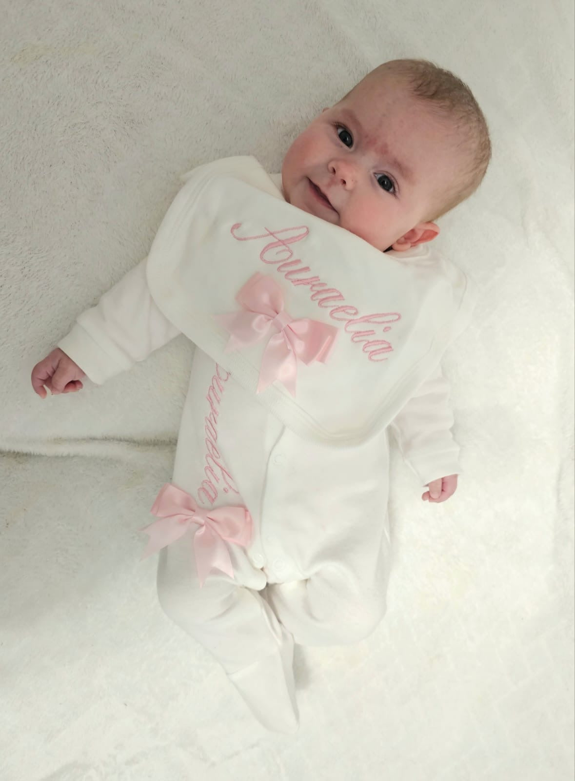 Girls beautiful personalised sleepsuit set with match beanie hat and bib.