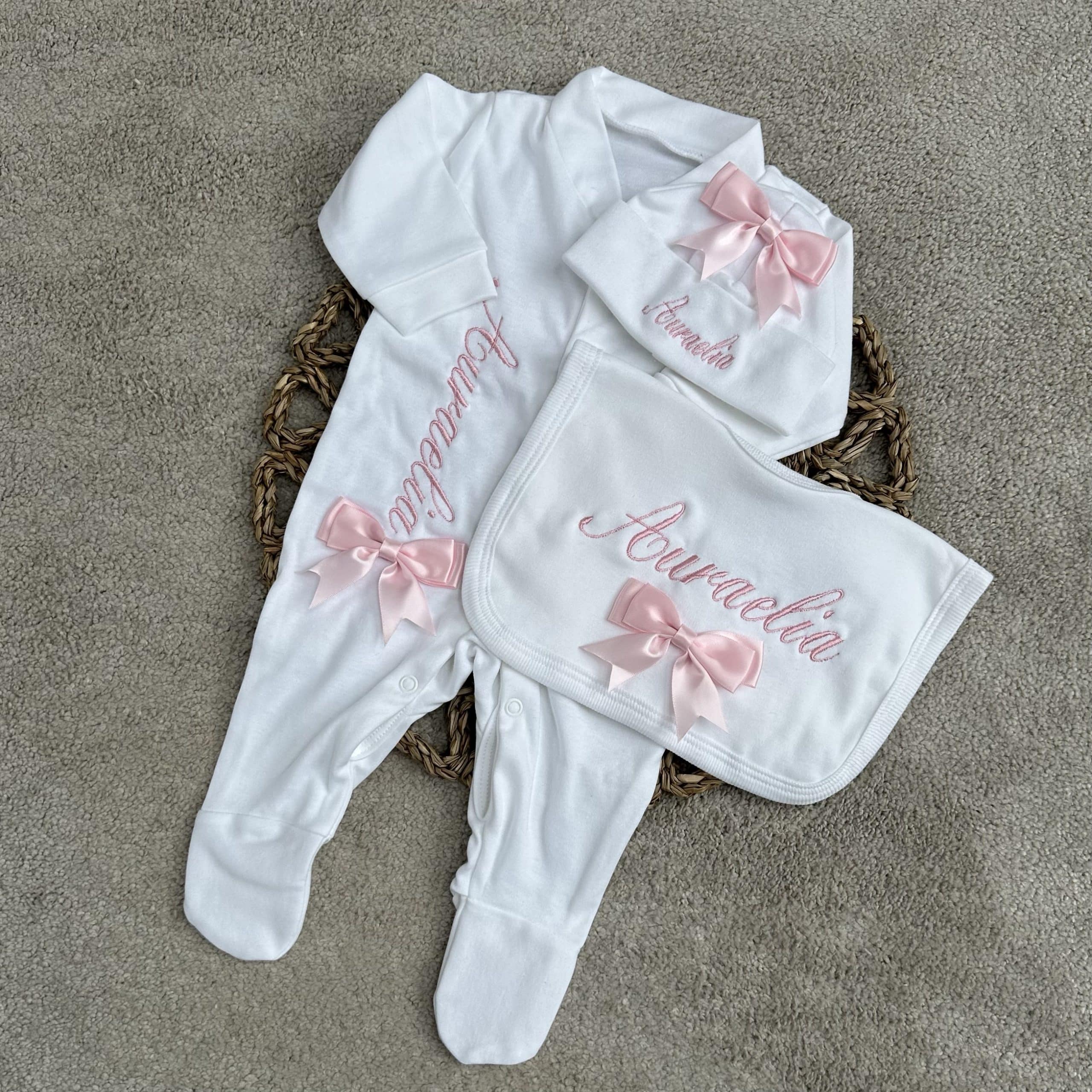 Girls beautiful personalised sleepsuit set with match beanie hat and bib.