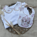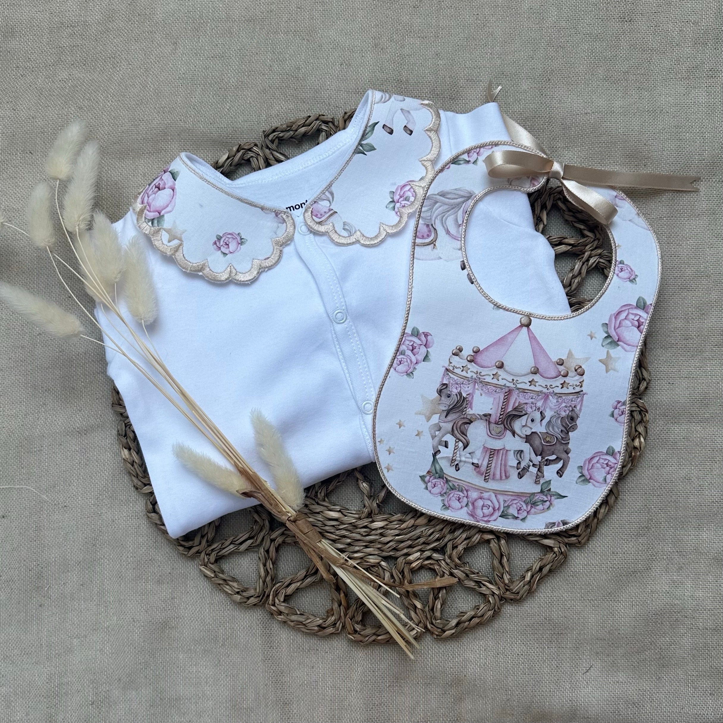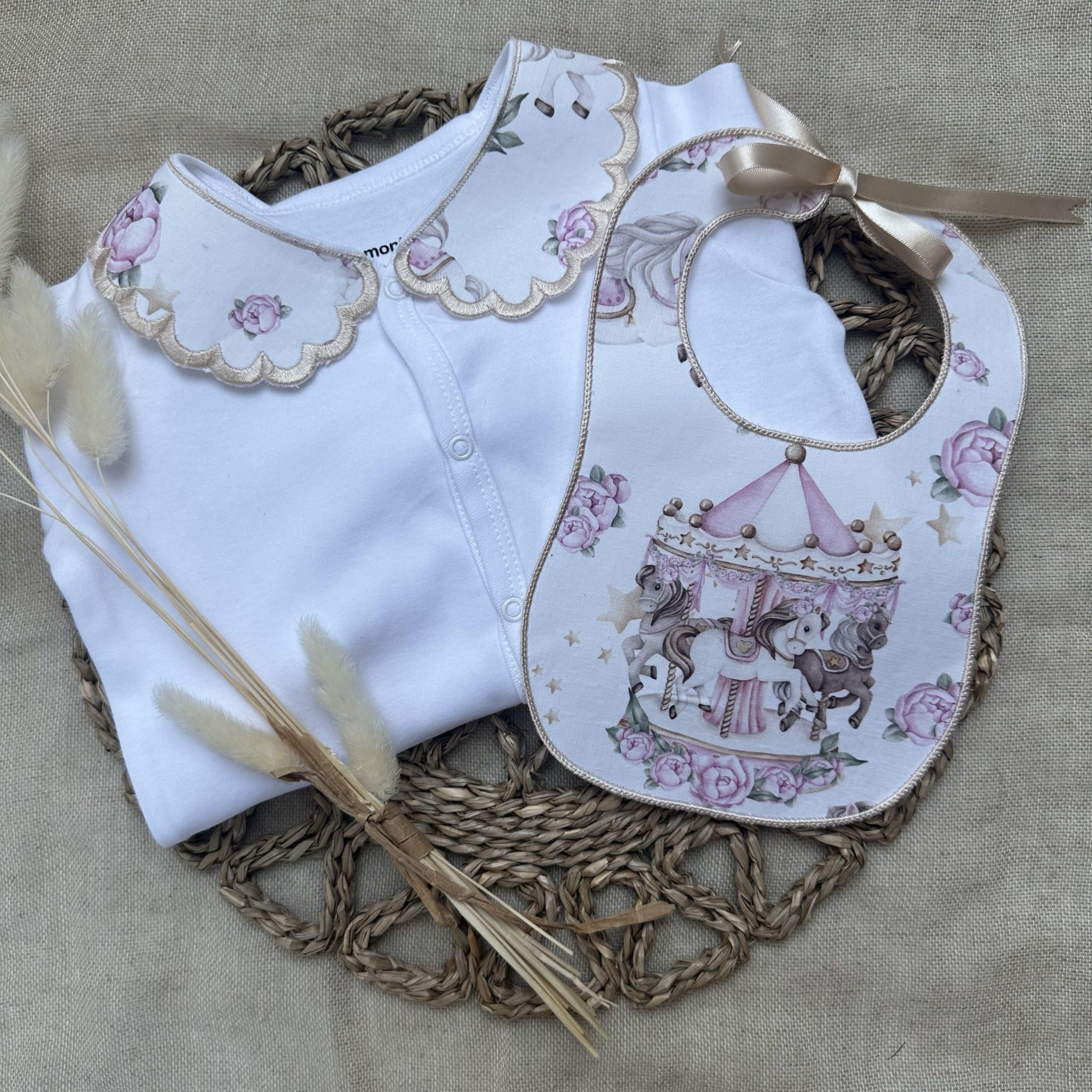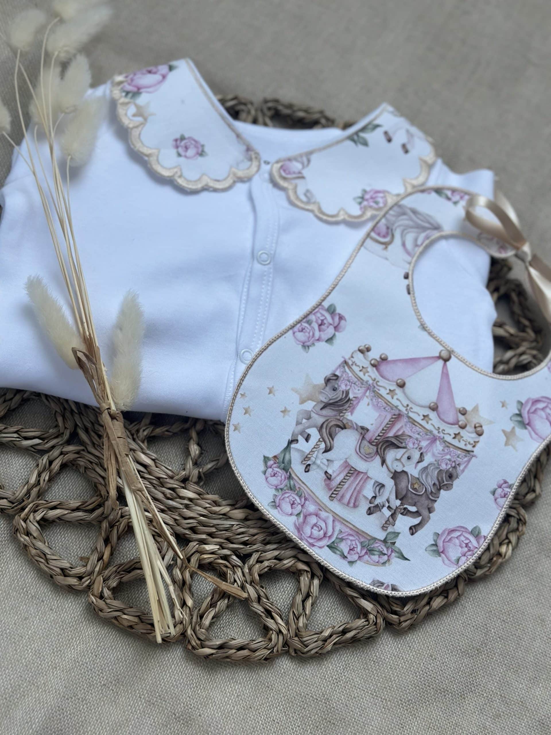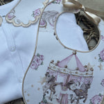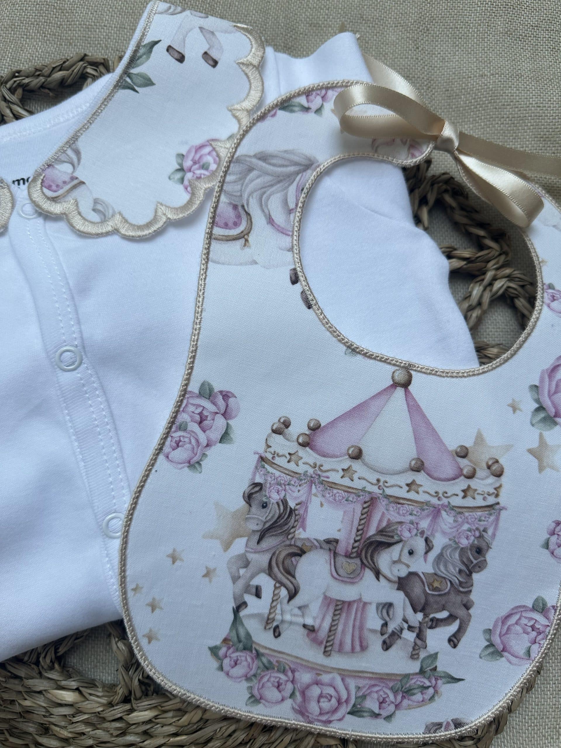 Perfect Little Thing Girls Beige Carousel Handmade Sleepsuit And Bib